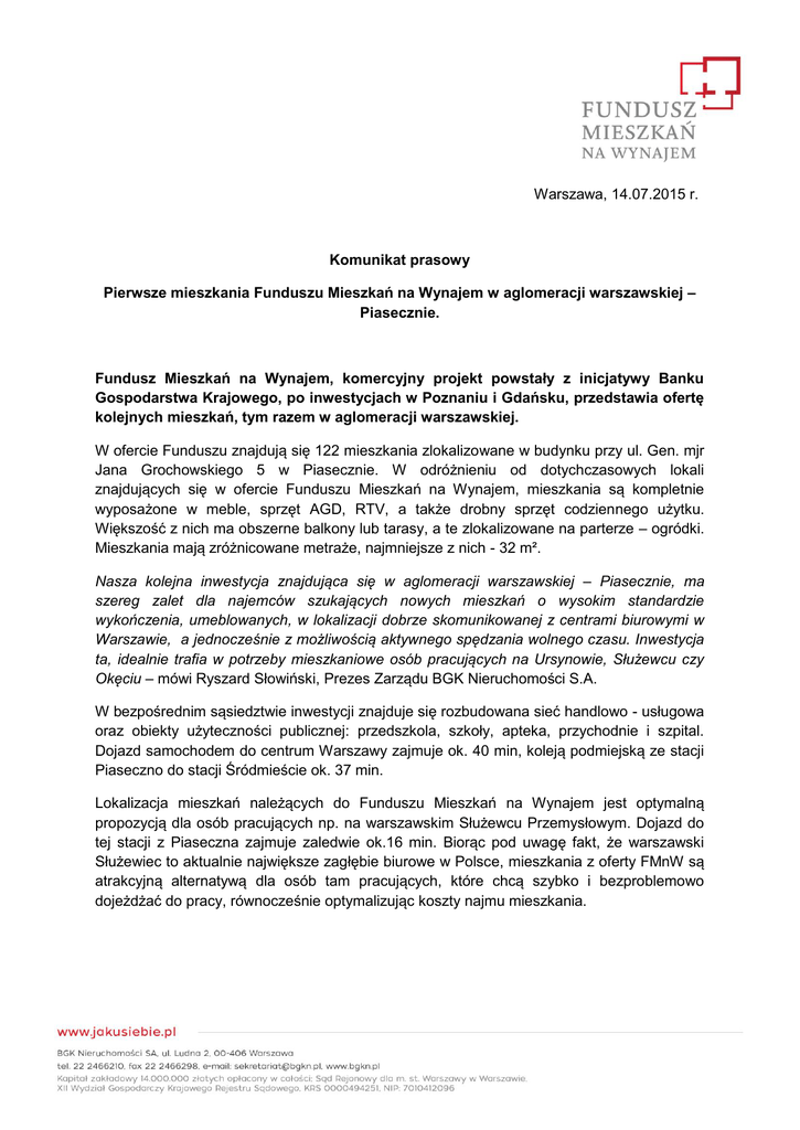Warszawa, 14.07.2015 r. Komunikat prasowy Pierwsze mieszkania Funduszu Mieszkań na Wynajem w aglomeracji warszawskiej – Piasecznie. Fundusz Mieszkań na Wynajem, komercyjny projekt powstały z inicjatywy Banku Gospodarstwa Krajowego, po inwestycjach w Poznaniu i Gdańsku, przedstawia ofertę kolejnych mieszkań, tym razem w aglomeracji warszawskiej. W ofercie Funduszu znajdują się 122 mieszkania zlokalizowane w budynku przy ul. Gen. mjr Jana Grochowskiego 5 w Piasecznie. W odróżnieniu od dotychczasowych lokali znajdujących się w ofercie Funduszu Mieszkań na Wynajem, mieszkania są kompletnie wyposażone w meble, sprzęt AGD, RTV, a także drobny sprzęt codziennego użytku. Większość z nich ma obszerne balkony lub tarasy, a te zlokalizowane na parterze – ogródki. Mieszkania mają zróżnicowane metraże, najmniejsze z nich - 32 m². Nasza kolejna inwestycja znajdująca się w aglomeracji warszawskiej – Piasecznie, ma szereg zalet dla najemców szukających nowych mieszkań o wysokim standardzie wykończenia, umeblowanych, w lokalizacji dobrze skomunikowanej z centrami biurowymi w Warszawie, a jednocześnie z możliwością aktywnego spędzania wolnego czasu. Inwestycja ta, idealnie trafia w potrzeby mieszkaniowe osób pracujących na Ursynowie, Służewcu czy Okęciu – mówi Ryszard Słowiński, Prezes Zarządu BGK Nieruchomości S.A. W bezpośrednim sąsiedztwie inwestycji znajduje się rozbudowana sieć handlowo - usługowa oraz obiekty użyteczności publicznej: przedszkola, szkoły, apteka, przychodnie i szpital. Dojazd samochodem do centrum Warszawy zajmuje ok. 40 min, koleją podmiejską ze stacji Piaseczno do stacji Śródmieście ok. 37 min. Lokalizacja mieszkań należących do Funduszu Mieszkań na Wynajem jest optymalną propozycją dla osób pracujących np. na warszawskim Służewcu Przemysłowym. Dojazd do tej stacji z Piaseczna zajmuje zaledwie ok.16 min. Biorąc pod uwagę fakt, że warszawski Służewiec to aktualnie największe zagłębie biurowe w Polsce, mieszkania z oferty FMnW są atrakcyjną alternatywą dla osób tam pracujących, które chcą szybko i bezproblemowo dojeżdżać do pracy, równocześnie optymalizując koszty najmu mieszkania. Fundusz Mieszkań na Wynajem jest w trakcie przygotowywania kolejnych inwestycji, które dotyczą nieruchomości z terminem udostępnienia mieszkań najemcom w latach 2016-2017. W chwili obecnej zakontraktowano już inwestycje zlokalizowane w Gdańsku Wrzeszczu, Warszawie – w dzielnicach Bielany i Żoliborz, następne w Krakowie, Wrocławiu, Poznaniu i Katowicach. Łącznie jest to ponad 1000 mieszkań. Poza wyżej wymienionymi inwestycjami, kilka kolejnych projektów w Warszawie uzyskało pozytywną opinię naszego komitetu doradczego i jest w trakcie procedur inwestycyjnych. Z uwagi na ponad 18. miesięczny cykl inwestycyjny pojedynczego projektu, kolejne mieszkania w samej stolicy będą udostępniane najemcom w 2016 i 2017 roku. W budynku w Piasecznie, który spełniał nasze kryteria inwestycyjne, mieszkania można wynajmować już od 14 lipca br. Czynsze które zaproponowaliśmy, są relatywnie niższe od czynszów mieszkań o podobnym standardzie wynajmowanych w samej Warszawie – mówi Ryszard Słowiński. Aby zostać najemcą jednego z lokali oferowanych przez Fundusz Mieszkań na Wynajem wystarczy przejść pomyślnie weryfikację finansową i spełnić wymogi związane z najmem okazjonalnym. Jeśli kilka osób deklaruje chęć wspólnego mieszkania, weryfikacja finansowa ich zdolności do płacenia czynszu sprawdzana jest razem (dochody są sumowane). Mieszkania rezerwowane są według kolejności zgłoszeń. Nowością w ofercie FMnW jest propozycja wynajmu dla firm, dostępna od sierpnia 2015 r. Więcej informacji o zasadach wynajmu mieszkań oraz pełna oferta cenowa dostępnych obecnie mieszkań do wynajęcia dostępna jest na stronie internetowej: www.jakusiebie.pl. Dodatkowych informacji udziela również Centrum Obsługi Klienta pod numerami telefonu: 801 800 388 lub 22 468 84 60. Fundusz Mieszkań na Wynajem jest komercyjnym projektem Banku Gospodarstwa Krajowego. To nowatorskie na polskim rynku przedsięwzięcie najmu instytucjonalnego, mające na celu zwiększenie udziału w rynku mieszkań na wynajem oraz poprawienie mobilności Polaków. Inicjatywa ta realizowana jest całkowicie na zasadach rynkowych w oparciu o ustawę o funduszach inwestycyjnych. BGK powołał dwie spółki: BGK Nieruchomości oraz TFI BGK w celu realizacji zamierzeń tego projektu. Obecnie BGK Nieruchomości S.A. pracuje nad kolejnymi projektami dotyczącymi zakupu nieruchomości zlokalizowanych w największych aglomeracjach: warszawskiej, trójmiejskiej, krakowskiej, wrocławskiej, łódzkiej, poznańskiej i śląskiej.