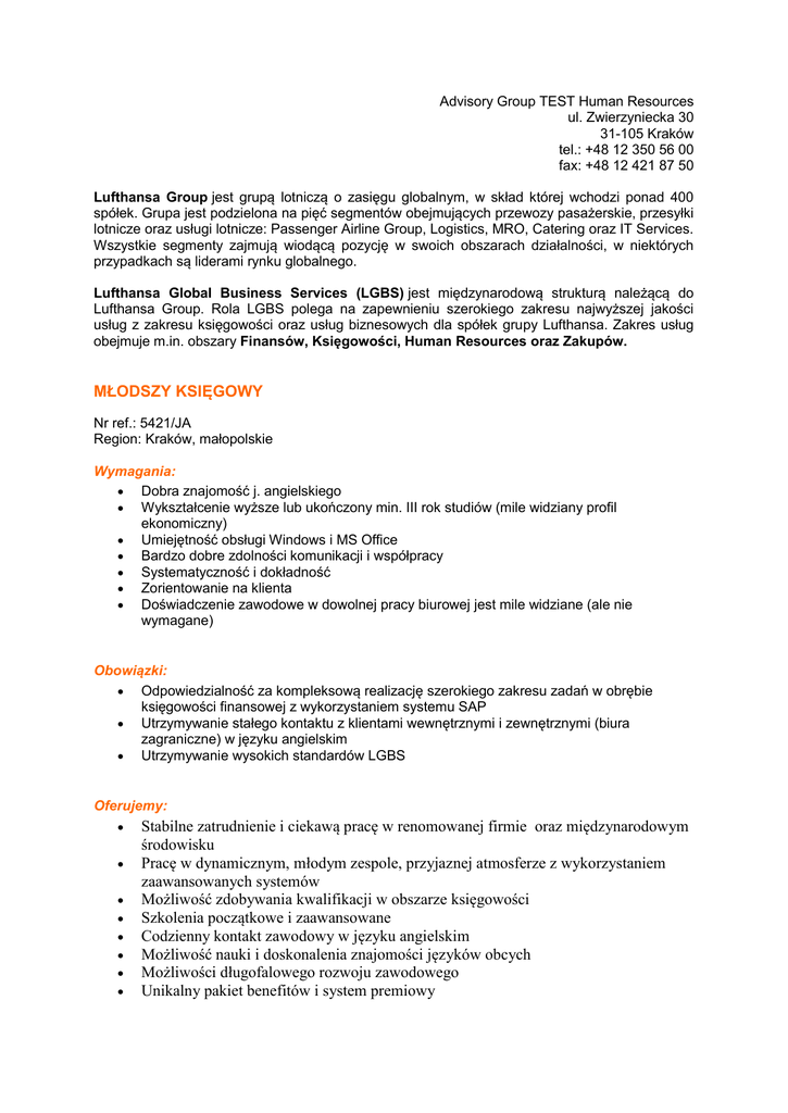 Advisory Group TEST Human Resources ul. Zwierzyniecka 30 31-105 Kraków tel.: +48 12 350 56 00 fax: +48 12 421 87 50 Lufthansa Group jest grupą lotniczą o zasięgu globalnym, w skład której wchodzi ponad 400 spółek. Grupa jest podzielona na pięć segmentów obejmujących przewozy pasażerskie, przesyłki lotnicze oraz usługi lotnicze: Passenger Airline Group, Logistics, MRO, Catering oraz IT Services. Wszystkie segmenty zajmują wiodącą pozycję w swoich obszarach działalności, w niektórych przypadkach są liderami rynku globalnego. Lufthansa Global Business Services (LGBS) jest międzynarodową strukturą należącą do Lufthansa Group. Rola LGBS polega na zapewnieniu szerokiego zakresu najwyższej jakości usług z zakresu księgowości oraz usług biznesowych dla spółek grupy Lufthansa. Zakres usług obejmuje m.in. obszary Finansów, Księgowości, Human Resources oraz Zakupów. MŁODSZY KSIĘGOWY Nr ref.: 5421/JA Region: Kraków, małopolskie Wymagania:  Dobra znajomość j. angielskiego  Wykształcenie wyższe lub ukończony min. III rok studiów (mile widziany profil ekonomiczny)  Umiejętność obsługi Windows i MS Office  Bardzo dobre zdolności komunikacji i współpracy  Systematyczność i dokładność  Zorientowanie na klienta  Doświadczenie zawodowe w dowolnej pracy biurowej jest mile widziane (ale nie wymagane) Obowiązki:  Odpowiedzialność za kompleksową realizację szerokiego zakresu zadań w obrębie księgowości finansowej z wykorzystaniem systemu SAP  Utrzymywanie stałego kontaktu z klientami wewnętrznymi i zewnętrznymi (biura zagraniczne) w języku angielskim  Utrzymywanie wysokich standardów LGBS Oferujemy:         Stabilne zatrudnienie i ciekawą pracę w renomowanej firmie oraz międzynarodowym środowisku Pracę w dynamicznym, młodym zespole, przyjaznej atmosferze z wykorzystaniem zaawansowanych systemów Możliwość zdobywania kwalifikacji w obszarze księgowości Szkolenia początkowe i zaawansowane Codzienny kontakt zawodowy w języku angielskim Możliwość nauki i doskonalenia znajomości języków obcych Możliwości długofalowego rozwoju zawodowego Unikalny pakiet benefitów i system premiowy    Elastyczny, dzienny czas pracy sprzyjający zachowaniu równowagi między życiem zawodowym i prywatnym Warunki i organizację pracy przyjazną dla matek – wyróżnienie w plebiscycie „Firma Przyjazna Matce” Biuro dostosowane do potrzeb osób niepełnosprawnych Aplikuj na to stanowisko poprzez: https://www.testhr.pl/pl/mlodszy-ksiegowy,2726-ja-t,show,joboffer.html