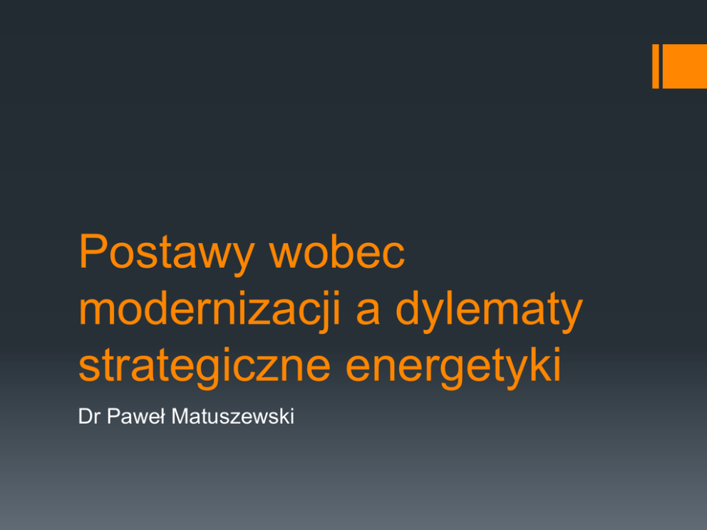 Postawy wobec modernizacji a dylematy strategiczne energetyki Dr Paweł Matuszewski Kierunek dla energetyki Czy uważa Pan(i), że obecnie należy skoncentrować się na rozwoju: P. promodernizacyjna 5% P. altermodernizacyjna 4% P. kontestacji modernizacji 5% P. anomii 6% 52% 50% 52% 47% Nieodnawialnych źródeł energii Odnawialnych źródeł energii Obu tych gałęzi w równym stopniu Trudno powiedzieć 40% 45% 34% 32% 3% 2% 9% 15% Kierunek dla energetyki W ciągu 14 lat (do roku 2030) konieczne jest oparcie polskiej elektroenergetyki o węgiel kamienny i węgiel brunatny, gdyż Polska posiada duże zasoby tych surowców P. promodernizacyjna 58% P. altermodernizacyjna 70% P. kontestacji modernizacji 70% P. anomii 59% Poparcie Kierunek dla energetyki W ciągu 14 lat (do roku 2030) konieczne jest uruchomienie produkcji energii elektrycznej w elektrowniach jądrowych, co pozwoli na zmniejszenie emisji dwutlenku węgla oraz na zwiększenie ilości czystej energii elektrycznej P. promodernizacyjna 66% P. altermodernizacyjna P. kontestacji modernizacji P. anomii 57% 37% 45% Poparcie Kierunek dla energetyki W ciągu 14 lat (do roku 2030) konieczny jest znaczący wzrost produkcji energii elektrycznej z odnawialnych źródeł energii (OZE), co pozwoli na podwyższenie standardów czystego środowiska naturalnego w Polsce P. promodernizacyjna 93% P. altermodernizacyjna 93% P. kontestacji modernizacji 79% P. anomii 84% Poparcie Kierunek dla energetyki Hierarchia preferencji Postawa promodernizacyjna OZE (93%) > p. jądrowe (66%) > węgiel k. i b. (58%) Postawa altermodernizacyjna OZE (93%) > węgiel k. i b. (70%) > p. jądrowe (57%) Postawa kontestacji modernizacji OZE (79%) > węgiel k. i b. (70%) > p. jądrowe (37%) Postawa anomii OZE (84%) > węgiel k. i b. (59%) > p. jądrowe (45%) Węgiel kamienny i brunatny jako źródło energii Odsetek odpowiedzi pozytywnych 48 P. promodernizacyjna 24 58 P. altermodernizacyjna 33 54 P. kontestacji modernizacji 28 49 P. anomii 28 0 Bezpieczeństwo 20 40 60 Perspektywiczność 80 100 Paliwo jądrowe jako źródło energii Odsetek odpowiedzi pozytywnych 37 P. promodernizacyjna 69 25 P. altermodernizacyjna 52 P. kontestacji modernizacji 16 P. anomii 16 45 38 0 Bezpieczeństwo 20 40 60 Perspektywiczność 80 100 OZE jako źródło energii Odsetek odpowiedzi pozytywnych P. promodernizacyjna 91 91 P. altermodernizacyjna 90 83 82 81 P. kontestacji modernizacji 80 P. anomii 72 0 Bezpieczeństwo 20 40 60 Perspektywiczność 80 100 Postawy prośrodowiskowe Odsetek odpowiedzi pozytywnych P. promodernizacyjna 61 P. altermodernizacyjna 65 40 P. kontestacji modernizacji 41 0 77 82 64 45 P. anomii 90 71 58 76 50 Uważa, że osobiście i przez sposób życia ma wpływ na stan środowiska naturalnego Ważne, z jakiego źródła pochodzi energia elektryczna Skłonni płacić więcej za energię z OZE 100 Kierunki dla energetyki Kto popiera rozwój energetyki opartej na węglu? Uważają węgiel za bezpieczny Uważają węgiel za perspektywiczny Uważają paliwo jądrowe za niebezpieczne Trudno im ocenić OZE pod względem bezpieczeństwa Uważa, że należy rozwijać OZE do 2030 Nie mają znaczenia przekonania nt. środowiska Kierunki dla energetyki Kto popiera rozwój energetyki jądrowej? Uważają węgiel za niebezpieczny Uważają paliwo jądrowe za bezpieczne lub odpowiadają trudno powiedzieć Uważają paliwo jądrowe za perspektywiczne lub odpowiadają trudno powiedzieć Uważają OZE za perspektywiczne lub nie mają zdania na ten temat Zetknęli się z dyskusjami na tematy energetyczno-klimatyczne i uważają, że były interesujące Uważają, że do 2030 energetyka nie powinna opierać się na węglu Są skłonni płacić więcej za energię z OZE Nie mają znaczenia pozostałe przekonania nt. środowiska Kierunki dla energetyki Kto popiera rozwój OZE? Uważają OZE za bezpieczne i perspektywiczne Skłonni płacić więcej za energię z OZE Uważają, że jest ważne, z jakiego źródła pochodzi energia Uważają, że osobiście wpływają na stan środowiska Uważają, że do 2030 należy oprzeć polską energetykę na elektrowniach jądrowych Dziękuję za uwagę! [email protected]