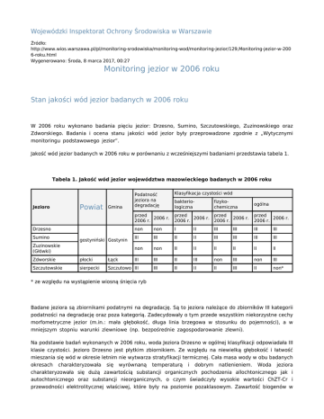 Wojewódzki Inspektorat Ochrony Środowiska w Warszawie Źródło: http://www.wios.warszawa.pl/pl/monitoring-srodowiska/monitoring-wod/monitoring-jezior/129,Monitoring-jezior-w-200 6-roku.html Wygenerowano: Środa, 8 marca 2017, 00:27 Monitoring jezior w 2006 roku Stan jakości wód jezior badanych w 2006 roku W 2006 roku wykonano badania pięciu jezior: Drzesno, Sumino, Szczutowskiego, Zuzinowskiego oraz Zdworskiego. Badania i ocena stanu jakości wód jezior były przeprowadzone zgodnie z „Wytycznymi monitoringu podstawowego jezior”. Jakość wód jezior badanych w 2006 roku w porównaniu z wcześniejszymi badaniami przedstawia tabela 1. Tabela 1. Jakość wód jezior województwa mazowieckiego badanych w 2006 roku Jezioro Powiat Gmina Drzesno Sumino gostyniński Gostynin Zuzinowskie (Główki) Podatność jeziora na degradację Klasyfikacja czystości wód przed 2006 r. 2006 r. przed przed 2006 r. 2006 r. 2006 r. 2006 r. przed 2006 r. 2006 r. non non I II III III III III III III II II III III III III non non II II II II II II bakteriologiczna fizykochemiczna ogólna Zdworskie płocki Łąck III III II III non III non III Szczutowskie sierpecki Szczutowo III III II II II III II non* * ze względu na wystąpienie wiosną śnięcia ryb Badane jeziora są zbiornikami podatnymi na degradację. Są to jeziora należące do zbiorników III kategorii podatności na degradację oraz poza kategorią. Zadecydowały o tym przede wszystkim niekorzystne cechy morfometryczne jezior (m.in.: mała głębokość, długa linia brzegowa w stosunku do pojemności), a w mniejszym stopniu warunki zlewniowe (np. bezpośrednie zagospodarowanie zlewni). Na podstawie badań wykonanych w 2006 roku, woda Jeziora Drzesno w ogólnej klasyfikacji odpowiadała III klasie czystości. Jezioro Drzesno jest płytkim zbiornikiem. Ze względu na niewielką głębokość i łatwość mieszania się wód w okresie letnim nie wytwarza stratyfikacji termicznej. Cała masa wody w obu badanych okresach charakteryzowała się wyrównaną temperaturą i dobrym natlenieniem. Woda jeziora charakteryzowała się dużą zawartością substancji organicznych pochodzenia allochtonicznego jak i autochtonicznego oraz substancji nieorganicznych, o czym świadczyły wysokie wartości ChZT-Cr i przewodności elektrolitycznej właściwej, które były na poziomie pozaklasowym. Zawartość biogenów w wodzie była zróżnicowana. Wartości stężeń azotu mineralnego i całkowitego były na poziomie pozaklasowym, natomiast wartości stężeń form fosforu utrzymywały się na poziomie I - II klasy czystości. Średnia zawartość chlorofilu „a” była na poziomie I klasy czystości, natomiast suchej masy sestonu III klasy czystości. Przezroczystość wody wynosiła tylko 0,9 m. W 2006 roku zanotowano pogorszenie warunków sanitarnych, sanitarnie woda odpowiadała II klasie czystości. W porównaniu do wcześniejszych badań, w ogólnej klasyfikacji jakość wody pod względem fizykochemicznym uległa nieznacznej poprawie, ale w sumarycznej ocenie pozostała na tym samym poziomie. Stan jakości wody Jeziora Sumino w 2006 roku odpowiadał III klasie czystości. Jezioro jest płytkim zbiornikiem, w związku z tym w okresie letnim nie wytwarza typowej stratyfikacji. W okresie wiosennym woda charakteryzowała się w miarę wyrównaną temperaturą i dobrym natlenieniem. Wiosną i latem na stanowisku 01 w wodzie zaznaczył się spadek zawartości tlenu (latem do śladowych ilości). Woda jeziora była obciążona substancjami organicznymi oraz nieorganicznymi. Świadczyły o tym wysokie wartości stężeń ChZT-Cr na poziomie III klasy czystości oraz przewodności elektrolitycznej właściwej na poziomie pozaklasowym. Zanotowano wysokie wartości stężeń azotu mineralnego i azotu całkowitego, na poziomie III klasy czystości. Chlorofil „a”, wskaźnik produkcji pierwotnej zbiornika, był na poziomie pozaklasowym. Sanitarnie woda odpowiadała II klasie czystości. W porównaniu do wcześniejszych badań, w 2006 roku właściwości fizykochemiczne wody uległy nieznacznemu pogorszeniu, ale w sumarycznej ocenie jakość wody pozostała na tym samym poziomie. W 2006 roku stan jakości wody w Jeziorze Zuzinowskim odpowiadał II klasie czystości. Jezioro Zuzinowskie jest płytkim zbiornikiem, co sprzyja łatwemu mieszaniu się wód. Z tego względu w okresie letnim nie wytwarza stratyfikacji termicznej. Praktycznie cała masa wody znajdowała się w zasięgu ciepłego epilimnionu. W obu okresach badawczych woda była dobrze natleniona, ale latem nad dnem zanotowano śladowe ilości tlenu. Woda w jeziorze charakteryzowała się dużą zawartością substancji nieorganicznych oraz organicznych. Świadczyła o tym wysoka wartość przewodności elektrolitycznej właściwej, która była na poziomie pozaklasowym oraz wysokie wartości stężeń ChZT-Cr i BZT5, które odpowiadały wartościom III klasy czystości. Zawartość związków biogennych w wodzie jeziora była niska. Wartości stężeń związków fosforu były na poziomie I klasy czystości, natomiast związków azotu były w granicach II klasy czystości. Produkcja pierwotna w jeziorze była niska i odpowiadała I klasie czystości. Korelowało to z niskimi wartościami stężeń chlorofilu „a” oraz suchej masy sestonu (I i II klasa czystości). Przezroczystość wody, jak na tak płytkie jezioro, była wysoka i wynosiła 2,4 m. Pod względem sanitarnym woda odpowiadała II klasie czystości. W porównaniu do wcześniejszych badań, w 2006 roku jakość wody pod względem fizykochemicznym uległ nieznacznemu pogorszeniu, ale w sumarycznej ocenie pozostała na tym samym poziomie. Stan czystości wody Jeziora Zdworskiego w 2006 roku odpowiadał wodom III klasy czystości. W okresie letnim w jeziorze nie wytwarza się stratyfikacja termiczna. Cała masa wody znajdowała się w zasięgu ciepłego epilimnionu i była dobrze natleniona. Woda jeziora w dalszym ciągu charakteryzowała 