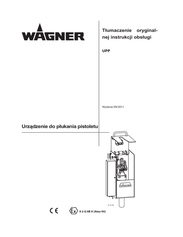 Tłumaczenie oryginalnej instrukcji obsługi UPP Wydanie 09/2011 Urządzenie do płukania pistoletu B_01785 II 2 G IIB X (Atex 95) WYDANIE 09/2011 PSV. NR ZAMÓW. DOC377979 INSTRUKCJA OBSŁUGI Spis treści 1 1.1 1.2 INFORMACJE NA TEMAT INSTRUKCJI OBSŁUGI Języki Ostrzeżenia, wskazówki i symbole zawarte w instrukcji 5 5 5 2 2.1 2.1.1 2.1.2 2.1.3 2.2 2.2.1 2.2.2 2.2.3 2.2.4 2.2.5 2.2.6 2.3 2.4 2.4.1 2.4.2 2.4.3 OGÓLNE INFORMACJE BEZPIECZEŃSTWA Informacje bezpieczeństwa dla użytkownika Osprzęt elektryczny Kwalifikacje personelu Bezpieczne środowisko pracy Informacje bezpieczeństwa dla personelu Bezpieczna eksploatacja natryskiwaczy WAGNER Uziemianie urządzenia Węże materiałowe Czyszczenie Postępowanie z niebezpiecznymi płynami, lakierami i farbami Kontakt z gorącą powierzchnią Zastosowanie zgodne z przeznaczeniem Stosowanie w strefach zagrożonych wybuchem Zastosowanie zgodne z przeznaczeniem Oznaczenie przeciwwybuchowe Maksymalna temperatura powierzchni 6 6 6 6 6 6 7 7 7 8 8 8 8 9 9 9 9 3 3.1 3.2 3.3 GWARANCJA I DEKLARACJE ZGODNOŚCI Odpowiedzialność za produkt Roszczenie z tytułu gwarancji Deklaracja zgodności z normami UE 10 10 10 11 4 4.1 4.2 4.3 4.4 4.5 4.6 OPIS Przeznaczenie, zastosowanie zgodne z przeznaczeniem Zakres dostawy Dane techniczne Budowa urządzenia Obsługa ręczna Opis działania 12 12 12 13 14 15 16 5 5.1 5.2 5.3 5.4 PRZYGOTOWANIE DO URUCHOMIENIA Lokalizacja urządzenia Montaż ścienny Regulacja urządzenia do płukania pistoletu Uziemienie 17 17 17 17 18 6 URUCHAMIANIE I OBSŁUGA 19 7 WYSZUKIWANIE I USUWANIE USTEREK 21 8 8.1 8.2 KONSERWACJA / NAPRAWY Tabela wymiarów podstawowych Dodatkowe wyregulowanie uniwersalnego elementu ustalającego 22 22 24 3 WYDANIE 09/2011 PSV. NR ZAMÓW. DOC377979 INSTRUKCJA OBSŁUGI Spis treści 9 UTYLIZACJA 25 10 OSPRZĘT 26 11 11.1 11.2 11.2.1 11.3 11.3.1 11.4 11.5 11.5.1 11.5.2 11.5.3 11.6 11.6.1 11.7 11.8 11.9 11.10 11.11 11.12 11.13 11.14 11.14 11.15 11.16 11.17 CZĘŚCI ZAMIENNE Zamawianie części zamiennych? Płukanie pistoletu komplet. (puste) Mechanizm spustowy komplet. Płukanie pistoletu komplet. (GM 3000) Element ustalający komplet. uniwersalny Płukanie pistoletu komplet. (GM 2000/ GM 2800) Płukanie pistoletu komplet. (FineSpray 06) Płukanie pistoletu komplet (Wa Colora SP5) Płukania pistoletu komplet (DeVilbiss Compact) Płukania pistoletu komplet (DeVilbiss Advance HD) Płukanie pistoletu komplet. (FineSpray 09) Płukanie pistoletu komplet. (IWATA W200) Płukanie pistoletu komplet. (FineSpray 03) Płukanie pistoletu komplet. (AG09, G08, G12, G15) Płukanie pistoletu komplet. (G14, G17) Płukanie pistoletu komplet. (SATA JET K3) Płukanie pistoletu komplet. (Graco PRO Xs) Płukanie pistoletu komplet. IWATA W77 Płukanie pistoletu komplet. GM 4600AC/ GM 4700AC/ GM 4100AC Płukanie pistoletu komplet GM 4600AC/ GM 4700AC dyszy natryskowej Płukanie pistoletu komplet. ASAHI HB2020 Płukanie pistoletu komplet. Walther Pilot XIII Obsługa ręczna Ręczna obsługa za pomocą timera 29 29 30 32 34 36 38 40 40 40 41 42 42 43 44 46 48 50 52 54 56 58 59 60 61 12 12.1 12.2 12.3 12.4 12.5 SCHEMATY PNEUMATYCZNE Schemat pneumatyczny UPP i Intellimix 3 Schemat pneumatyczny UPP i FlexControl Schemat pneumatyczny UPP i funkcji uruchamiania ręcznego Schemat pneumatyczny UPP i funkcji urucham. ręczn. za pomocą timera Schemat pneumatyczny UPP i TwinControl Typ 1 i 2 63 63 64 65 66 67 4 WYDANIE 09/2011 PSV. NR ZAMÓW. DOC377979 INSTRUKCJA OBSŁUGI 1 INFORMACJE NA TEMAT INSTRUKCJI OBSŁUGI Instrukcja obsługi zawiera informacje w zakresie obsługi, naprawy i konserwacji urządzenia. Urządzenie stosować tylko zgodnie z instrukcją. Eksploatacja urządzenia w sposób niezgodny z zaleceniami instrukcji obsługi może być niebezpieczna. Przestrzeganie niniejszej instrukcji stanowi integralną część gwarancji. 1.1 JĘZYKI Instrukcja obsługi jest dostępna w poniższych wersjach językowych: Języki: Nr zamów. Języki: Nr zamów. Niemiecki 377970 Angielski 377971 Francuski 377972 Niderlandzki 377973 Włoski 377974 Hiszpański 377975 Duński 377977 Szwedzki 377976 Portugalski 377978 Polski 377979 1.2 OSTRZEŻENIA, WSKAZÓWKI I SYMBOLE ZAWARTE W INSTRUKCJI Komunikaty ostrzegawcze zawarte w instrukcji oznaczają wyjątkowe zagrożenie dla użytkownika i urządzenia oraz podają środki zaradcze. Komunikaty ostrzegawcze dzielą się na: ZAGROŻENIE Ostrzeżenie przed niebezpieczeństwem! Możliwe skutki nieprzestrzegania ostrzeżeń. Słowo sygnałowe określa stopień zagrożenia. Niebezpieczeństwo – bezpośrednie zagrożenie. Nieprzestrzeganie spowoduje śmierć, poważne obrażenia ciała i znaczne szkody materialne. SIHI_0100_POL Przeciwdziałanie zagrożeniom i ich skutkom. OSTRZEŻENIE Ostrzeżenie – możliwe zagrożenie. Nieprzestrzeganie może spowodować śmierć, poważne obrażenia ciała i znaczne szkody materialne. Ostrzeżenie przed niebezpieczeństwem! Możliwe skutki nieprzestrzegania ostrzeżeń. sygnałowe określa stopień zagrożenia. SIHI_0103_POL Słowo Przeciwdziałanie zagrożeniom i ich skutkom. OSTROŻNIE Ostrożnie – możliwa sytuacja niebezpieczna. Nieprzestrzeganie może spowodować lekkie obrażenia ciała. Ostrzeżenie przed niebezpieczeństwem! Możliwe skutki nieprzestrzegania ostrzeżeń. sygnałowe określa stopień zagrożenia. Słowo Przeciwdziałanie zagrożeniom i ich skutkom. SIHI_0101_POL Ostrożnie – możliwa sytuacja niebezpieczna. Nieprzestrzeganie może spowodować szkody materialne. SIHI_0102_POL OSTROŻNIE Ostrzeżenie przed niebezpieczeństwem! Możliwe skutki nieprzestrzegania ostrzeżeń. Słowo sygnałowe określa stopień zagrożenia. Przeciwdziałanie zagrożeniom i ich skutkom. Wskazówka – zawiera informacje na temat specyfiki i sposobów postępowania. 5 WYDANIE 09/2011 NR ZAMÓW. DOC377979 PSV. INSTRUKCJA OBSŁUGI 2 OGÓLNE INFORMACJE BEZPIECZEŃSTWA 2.1 INFORMACJE BEZPIECZEŃSTWA DLA UŻYTKOWNIKA Instrukcja musi być zawsze dostępna w miejscu stosowan