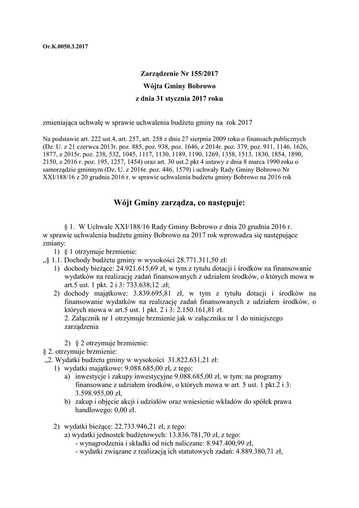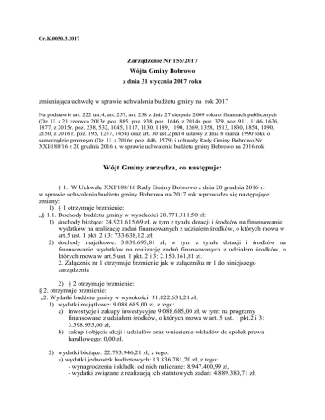 Or.K.0050.3.2017 Zarządzenie Nr 155/2017 Wójta Gminy Bobrowo z dnia 31 stycznia 2017 roku zmieniająca uchwałę w sprawie uchwalenia budżetu gminy na rok 2017 Na podstawie art. 222 ust.4, art. 257, art. 258 z dnia 27 sierpnia 2009 roku o finansach publicznych (Dz. U. z 21 czerwca 2013r. poz. 885, poz. 938, poz. 1646, z 2014r. poz. 379, poz. 911, 1146, 1626, 1877, z 2015r. poz. 238, 532, 1045, 1117, 1130, 1189, 1190, 1269, 1358, 1513, 1830, 1854, 1890, 2150, z 2016 r. poz. 195, 1257, 1454) oraz art. 30 ust.2 pkt 4 ustawy z dnia 8 marca 1990 roku o samorządzie gminnym (Dz. U. z 2016r. poz. 446, 1579) i uchwały Rady Gminy Bobrowo Nr XXI/188/16 z 20 grudnia 2016 r. w sprawie uchwalenia budżetu gminy Bobrowo na 2016 rok Wójt Gminy zarządza, co następuje: § 1. W Uchwale XXI/188/16 Rady Gminy Bobrowo z dnia 20 grudnia 2016 r. w sprawie uchwalenia budżetu gminy Bobrowo na 2017 rok wprowadza się następujące zmiany: 1) § 1 otrzymuje brzmienie: „§ 1.1. Dochody budżetu gminy w wysokości 28.771.311,50 zł: 1) dochody bieżące: 24.921.615,69 zł, w tym z tytułu dotacji i środków na finansowanie wydatków na realizację zadań finansowanych z udziałem środków, o których mowa w art.5 ust. 1 pkt. 2 i 3: 733.638,12 .zł; 2) dochody majątkowe: 3.839.695,81 zł, w tym z tytułu dotacji i środków na finansowanie wydatków na realizację zadań finansowanych z udziałem środków, o których mowa w art.5 ust. 1 pkt. 2 i 3: 2.150.161,81 zł. 2. Załącznik nr 1 otrzymuje brzmienie jak w załączniku nr 1 do niniejszego zarządzenia 2) § 2 otrzymuje brzmienie: § 2. otrzymuje brzmienie: „2. Wydatki budżetu gminy w wysokości 31.822.631,21 zł: 1) wydatki majątkowe: 9.088.685,00 zł, z tego: a) inwestycje i zakupy inwestycyjne 9.088.685,00 zł, w tym: na programy finansowane z udziałem środków, o których mowa w art. 5 ust. 1 pkt.2 i 3: 3.598.955,00 zł, b) zakup i objęcie akcji i udziałów oraz wniesienie wkładów do spółek prawa handlowego: 0,00 zł. 2) wydatki bieżące: 22.733.946,21 zł, z tego: a) wydatki jednostek budżetowych: 13.836.781,70 zł, z tego: - wynagrodzenia i składki od nich naliczane: 8.947.400,99 zł, - wydatki związane z realizacją ich statutowych zadań: 4.889.380,71 zł, b) dotacje na zadania bieżące: 271.260,00 zł, c) świadczenia na rzecz osób fizycznych: 7.756.562,20 zł, d) wydatki na programy finansowane z udziałem środków, o których mowa w art. 5 ust. 1 pkt 2 i 3: 799.342,31 zł, e) wypłaty z tytułu poręczeń i gwarancji: 0,00 zł, f) obsługa długu: 70.000,00 zł. 2. Załącznik nr 2 otrzymuje brzmienie jak w załączniku nr 1 do niniejszego zarządzenia.” 3) § 6. otrzymuje brzmienie: „ § 6.1. Dochody i wydatki związane z realizacją zadań z zakresu administracji rządowej i innych zadań zleconych odrębnymi ustawami określono na kwotę 7.139.028,64 zł. 2. Załączniki nr 5 i 5a otrzymują brzmienie zgodnie z załącznikami nr 3 i 3a do niniejszego zarządzenia.” § 2. Zarządzenie wchodzi w życie z dniem podjęcia. UZASADNIENE Dokonano zmiany w planie dochodów i wydatków budżetu: na podstawie decyzji Wojewody: WFB.I.3120.3.2.2017 dokonano przeniesienia planu pomiędzy; - 852 rozdz. 85215 p. 201 – „+„ 1.049,64 zł na wypłatę dodatku energetycznego dla odbiorców wrażliwych. Plan wydatków został skorygowany do realnych potrzeb poprzez przeniesienie środków w ramach działów, w następujących rozdziałach: 75412, 80101, 80103, 80110, 80149, 80150, 85219, 85404 oraz 85501. Załącznik nr 1 do Zarządzenia Wójta Gminy Bobrowo nr 155/2017 z dnia 31.01.2017r Dochody budżetu gminy na 2017r. Dział Rozdział Paragraf Treść Przed zmianą Pomoc społeczna 852 85215 2010 Zmiana Po zmianie 409 340,00 1 049,64 410 389,64 Dodatki mieszkaniowe 0,00 1 049,64 1 049,64 Dotacje celowe otrzymane z budżetu państwa na realizację zadań bieżących z zakresu administracji rządowej oraz innych zadań zleconych gminie (związkom gmin, związkom powiatowo-gminnym) ustawami 0,00 1 049,64 1 049,64 28 770 261,86 1 049,64 28 771 311,50 Razem: Załącznik nr 2 do Zarządzenia Wójta Gminy Bobrowo nr 155/2017 z dnia 31.01.2017r Wydatki budżetu gminy na 2017r. Dział Rozdział Treść Paragraf 754 75412 Przed zmianą Zmiana Po zmianie Bezpieczeństwo publiczne i ochrona przeciwpożarowa 210 522,93 0,00 210 522,93 Ochotnicze straże pożarne 117 400,00 0,00 117 400,00 4210 Zakup materiałów i wyposażenia 33 400,00 - 2 000,00 31 400,00 4300 Zakup usług pozostałych 26 700,00 2 000,00 28 700,00 Oświata i wychowanie 9 293 693,62 0,00 9 293 693,62 Szkoły podstawowe 4 819 899,12 0,00 4 819 899,12 4010 Wynagrodzenia osobowe pracowników 2 344 966,01 13 582,86 2 358 548,87 4040 Dodatkowe wynagrodzenie roczne 216 500,00 - 13 582,86 202 917,14 1 345 094,37 1 177,00 1 346 271,37 97 041,00 173,00 97 214,00 4 950,00 1 004,00 5 954,00 Gimnazja 1 788 284,69 - 1 177,00 1 787 107,69 4010 Wynagrodzenia osobowe pracowników 1 140 280,08 1 025,35 1 141 305,43 4040 Dodatkowe wynagrodzenie roczne 87 000,00 - 1 025,35 85 974,65 4210 Zakup materiałów i wyposażenia 58 456,85 - 2 610,00 55 846,85 4280 Zakup usług zdrowotnych 27,91 270,00 297,91 4300 Zakup usług pozostałych 93 178,72 1 163,00 94 341,72 801 80101 Oddziały przedszkolne w szkołach podstawowych 80103 4110 Składki na ubezpieczenia społeczne 4170 Wynagrodzenia bezosobowe 80110 Realizacja zadań wymagających stosowania specjalnej organizacji nauki i metod pracy dla dzieci w przedszkolach, oddziałach przedszkolnych w szkołach podstawowych i innych formach wychowania przedszkolnego 80149 1 077,54 55 986,54 43 751,00 - 798,66 42 952,34 0,00 1 699,99 1 699,99 4010 Wynagrodzenia osobowe pracowników 4040 Dodatkowe wynagrodzenie roczne 4110 Składki na ubezpieczenia społeczne 7 865,79 154,13 8 019,92 4120 Składki na Fundusz Pracy 1 097,45 22,08 1 119,53 Realizacja zadań wymagających stosowania specjalnej organizacji nauki i metod pracy dla dzieci i młodzieży w sz