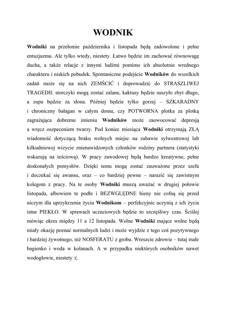 WODNIK Wodniki na przełomie października i listopada będą zadowolone i pełne entuzjazmu. Ale tylko wtedy, niestety. Łatwo będzie im zachować równowagę ducha, a także relacje z innymi ludźmi pomimo ich absolutnie wrednego charakteru i niskich pobudek. Spontaniczne podejście Wodników do wszelkich zadań może się na nich ZEMŚCIĆ i doprowadzić do STRASZLIWEJ TRAGEDII: storczyki mogą zostać zalane, kaktusy będzie suszyło zbyt długo, a zupa będzie za słona. Później będzie tylko gorzej – SZKARADNY i chroniczny bałagan w całym domu, czy POTWORNA plotka za plotką zagrażająca dobremu imieniu Wodników może zaowocować depresją a wręcz oszpeceniem twarzy. Pod koniec miesiąca Wodniki otrzymają ZŁĄ wiadomość dotyczącą braku wolnych miejsc na zabawie sylwestrowej lub kilkudniowej wizycie znienawidzonych członków rodziny partnera (statystyki wskazują na teściową). W pracy zawodowej będą bardzo kreatywne, pełne doskonałych pomysłów. Dzięki temu mogą zostać zauważone przez szefa i doczekać się awansu, oraz – co bardziej pewne – narazić się zawistnym kolegom z pracy. Na te osoby Wodniki muszą uważać w drugiej połowie listopada, albowiem te podłe i BEZWGLĘDNE hieny nie cofną się przed niczym dla uprzykrzenia życia Wodnikom – perfekcyjnie uczynią z ich życia istne PIEKŁO. W sprawach uczuciowych będzie to szczęśliwy czas. Ściślej mówiąc okres między 11 a 12 listopada. Wolne Wodniki mające wolne będą miały okazję poznać normalnych ludzi i może wyjdzie z tego coś pozytywnego i bardziej żywotnego, niż NOSFERATU z grobu. Wreszcie zdrowie – tutaj małe bagienko i woda w kolanach. A w przypadku niektórych osobników nawet wodogłowie, niestety :(.