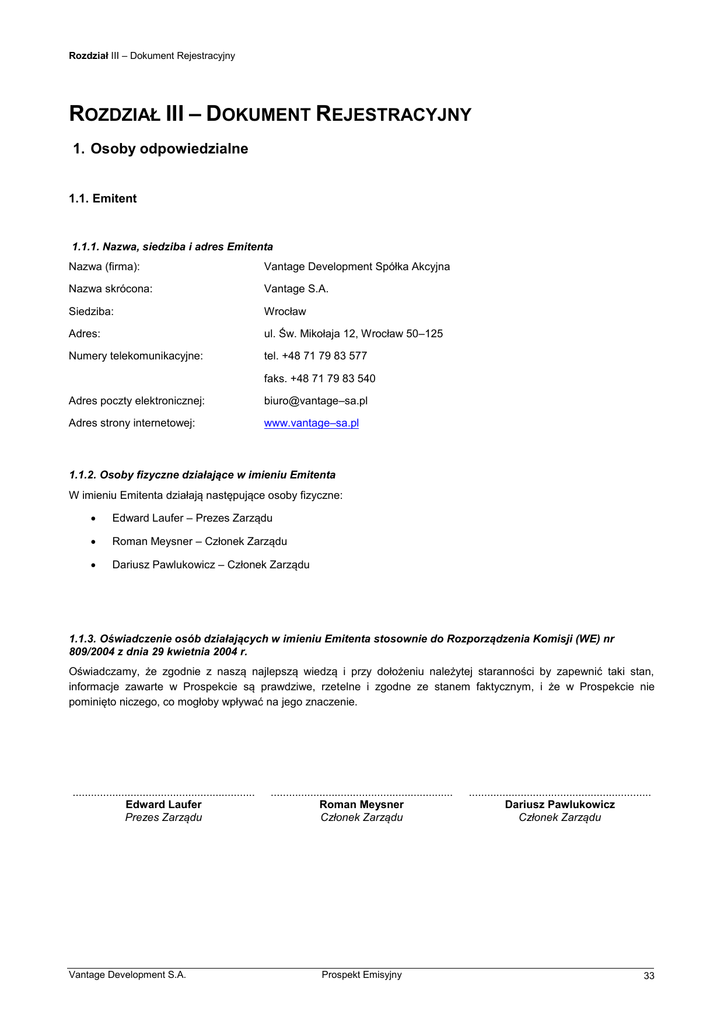 Rozdział III – Dokument Rejestracyjny ROZDZIAŁ III – DOKUMENT REJESTRACYJNY 1. Osoby odpowiedzialne 1.1. Emitent 1.1.1. Nazwa, siedziba i adres Emitenta Nazwa (firma): Vantage Development Spółka Akcyjna Nazwa skrócona: Vantage S.A. Siedziba: Wrocław Adres: ul. Św. Mikołaja 12, Wrocław 50–125 Numery telekomunikacyjne: tel. +48 71 79 83 577 faks. +48 71 79 83 540 Adres poczty elektronicznej: biuro@vantage–sa.pl Adres strony internetowej: www.vantage–sa.pl 1.1.2. Osoby fizyczne działające w imieniu Emitenta W imieniu Emitenta działają następujące osoby fizyczne: Edward Laufer – Prezes Zarządu Roman Meysner – Członek Zarządu Dariusz Pawlukowicz – Członek Zarządu 1.1.3. Oświadczenie osób działających w imieniu Emitenta stosownie do Rozporządzenia Komisji (WE) nr 809/2004 z dnia 29 kwietnia 2004 r. Oświadczamy, że zgodnie z naszą najlepszą wiedzą i przy dołożeniu należytej staranności by zapewnić taki stan, informacje zawarte w Prospekcie są prawdziwe, rzetelne i zgodne ze stanem faktycznym, i że w Prospekcie nie pominięto niczego, co mogłoby wpływać na jego znaczenie. ............................................................ Edward Laufer Prezes Zarządu Vantage Development S.A. ............................................................ Roman Meysner Członek Zarządu Prospekt Emisyjny ............................................................ Dariusz Pawlukowicz Członek Zarządu 33 Rozdział III – Dokument Rejestracyjny 1.2. Wprowadzający 1.2.1. Nazwa, siedziba i adres Wprowadzającego Nazwa (firma): Vantage Development Spółka Akcyjna Nazwa skrócona: Vantage S.A. Siedziba: Wrocław Adres: ul. Św. Mikołaja 12, Wrocław 50–125 Numery telekomunikacyjne: tel. +48 71 79 83 577 faks. +48 71 79 83 540 Adres poczty elektronicznej: biuro@vantage–sa.pl Adres strony internetowej: www.vantage–sa.pl 1.2.2. Osoby fizyczne działające w imieniu Wprowadzającego W imieniu Wprowadzającego działają następujące osoby fizyczne: Edward Laufer – Prezes Zarządu Roman Meysner – Członek Zarządu Dariusz Pawlukowicz– Członek Zarządu 1.2.3. Oświadczenie osób działających w imieniu Wprowadzającego stosownie do Rozporządzenia Komisji (WE) nr 809/2004 z dnia 29 kwietnia 2004 r. Oświadczamy, że zgodnie z naszą najlepszą wiedzą i przy dołożeniu należytej staranności by zapewnić taki stan, informacje zawarte w Prospekcie są prawdziwe, rzetelne i zgodne ze stanem faktycznym, i że w Prospekcie nie pominięto niczego, co mogłoby wpływać na jego znaczenie. ............................................................ Edward Laufer Prezes Zarządu Vantage Development S.A. ............................................................ Roman Meysner Członek Zarządu Prospekt Emisyjny ............................................................ Dariusz Pawlukowicz Członek Zarządu 34 Rozdział III – Dokument Rejestracyjny 1.3. Millennium Dom Maklerski S.A. 1.3.1. Nazwa, siedziba i adres Oferującego Nazwa (firma): Millennium Dom Maklerski Spółka Akcyjna Siedziba: Warszawa Adres: ul. Stanisława Żaryna 2a, 02–593 Warszawa Numery telekomunikacyjne: tel. +48 22 598 26 00, 598 26 01 faks +48 22 598 26 99 Adres poczty elektronicznej: [email protected] Adres strony internetowej: www.millenniumdm.pl 1.3.2. Osoby fizyczne działające w imieniu Oferującego W imieniu Oferującego działają: Mariusz Dąbkowski – prezes zarządu Dorota Małgorzata Kowalczewska – członek zarządu 1.3.3. Oświadczenie osób działających w imieniu Oferującego stosownie do Rozporządzenia Komisji (WE) nr 809/2004 z dnia 29 kwietnia 2004 r. Oświadczamy, że zgodnie z naszą najlepszą wiedzą i przy dołożeniu należytej staranności, by zapewnić taki stan, informacje zawarte w częściach Prospektu, za które Millennium Dom Maklerski S.A. ponosi odpowiedzialność, tj. w następujących częściach Prospektu: punkt 2.2., 2.11. Rozdziału II – Czynniki ryzyka związane z emitentem oraz papierami wartościowymi objętymi emisją; punkty 1.2., 3., 5.1.5., 5.2., 6.1., 6.2., 6.3., 6.5., 9., 10., 11.1., 12., 20.9. Rozdziału III – Dokument Rejestracyjny; punkty 3.1., 3.2., 3.4., 4.1., 4.4., 4.7., 5., 6., 7.2., 7.3., 8., 9., 10.1. (w zakresie informacji dotyczących Oferującego) Rozdziału IV – Dokument Ofertowy oraz w odpowiadającym tym punktom elementom Podsumowania, są prawdziwe, rzetelne i zgodne ze stanem faktycznym, i że w tych częściach Prospektu nie pominięto niczego, co mogłoby wpływać na jego znaczenie. .......................................................... .......................................................... Mariusz Dąbkowski Dorota Małgorzata Kowalczewska prezes zarządu członek zarządu Vantage Development S.A. Prospekt Emisyjny 35 Rozdział III – Dokument Rejestracyjny 1.4. CMS Cameron McKenna Dariusz Greszta Spółka Komandytowa 1.4.1. Nazwa, siedziba i adres Nazwa (firma): CMS Cameron Komandytowa McKenna Dariusz Greszta Siedziba: Warszawa Adres: ul. Emilii Plater 53, 00–113 Warszawa, Polska Numery telekomunikacyjne: tel. +48 22 520 55 55 Spółka faks: +48 22 520 55 56 Adres poczty elektronicznej: warsaw@cms–cmck.com Adres strony internetowej: http://www.law–now.com 1.4.2. Osoby fizyczne działające w imieniu Doradcy Prawnego W imieniu Doradcy Prawnego działa: dr Rafał Stroiński – pełnomocnik, Beata Binek – pełnomocnik. 1.4.3. Oświadczenie osób działających w imieniu Doradcy Prawnego stosownie do Rozporządzenia Komisji (WE) nr 809/2004 z dnia 29 kwietnia 2004 r. Oświadczamy, że zgodnie z naszą najlepszą wiedzą i przy dołożeniu należytej staranności, by zapewnić taki stan, informacje zawarte w częściach Prospektu, za które CMS Cameron McKenna Dariusz Greszta Sp.K. ponosi odpowiedzialność, tj. w następujących częściach Prospektu: Rozdział II Pkt 2 – Czynniki ryzyka o istotnym znaczeniu dla Akcji Oferowanych z wyłączeniem Czynników ryzyka oznaczonyc