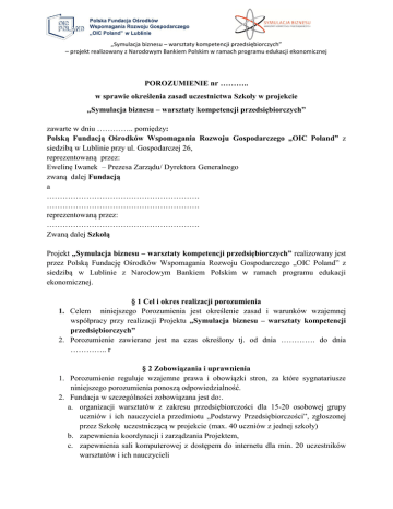 „Symulacja biznesu – warsztaty kompetencji przedsiębiorczych” – projekt realizowany z Narodowym Bankiem Polskim w ramach programu edukacji ekonomicznej POROZUMIENIE nr ……….. w sprawie określenia zasad uczestnictwa Szkoły w projekcie „Symulacja biznesu – warsztaty kompetencji przedsiębiorczych” zawarte w dniu ………….. pomiędzy: Polską Fundacją Ośrodków Wspomagania Rozwoju Gospodarczego „OIC Poland” z siedzibą w Lublinie przy ul. Gospodarczej 26, reprezentowaną przez: Ewelinę Iwanek – Prezesa Zarządu/ Dyrektora Generalnego zwaną dalej Fundacją a …………………………………………………. …………………………………………………. reprezentowaną przez: …………………………………………………. Zwaną dalej Szkołą Projekt „Symulacja biznesu – warsztaty kompetencji przedsiębiorczych” realizowany jest przez Polską Fundację Ośrodków Wspomagania Rozwoju Gospodarczego „OIC Poland” z siedzibą w Lublinie z Narodowym Bankiem Polskim w ramach programu edukacji ekonomicznej. § 1 Cel i okres realizacji porozumienia 1. Celem niniejszego Porozumienia jest określenie zasad i warunków wzajemnej współpracy przy realizacji Projektu „Symulacja biznesu – warsztaty kompetencji przedsiębiorczych” 2. Porozumienie zawierane jest na czas określony tj. od dnia …………. do dnia ………….. r § 2 Zobowiązania i uprawnienia 1. Porozumienie reguluje wzajemne prawa i obowiązki stron, za które sygnatariusze niniejszego porozumienia ponoszą odpowiedzialność. 2. Fundacja w szczególności zobowiązana jest do:. a. organizacji warsztatów z zakresu przedsiębiorczości dla 15-20 osobowej grupy uczniów i ich nauczyciela przedmiotu „Podstawy Przedsiębiorczości”, zgłoszonej przez Szkołę uczestniczącą w projekcie (max. 40 uczniów z jednej szkoły) b. zapewnienia koordynacji i zarządzania Projektem, c. zapewnienia sali komputerowej z dostępem do internetu dla min. 20 uczestników warsztatów i ich nauczycieli „Symulacja biznesu – warsztaty kompetencji przedsiębiorczych” – projekt realizowany z Narodowym Bankiem Polskim w ramach programu edukacji ekonomicznej d. wystawiania uczestnikom warsztatów Zaświadczeń o ich ukończeniu e. zapewnienie przerwy kawowej i cateringowej podczas warsztatów f. prowadzenia i archiwizowania wszelkiej dokumentacji związanej z realizacją projektu, w tym związanej z udziałem w nim Szkoły; g. przygotowanie i rozstrzygnięcie konkursu na Biznes Plan 3. Szkoła ma prawo w szczególności: a. otrzymać bezpłatnie wytworzone w ramach projektu materiały dydaktyczne, b. otrzymać bezpłatny dostęp do narzędzia – gra symulacyjna „Przedsiębiorstwo symulacyjne” 4. Szkoła odpowiada w szczególności za: a. przeprowadzenie wewnętrznej rekrutacji uczniów i nauczycieli do Projektu, zgodnie z informacjami zawartymi w formularzu zgłoszeniowym szkoły, polegającej na zebraniu i dostarczeniu do siedziby Fundacji podpisanych deklaracji uczestnictwa w projekcie przez nauczycieli i uczniów, w tym: wyznaczenie osoby odpowiedzialnej za kontakt z Fundacją (na przykład jeden nauczyciel biorący udział w projekcie). Szkoła może zgłosić maksymalnie udział 2 grup – łącznie 40 osób, b. wyznaczenie zastępstwa w przypadku nieobecności lub rezygnacji nauczyciela bądź uczniów, c. zapewnienie sprawnej komunikacji z biurem projektu w ramach przyjętego systemu, d. informowanie Fundacji, w trybie natychmiastowym, o problemach i barierach wynikłych w trakcie realizacji projektu, e. Zapewnienie przyjazdu pełnej grupy uczestników (min. 15-20 uczniów + nauczyciel) do miejsca realizacji warsztatów - siedziba Fundacji. 1. 2. 3. 4. 5. § 3 Warunki udziału uczniów oraz nauczycieli w Projekcie Beneficjentami Ostatecznymi projektu są uczniowie szkół ponadgimnazjalnych oraz nauczyciele przedmiotu „Podstawy przedsiębiorczości”. Wskazani w zgłoszeniu Szkoły: uczniowie oraz nauczyciele składają deklarację przystąpienia do projektu w terminie uzgodnionym z Fundacją. Szkoła wyłoniona do udziału w projekcie przekażę dokumentację uczniów wytypowanych do udziału w projekcie oraz nauczyciela: formularz zgłoszeniowy, deklarację przystąpienia do projektu, oświadczenie o wyrażeniu zgody na przetwarzanie danych osobowych, karta uczestnika. Porozumienie oraz wymienione dokumenty szkoła, zobowiązana jest w ciągu 10 dni roboczych, od momentu trzymania informacji o zakwalifikowaniu się do projektu, dostarczyć do siedziby Fundacji. W przypadku uczniów niepełnoletnich, wymagane jest podpisanie deklaracji przez rodzica lub opiekuna prawnego Uczniowie uczestniczący w projekcie zobowiązani są do: a. udziału w warsztatach, „Symulacja biznesu – warsztaty kompetencji przedsiębiorczych” – projekt realizowany z Narodowym Bankiem Polskim w ramach programu edukacji ekonomicznej b. rzetelnego wypełniania dokumentacji projektowej, ankiet monitorujących, testów wiedzy, ankiet wskaźników miękkich w celu oceny efektów przeprowadzonych warsztatów, c. bieżącego aktualizowania swoich danych osobowych, w przypadku gdy nastąpią zmiany - przekazania ich nauczycielowi biorącemu udział w projekcie. 6. Uczniowie uczestniczący w projekcie mają prawo do: a. zdobywania nowych umiejętności i rozwijania przedsiębiorczej postawy poprzez udział w warsztatach, b. uzyskania pomocy podczas warsztatów i zgłaszania problemów, gdyby takie zaistniały, c. otrzymania bezpłatnego zestawu materiałów dydaktycznych, d. udziału w konkursie na Biznes Plan, e. bezpłatnego korzystania z przerwy kawowej i cateringowej. 7. Nauczyciele uczestniczący w realizacji projektu zobowiązani są do: a. udziału w warsztatach w wymiarze 6 godzin, b. wypełniania ankiet monitorujących, ankiet ewaluacyjnych. c. bieżącego aktualizowania danych osobowych swoich oraz uczniów, w przypadku gdy nastąpią zmiany oraz przekazania ich do Fun