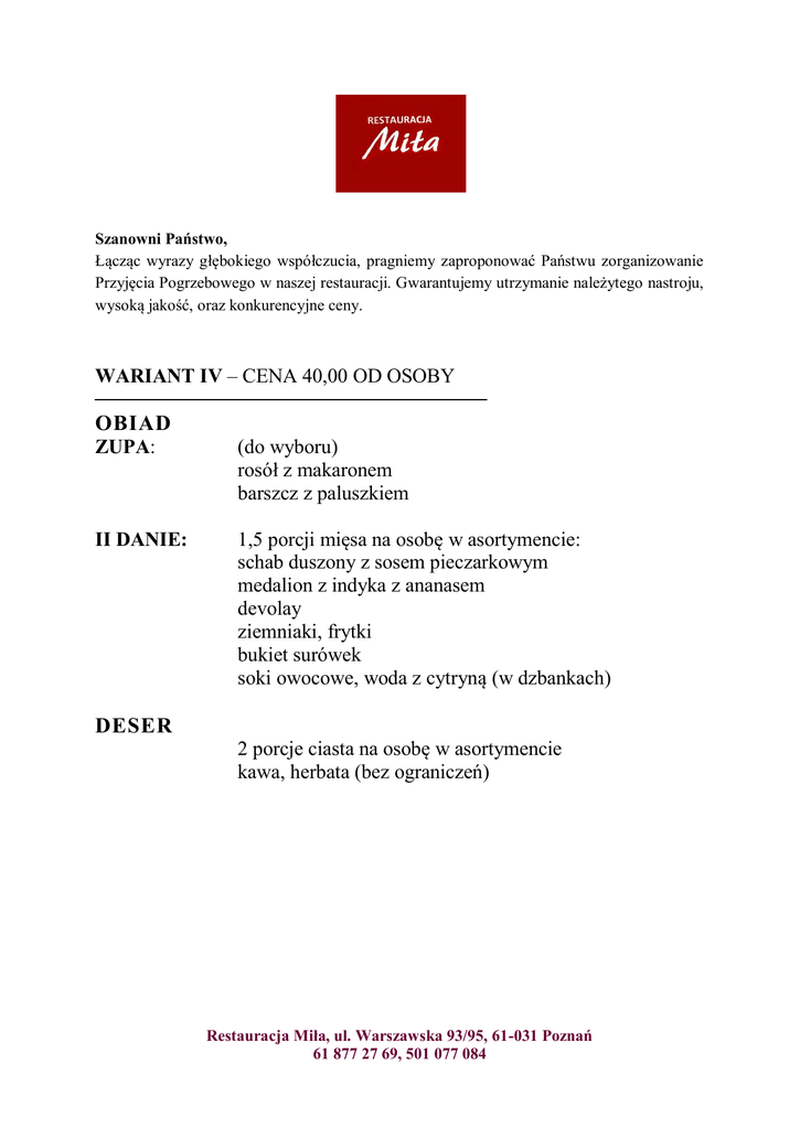 Szanowni Państwo, Łącząc wyrazy głębokiego współczucia, pragniemy zaproponować Państwu zorganizowanie Przyjęcia Pogrzebowego w naszej restauracji. Gwarantujemy utrzymanie należytego nastroju, wysoką jakość, oraz konkurencyjne ceny. WARIANT IV – CENA 40,00 OD OSOBY OBIAD ZUPA: (do wyboru) rosół z makaronem barszcz z paluszkiem II DANIE: 1,5 porcji mięsa na osobę w asortymencie: schab duszony z sosem pieczarkowym medalion z indyka z ananasem devolay ziemniaki, frytki bukiet surówek soki owocowe, woda z cytryną (w dzbankach) DESER 2 porcje ciasta na osobę w asortymencie kawa, herbata (bez ograniczeń) Restauracja Miła, ul. Warszawska 93/95, 61-031 Poznań 61 877 27 69, 501 077 084