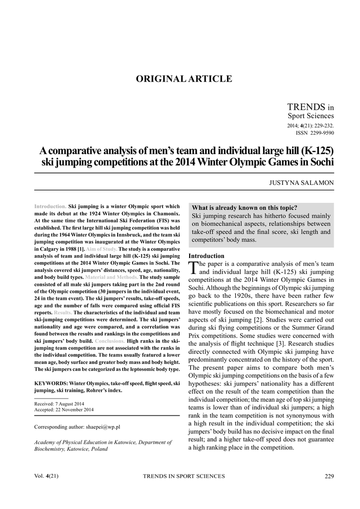 ORIGINAL ARTICLE TRENDS in Sport Sciences 2014; 4(21): 229-232. ISSN 2299-9590 A comparative analysis of men’s team and individual large hill (K-125) ski jumping competitions at the 2014 Winter Olympic Games in Sochi JUSTYNA SALAMON Introduction. Ski jumping is a winter Olympic sport which made its debut at the 1924 Winter Olympics in Chamonix. At the same time the International Ski Federation (FIS) was established. The first large hill ski jumping competition was held during the 1964 Winter Olympics in Innsbruck, and the team ski jumping competition was inaugurated at the Winter Olympics in Calgary in 1988 [1]. Aim of Study. The study is a comparative analysis of team and individual large hill (K-125) ski jumping competitions at the 2014 Winter Olympic Games in Sochi. The analysis covered ski jumpers’ distances, speed, age, nationality, and body build types. Material and Methods. The study sample consisted of all male ski jumpers taking part in the 2nd round of the Olympic competition (30 jumpers in the individual event, 24 in the team event). The ski jumpers’ results, take-off speeds, age and the number of falls were compared using official FIS reports. Results. The characteristics of the individual and team ski-jumping competitions were determined. The ski jumpers’ nationality and age were compared, and a correlation was found between the results and rankings in the competitions and ski jumpers’ body build. Conclusions. High ranks in the skijumping team competition are not associated with the ranks in the individual competition. The teams usually featured a lower mean age, body surface and greater body mass and body height. The ski jumpers can be categorized as the leptosomic body type. KEYWORDS: Winter Olympics, take-off speed, flight speed, ski jumping, ski training, Rohrer’s index. Received: 7 August 2014 Accepted: 22 November 2014 Corresponding author: [email protected] Academy of Physical Education in Katowice, Department of Biochemistry, Katowice, Poland Vol. 4(21) What is already known on this topic? Ski jumping research has hitherto focused mainly on biomechanical aspects, relationships between take-off speed and the final score, ski length and competitors’ body mass. Introduction he paper is a comparative analysis of men’s team and individual large hill (K-125) ski jumping competitions at the 2014 Winter Olympic Games in Sochi. Although the beginnings of Olympic ski jumping go back to the 1920s, there have been rather few scientific publications on this sport. Researchers so far have mostly focused on the biomechanical and motor aspects of ski jumping [2]. Studies were carried out during ski flying competitions or the Summer Grand Prix competitions. Some studies were concerned with the analysis of flight technique [3]. Research studies directly connected with Olympic ski jumping have predominantly concentrated on the history of the sport. The present paper aims to compare both men’s Olympic ski jumping competitions on the basis of a few hypotheses: ski jumpers’ nationality has a different effect on the result of the team competition than the individual competition; the mean age of top ski jumping teams is lower than of individual ski jumpers; a high rank in the team competition is not synonymous with a high result in the individual competition; the ski jumpers’ body build has no decisive impact on the final result; and a higher take-off speed does not guarantee a high ranking place in the competition. T TRENDS IN SPORT SCIENCES 229 SALAMON The following indices were calculated [4]: • Rohrer’s Index (RI) – a measure of leanness of a person; RI = {body mass (g) × 100} / body height (cm)3; • Quatelet’s Index I (QII); WQI = body mass (g) / body height (cm); • Body Mass Index (BMI) determining the degree of one’s underweight or overweight; BMI = body mass (kg) / body height (m)2. Aim of Study The study examined similarities and differences between ski jumping performances at two competitions: men’s team and men’s individual during the Olympic Games in Sochi in 2014. The main focus was the analysis of ski jumpers’ take-off speed and their landing distances. Also parameters such as competitors’ body build (body mass, body height, BMI, Quatelet’s Index I, Rohrer’s Index) as well as age and nationality were compared. jumpers in the men’s individual and men’s team competitions). The quantitative analysis was made on the basis of reports from the International Ski Federation. The nationality, age, somatic build and take-off speeds were compared between the two groups of ski jumpers. The correlation coefficient was calculated to examine correlations between the variables (Table 1). Results On the basis of collected data characteristic parameters of ski jumpers taking part in the men’s individual and team ski jumping competitions were determined. It was revealed that a high take-off speed had a significant impact on the length of the landing distance. The competitors who achieved the maximal take-off speed were the members of the victorious team of the team event (Table 3, 4). The correlation coefficient was high in the 1st series of jumps (r1 = 0.57), and medium in the 2nd series (r2 = 0.40). Table 1. Strength of correlations between examined variables Correlation coefficient (r) Strength of correlation r=0 0 < r < 0.1 no very low 0.1 < r < 0.3 0.3 < r < 0.5 0.5 < r < 0.7 0.7 < r < 0.9 low average high 0.9 < r < 1 very high full Table 2. Mean index values of ski jumpers taking part in the 2nd series of the men’s team competition Rank Age Body mass Body height RI QII BMI 1 2 3 4 5 6 7 8 23.00 24.00 29.00 25.00 27.00 27.00 31.00 27.00 66.25 62.00 59.50 58.75 60.75 59.75 59.25 61.75 182.75 179.50 174.00 175.00 176.25 176.00 174.25 177.25 1.08 1.08 1.11 1.10 1.11 1.10 1.13 1.06 362.00 345.25 344.62 335.67 344.64 339.78 339.86 348.17 19.80 19.24 19.63 19.19 19.56 19.63 19.50 19.06 Mean rank (individual) 16.00 22.00 9.00 16.00 19.00 21.0