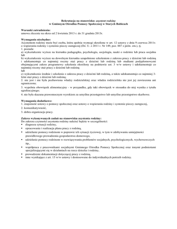 Rekrutacja na stanowisko: asystent rodziny w Gminnym Ośrodku Pomocy Społecznej w Starych Babicach Warunki zatrudnienia: umowa zlecenie na okres od 2 kwietnia 2013 r. do 31 grudnia 2013r. Wymagania niezbędne: Asystentem rodziny może być osoba, która spełnia wymogi określone w art. 12 ustawy z dnia 9 czerwca 2011r. o wspieraniu rodziny i systemie pieczy zastępczej (Dz. U. z 2011 r. Nr 149, poz. 887 z późn. zm.), tj. 1. posiada: a) wykształcenie wyższe na kierunku pedagogika, psychologia, socjologia, nauki o rodzinie lub praca socjalna lub b) wykształcenie wyższe na dowolnym kierunku uzupełnione szkoleniem z zakresu pracy z dziećmi lub rodziną i udokumentuje co najmniej roczny staż pracy z dziećmi lub rodziną lub studiami podyplomowymi obejmującymi zakres programowy szkolenia określony na podstawie ust. 3 w/w ustawy i udokumentuje co najmniej roczny staż pracy z dziećmi lub rodziną lub c) wykształcenie średnie i szkolenie z zakresu pracy z dziećmi lub rodziną, a także udokumentuje co najmniej 3letni staż pracy z dziećmi lub rodziną; 2. nie jest i nie była pozbawiona władzy rodzicielskiej oraz władza rodzicielska nie jest jej zawieszona ani ograniczona; 3. wypełnia obowiązek alimentacyjny - w przypadku, gdy taki obowiązek w stosunku do niej wynika z tytułu egzekucyjnego; 4. nie była skazana prawomocnym wyrokiem za umyślne przestępstwo lub umyślne przestępstwo skarbowe. Wymagania dodatkowe: 1. znajomość ustawy o pomocy społecznej oraz ustawy o wspieraniu rodziny i systemie pieczy zastępczej, 2. komunikatywność, 3. dobra organizacja pracy. Zakres wykonywanych zadań na stanowisku asystenta rodziny: Do zakresu czynności asystenta rodziny należeć będzie w szczególności: diagnoza sytuacji rodziny, opracowanie i realizacja planu pracy z rodziną, udzielanie pomocy rodzinom w poprawie ich sytuacji życiowej, w tym w zdobywaniu umiejętności prawidłowego prowadzenia gospodarstwa domowego, udzielanie pomocy rodzinom w rozwiązywaniu problemów socjalnych, psychologicznych, wychowawczych itp., współpraca z pracownikami socjalnymi Gminnego Ośrodka Pomocy Społecznej oraz innymi podmiotami specjalizującymi się w działaniach na rzecz dziecka i rodziny, prowadzenie dokumentacji dotyczącej pracy z rodziną, inne wynikające z art. 15 w/w ustawy i dostosowane do indywidualnych potrzeb rodziny. Wymagane dokumenty: 1. życiorys (CV), 2. list motywacyjny, 3. dyplomy ukończenia studiów, świadectwa ukończenia szkół potwierdzających zdobyte wykształcenie, 4.dokumenty potwierdzające kwalifikacje zawodowe, wymagane do wykonywania oferowanej pracy (ukończone kursy i szkolenia), posiadane referencje, 5. oświadczenie o niekaralności za przestępstwa popełnione umyślnie oraz o pełnej zdolności do czynności prawnych i posiadaniu praw publicznych, 6. oświadczenie o nie skazaniu prawomocnym wyrokiem za umyślne przestępstwo lub umyślne przestępstwo skarbowe, 7. oświadczenie, że kandydat nie jest i nie był pozbawiony władzy rodzicielskiej oraz władza rodzicielska nie jest mu zawieszona lub ograniczona, 8. oświadczenie, że kandydat wypełnia obowiązek alimentacyjny – w przypadku, gdy taki obowiązek został na niego nałożony na podstawie tytułu egzekucyjnego, 9. oświadczenie kandydata o wyrażeniu zgody na przetwarzanie danych osobowych o treści: „Wyrażam zgodę na przetwarzanie danych osobowych zawartych w ofercie pracy dla potrzeb procesu rekrutacji zgodnie z ustawą z dnia 29 sierpnia 1997r. o ochronie danych osobowych (Dz. U. z 2002 r. Nr 101, poz. 926 z późń. zm.)”. Powyższe dokumenty należy dostarczyć w zamkniętej kopercie, z dopiskiem „Nabór na stanowisko asystenta rodziny 2013” do Gminnego Ośrodka Pomocy Społecznej w Starych Babicach ul. Rynek 21 (I piętro, pok. 30) lub drogą elektroniczną na adres: [email protected] w terminie do 25 marca 2013r. do godz. 17.00 Oferty, które wpłyną po terminie nie będą rozpatrywane. Dodatkowe informacje: Dodatkowych informacji o naborze udziela Kierownik GOPS - Pani Alicja Napurka pod nr tel. 22 722 90 11 od poniedziałku do piątku w godzinach: poniedziałek od 8.00 do 17.00 wtorek, środa, czwartek od 8.00 do 16.00 piątek od 8.00 do 15.00
