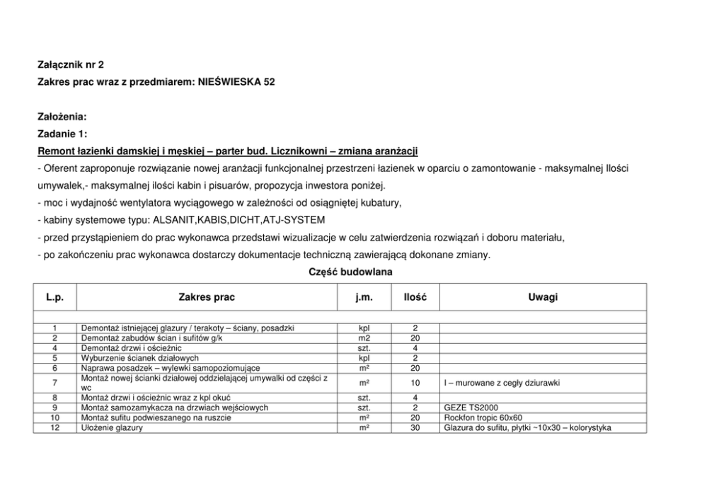 Załącznik nr 2 Zakres prac wraz z przedmiarem: NIEŚWIESKA 52