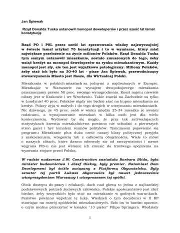Jan Śpiewak Rząd Donalda Tuska ustanowił monopol deweloperów i przez sześć lat łamał konstytucję Rząd PO i PSL przez sześć lat sprawowania władzy najzwyczajniej w świecie łamał artykuł 75 konstytucji i to w wymiarze, który miał największe przełożenie na życie milionów Polaków. Rząd Donalda Tuska tym samym ustanowił mieszkanie, zostało zmuszonych do tego, żeby wziąć kredyt na monopol deweloperów na rynku mieszkaniowym. Każdy monopol jest zły, ale ten jest wyjątkowo patologiczny. Miliony Polaków, żeby stać ich było na 30-40 lat - pisze Jan Śpiewak, przewodniczący stowarzyszenia Miasto jest Nasze, dla Wirtualnej Polski. Mieszkania w polskich miastach są jednymi z najdroższych w Europie. Mieszkając w Warszawie na wynajem dwupokojowego mieszkania przeznaczamy prawie 50 proc. swojego wynagrodzenia. Koszt najmu niewiele niższy jest w Krakowie i we Wrocławiu. Takie stawki na Zachodzie są tylko w Londynie! 40 proc. Polaków nigdy nie będzie stać na kupno mieszkania na kredyt. Polacy żyją w małych i do tego drogich w utrzymaniu mieszkaniach. Nic dziwnego, że 45 proc. osób w wieku między 25-34 mieszka ze swoimi rodzicami, a wynajmowanie mieszkań w kilka osób jest dla wielu koniecznością. Wydawać by się mogło, że przy tak zatrważających statystykach kwestia mieszkalnictwa powinno nie schodzić z pierwszych stron gazet i być tematem rozmów polityków. Tymczasem pojawienie się programu Mieszkanie plus duża część naszej klasy politycznej przyjęła z zaskoczeniem, wrogością lub z całkowitą obojętnością. Wiele to mówi o naszych elitach, które dawno oderwały się od rzeczywistości i nawet wygrana PiS-u nie jest wstanie ich zmusić do trzeźwego spojrzenia na wyzwania stojące przed Polską. W radzie nadzorcze J.W. Construction zasiadała Barbara Blida, była minister budownictwa i Józef Oleksy, były premier. Natomiast Dom Development był ściśle związany z Platformą Obywatelską. Były senator tej partii Łukasz Abgarowicz był nawet jednocześnie wiceprezydentem Warszawy i wiceprezesem tej spółki. Obok dostępu do pracy i edukacji, dach nad głową to jedna z najbardziej podstawowych potrzeb życiowych człowieka. Polskie społeczeństwo jest zbyt biedne, żeby wszystkich było stać na mieszkanie w godnych warunkach. Państwo powinno wypełnić tę lukę. Wiedzieli o tym decydenci w II RP stawiając na rozwój spółdzielni mieszkaniowych. Szło im to bardzo opornie, o czym można przeczytać w książce "13 pięter" Filipa Springera. Wiedziały 1 o tym władze PRL budując na masową skalę domy z wielkiej płyty. Do pewnego momentu wiedziały o tym również elity III RP. Państwo po upadku komunizmu postawiło na Towarzystwa Budownictwa Społecznego. Popularne TBS-y zasilane tanimi kredytami z Krajowego Funduszu Mieszkaniowego wybudowały ponad 100 tys. mieszkań. Deweloperskie eldorado W okolicach 2000 roku zaczęło się dziać coś dziwnego. Państwo postawiło na deweloperów i za rządów Platformy Obywatelskiej doprowadziło w 2009 roku do całkowitej likwidacji budownictwa społecznego poprzez wygaszenie Krajowego Funduszu Mieszkaniowego. Tymczasem zgodnie z art. 75 Konstytucji RP, "władze publiczne prowadzą politykę sprzyjającą zaspokojeniu potrzeb mieszkaniowych obywateli, w szczególności przeciwdziałają bezdomności, wspierają rozwój budownictwa socjalnego". Rząd PO i PSL przez sześć lat sprawowania władzy najzwyczajniej w świecie łamał artykuł 75 konstytucji i to w wymiarze, który miał największe przełożenie na życie milionów Polaków. Rząd Donalda Tuska tym samym ustanowił monopol deweloperów na rynku mieszkaniowym. Każdy monopol jest zły, ale ten jest wyjątkowo patologiczny. Dlaczego monopol? Bo miliony Polaków, żeby stać ich było na mieszkanie, zostało zmuszonych do tego, żeby wziąć kredyt na 30-40 lat i je po prostu kupić. Zazwyczaj na rynku pierwotnym. Państwo i samorządy nie zaoferowały żadnych alternatyw. Sekundowali tym przemianom polscy liberałowie, dla których liberalizm zawsze był bardziej dysputą nad koniakiem i cygarem niż rzeczywistą dyskusją na temat problemów gospodarczych polski. Te dyskusje zawsze były prowadzone z perspektywy i z pominięciem rzucających się w oczy statystyk. Na tak pojmowanym liberalizmie przejechał się Bronisław Komorowski gdy zachęcał młodego chłopaka, żeby "wziął kredyt i zmienił pracę". Na pewno nie przeszkadzały też osobiste kontakty między dwoma największymi firmami deweloperskimi w kraju a czołowymi politykami SLD i Platformy Obywatelskiej. W radzie nadzorcze J.W. Construction zasiadała Barbara Blida, była minister budownictwa i Józef Oleksy, były premier. Natomiast Dom Development był ściśle związany z Platformą Obywatelską. Były senator tej partii Łukasz Abgarowicz był nawet jednocześnie wiceprezydentem Warszawy i wiceprezesem tej spółki Pierwszym krokiem wykonanym w celu utworzenia deweloperskiego eldorado było uwolnienie pod budownictwo ogromnych obszarów rolnych. W 2003 roku rząd Leszka Millera wyrzucił do kosza wszystkie plany zagospodarowania terenu. Zniesiono wówczas dotychczasowo obowiązujące plany i jednocześnie nie zobowiązano gmin do uchwalenia nowych. 2 praktyce oznacza to, że tam gdzie nie ma planów, o pozwoleniu na budowę decyduje urzędnik wedle własnego widzimisię. Wtedy rozpoczął się płomienny romans między władzami samorządowymi a branżą budowlaną. Okazało się, że deweloperzy mogą budować wszystko wszędzie. Bardzo często z bardzo tanich materiałów. Mieszkania budowane są gdzie popadnie. Często odległość między oknami wynosi ustawowe osiem metrów. Polski wkład w światową urbanistykę Nowe osiedla są budowane w sposób absolutnie nieracjonalny. Zamiast tworzyć pierzeje i siatkę ulic, powstają zabudowane paski, które odzwierciedlają wiejski podział gruntów. "Osiedla łanowe" to polski wkład w światow