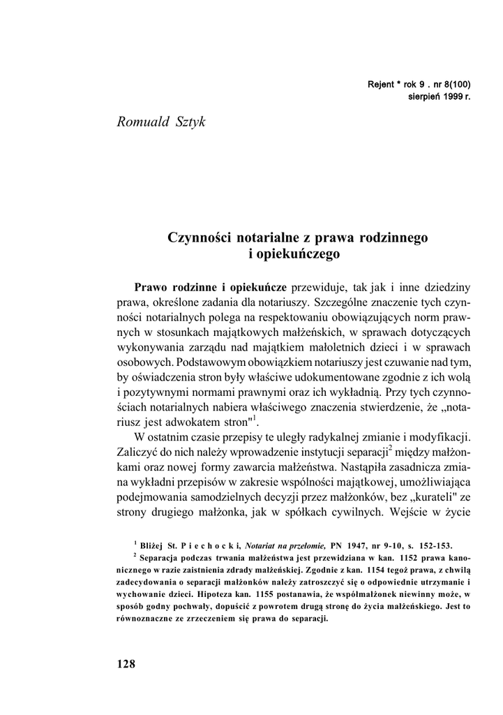 Rejent * rok 9 . nr 8(100) sierpień 1999 r. Romuald Sztyk Czynności notarialne z prawa rodzinnego i opiekuńczego Prawo rodzinne i opiekuńcze przewiduje, tak jak i inne dziedziny prawa, określone zadania dla notariuszy. Szczególne znaczenie tych czynności notarialnych polega na respektowaniu obowiązujących norm prawnych w stosunkach majątkowych małżeńskich, w sprawach dotyczących wykonywania zarządu nad majątkiem małoletnich dzieci i w sprawach osobowych. Podstawowym obowiązkiem notariuszy jest czuwanie nad tym, by oświadczenia stron były właściwe udokumentowane zgodnie z ich wolą i pozytywnymi normami prawnymi oraz ich wykładnią. Przy tych czynnościach notarialnych nabiera właściwego znaczenia stwierdzenie, że „notariusz jest adwokatem stron"1. W ostatnim czasie przepisy te uległy radykalnej zmianie i modyfikacji. Zaliczyć do nich należy wprowadzenie instytucji separacji2 między małżonkami oraz nowej formy zawarcia małżeństwa. Nastąpiła zasadnicza zmiana wykładni przepisów w zakresie wspólności majątkowej, umożliwiająca podejmowania samodzielnych decyzji przez małżonków, bez „kurateli" ze strony drugiego małżonka, jak w spółkach cywilnych. Wejście w życie 1 Bliżej St. P i e c h o c k i, Notariat na przełomie, PN 1947, nr 9-10, s. 152-153. Separacja podczas trwania małżeństwa jest przewidziana w kan. 1152 prawa kanonicznego w razie zaistnienia zdrady małżeńskiej. Zgodnie z kan. 1154 tegoż prawa, z chwilą zadecydowania o separacji małżonków należy zatroszczyć się o odpowiednie utrzymanie i wychowanie dzieci. Hipoteza kan. 1155 postanawia, że współmałżonek niewinny może, w sposób godny pochwały, dopuścić z powrotem drugą stronę do życia małżeńskiego. Jest to równoznaczne ze zrzeczeniem się prawa do separacji. 2 128 Czynności notarialne z prawa rodzinnego i opiekuńczego Konstytucji RP i konieczność bezpośredniego stosowania konwencji, umów międzynarodowych zawartych przez Polską, powodują nowe spojrzenie na stosowanie odpowiednich instytucji tego prawa w praktyce notarialnej. Zapowiedziana nowelizacja prawa spółdzielczego, wprowadzająca zasadę przepisów ogólnych, chroniących stosunki majątkowe małżeńskie przy nabywaniu i rozporządzaniu własnościowym spółdzielczym prawem do lokalu mieszkalnego, budynku mieszkalnego i działki gruntu, na którym został wzniesiony, jest kontynuacją dalszych zmian ustrojowych dotychczasowych norm prawnych, regulujących stosunki majątkowe małżeńskie. Przedstawione zjawiska występujące przy transformacji podstawowych założeń prawa rodzinnego i opiekuńczego wyzwalają potrzebę ich systematycznego uporządkowania. I. Separacja a rozdzielność majątkowa Separacja między małżonkami została wprowadzona mocą ustawy z dnia 21 maja 1999 r.3, poświęcając temu zagadnieniu dział V - Separacja w kodeksie rodzinnym i opiekuńczym. Zgodnie z art. 611 § 1 powołanej ustawy może być ona orzeczona, o ile między małżonkami nastąpił zupełny rozkład pożycia. Orzeczenie jej następuje na żądanie każdego z małżonków pod warunkiem, że nie ucierpi dobro wspólnych małoletnich dzieci4 względnie z innych przyczyn separacja byłaby sprzeczna z zasadami współżycia społecznego. Jednocześnie 3 Ustawa z dnia 21 maja 1999 r. o zmianie ustaw Kodeks rodzinny i opiekuńczy, Kodeks cywilny, Kodeks postępowania cywilnego oraz niektórych innych ustaw (Dz.U. Nr 52, poz. 532) wchodzi w życie, stosowanie do art. 7 ustawy, po upływie 6 miesięcy od dnia ogłoszenia, czyli od 16 grudnia 1999 r. Reguluje ona nie tylko separację między małżonkami i związane z tym przepisy związkowe, ale także niektóre inne problemy. Należy do nich zmiana § 2 i § 4 art. 10 k.r.o. określająca ustawowe przesłanki unieważnienia małżeństwa w razie niezachowania przepisanego wieku. Stan faktycznej separacji małżonków może stanowić ważny powód zniesienia wspólności majątkowej, jeżeli jest wynikiem trwałego rozkładu pożycia, a zniesienie wspólności nie pozostaje w sprzeczności z dobrem rodziny, uchwała SN z dnia 28 maja 1973 r. CZP 26/73, OSNCP 1974, nr 4, poz. 65. Natomiast przez „ważne powody" uzasadniające zniesienie wspólności majątkowej małżonków należy rozumieć nie tylko okoliczności natury majątkowej, wyrok SN z dnia 6 listopada 1972 r. III CRN 250/72, OSNCP 1973, nr 6, poz. 113. 4 Przy dokonywaniu oceny zakresu dobra małoletnich dzieci sąd musi uwzględnić zarówno obowiązujące w tej mierze przepisy krajowe, jak i przyjętej przez Zgromadzenie Ogólne Narodów Zjednoczonych konwencji z dnia 20 listopada 1989 r. o prawach dziecka 129 Romuald Sztyk ustawodawca postanowił w § 3 cytowanego przepisu, że jeżeli małżonkowie nie mają wspólnych małoletnich dzieci, sąd może orzec separacją na podstawie zgodnego żądania małżonków. W wypadku zaś gdy jeden z małżonków żąda separacji, a drugi orzeczenia rozwodu i żądanie to jest uzasadnione, wówczas stosownie do dyspozycji art. 612 ustawy sąd orzeka rozwód. Jeżeli orzeczenie rozwodu jest niedopuszczalne, a żądanie separacji uzasadnione - sąd orzeka separację. Stosownie do postanowienia art. 613 § 1 ustawy, przy orzekaniu separacji sąd stosuje, podobnie jak przy rozwodzie, przepisy art. 57 i 58 k.r.o. W razie orzeczenia separacji na podstawie zgodnego żądania małżonków sąd nie orzeka o winie rozkładu pożycia. Sąd rozstrzyga także o władzy rodzicielskiej nad wspólnym małoletnim dzieckiem obojga małżonków oraz o wysokości kosztów ponoszonych przez każdego z nich na utrzymanie i wychowanie dziecka. Mocą orzeczenia sądowego wykonywanie tej władzy przez jednego z rodziców może być ograniczone i powierzone drugiemu z nich. Wówczas sąd określi obowiązki i uprawnienia w stosunku do osoby dziecka. Osobny problem stanowi wspólne mieszkanie małżonków. Skoro do separacji stosuj ą się wprost przepisy o rozwodz