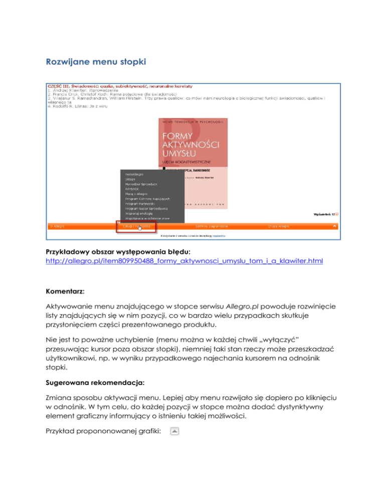 Rozwijane menu stopki Przykładowy obszar występowania błędu: http://allegro.pl/item809950488_formy_aktywnosci_umyslu_tom_i_a_klawiter.html Komentarz: Aktywowanie menu znajdującego w stopce serwisu Allegro.pl powoduje rozwinięcie listy znajdujących się w nim pozycji, co w bardzo wielu przypadkach skutkuje przysłonięciem części prezentowanego produktu. Nie jest to poważne uchybienie (menu można w każdej chwili „wyłączyć” przesuwając kursor poza obszar stopki), niemniej taki stan rzeczy może przeszkadzać użytkownikowi, np. w wyniku przypadkowego najechania kursorem na odnośnik stopki. Sugerowana rekomendacja: Zmiana sposobu aktywacji menu. Lepiej aby menu rozwijało się dopiero po kliknięciu w odnośnik. W tym celu, do każdej pozycji w stopce można dodać dystynktywny element graficzny informujący o istnieniu takiej możliwości. Przykład propononowanej grafiki: