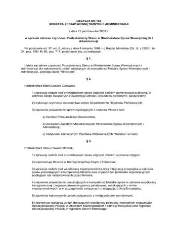 DECYZJA NR 165 MINISTRA SPRAW WEWNĘTRZNYCH I ADMINISTRACJI z dnia 15 października 2003 r. w sprawie zakresu czynności Podsekretarzy Stanu w Ministerstwie Spraw Wewnętrznych i Administracji. Na podstawie art. 37 ust. 2 ustawy z dnia 8 sierpnia 1996 r. o Radzie Ministrów (Dz. U. z 2003 r. Nr 24, poz. 199 i Nr 80, poz. 717) postanawia się, co następuje: § 1. Ustala się zakres czynności Podsekretarzy Stanu w Ministerstwie Spraw Wewnętrznych i Administracji dla wykonywania zadań należących do kompetencji Ministra Spraw Wewnętrznych i Administracji, zwanego dalej "Ministrem". § 2. Podsekretarz Stanu Leszek Ciećwierz: 1) sprawuje nadzór nad prowadzeniem spraw objętych działem administracja publiczna, w zakresie zadań związanych z ewidencją ludności, dowodami osobistymi i paszportami; 2) wykonuje czynności kierownictwa wobec Departamentu Rejestrów Państwowych; 3) zapewnia prowadzenie spraw wynikających z nadzoru Ministra nad: a) Centrum Personalizacji Dokumentów, b) Zarządem Zasobów Mieszkaniowych Ministerstwa Spraw Wewnętrznych i Administracji, c) Instytutem Technicznym Wyrobów Włókienniczych "Moratex" w Łodzi. § 3. Podsekretarz Stanu Paweł Dakowski: 1) sprawuje nadzór nad prowadzeniem spraw objętych działem wyznania religijne; 2) reprezentuje Ministra w Komisji Wspólnej Rządu i Episkopatu; 3) sprawuje nadzór nad współpracą międzynarodową oraz integracją europejską w zakresie spraw pozostających w kompetencji Ministra oraz organów lub jednostek organizacyjnych podległych lub nadzorowanych przez Ministra; 4) zapewnia prowadzenie pozostających w kompetencji Ministra spraw w zakresie współpracy transgranicznej i zagospodarowania granicy państwowej, wynikających z umów międzynarodowych, a w szczególności związanych z integracją z Unią Europejską; 5) zapewnia wykonywanie zadań związanych z mniejszościami narodowymi; 6) koordynuje realizację zadań dotyczących współpracy północno-wschodnich województw Rzeczypospolitej Polskiej z Obwodem Kaliningradzkim Federacji Rosyjskiej oraz regionów Rzeczypospolitej Polskiej z regionem Sankt Petersburga; 7) zapewnia prowadzenie spraw wynikających z nadzoru Ministra nad Prezesem Urzędu do Spraw Repatriacji i Cudzoziemców; 8) wykonuje czynności kierownictwa wobec: a) Departamentu Wyznań i Mniejszości Narodowych, b) Departamentu Integracji Europejskiej i Współpracy Międzynarodowej. § 4. Podsekretarz Stanu Tadeusz Matusiak: 1) wykonuje zadania, o których mowa w § 45 uchwały Nr 49 Rady Ministrów z dnia 19 marca 2002 r. - Regulamin pracy Rady Ministrów (M.P. Nr 13, poz. 221 z późn. zm.), w zakresie bieżącej koordynacji spraw parlamentarnych w Ministerstwie Spraw Wewnętrznych i Administracji; 2) sprawuje nadzór nad zgodnością przygotowywanych w Ministerstwie Spraw Wewnętrznych i Administracji projektów aktów prawnych z obowiązującym systemem prawnym oraz z zasadami techniki prawodawczej; 3) podpisuje, w zastępstwie Ministra i w czasie jego nieobecności, pisma kierujące do rozpatrzenia przez Radę Ministrów projekty ustaw i rozporządzeń przygotowane w resorcie spraw wewnętrznych i administracji; 4) podpisuje, w zastępstwie Ministra i w czasie jego nieobecności, akty prawne kierowane do ogłoszenia w Dzienniku Ustaw Rzeczypospolitej Polskiej i Dzienniku Urzędowym Rzeczypospolitej Polskiej "Monitor Polski"; 5) zapewnia ochronę prawną interesów Ministerstwa Spraw Wewnętrznych i Administracji oraz koordynuje jego działalność legislacyjną; 6) udziela pełnomocnictw do reprezentowania Ministra w pracach komisji sejmowych i senackich; 7) podpisuje, w zastępstwie Ministra i w czasie jego nieobecności, pełnomocnictwa do reprezentowania Ministra przed Trybunałem Konstytucyjnym, sądami oraz organami administracji publicznej; 8) sprawuje nadzór nad prowadzeniem spraw objętych działem sprawy wewnętrzne, w zakresie ochrony przeciwpożarowej, ratownictwa, obrony cywilnej, przeciwdziałania skutkom klęsk żywiołowych i innych podobnych zdarzeń zagrażających bezpieczeństwu powszechnemu, a także w zakresie zadań związanych z wydawaniem zezwoleń na zakup nieruchomości przez cudzoziemców oraz wydawaniem koncesji określonych w odrębnych przepisach; 9) zapewnia prowadzenie spraw wynikających ze stosunku podległości wobec Ministra: a) Komendanta Głównego Państwowej Straży Pożarnej, b) Szefa Obrony Cywilnej Kraju; 10) koordynuje realizację Oświęcimskiego Strategicznego Programu Rządowego; 11) wykonuje czynności kierownictwa wobec: a) Departamentu Prawnego, b) Departamentu Bezpieczeństwa .Powszechnego, c) Departamentu Zezwoleń i Koncesji; 12) zapewnia prowadzenie spraw wynikających z nadzoru Ministra nad: a) Szkołą Główną Służby Pożarniczej, b) Centrum Naukowo-Badawczym Ochrony Przeciwpożarowej im. Józefa Tuliszkowskiego. § 5. Podsekretarz Stanu Jerzy Mazurek: 1) sprawuje nadzór nad prowadzeniem spraw objętych działem administracja publiczna, z wyłączeniem spraw, o których mowa w § 2 pkt 1; 2) koordynuje realizację zadań związanych z zagospodarowaniem mienia przejętego od wojsk Federacji Rosyjskiej; 3) występuje do Prezesa Rady Ministrów o rozstrzygnięcie sporu w sprawach określonych w art. 17 ustawy z dnia 5 czerwca 1998 r. o administracji rządowej w województwie (Dz. U. z 2001 r. Nr 80, poz. 872 z późn. zm.); 4) sprawuje nadzór nad sprawami toczącymi się przed Naczelnym Sądem Administracyjnym dotyczącymi skarg na bezczynność i decyzje ostateczne wydane przez Ministra; 5) nadzoruje wydawanie opinii jednostkom samorządu terytorialnego w sprawach, o których mowa w art. 3 ust. 3 ustawy z dnia 21 grudnia 1978 r. o odznakach i mundurach (Dz. U. Nr 31, poz. 130 z późn. zm.); 6) sprawuje nadzór nad wykonywaniem zadań przez Państwową Inspekcję Sanitarną Ministerstwa Spraw Wewnętrznych i Administracji oraz wykonuje zadania przewidziane dla Ministra jako organu założycielskiego samodzielnych pub