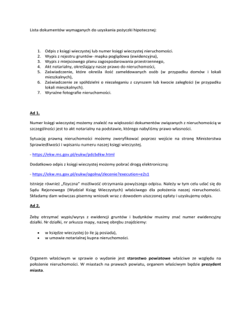 Lista dokumentów wymaganych do uzyskania pożyczki hipotecznej: 1. 2. 3. 4. 5. Odpis z księgi wieczystej lub numer księgi wieczystej nieruchomości. Wypis z rejestru gruntów- mapka poglądowa (ewidencyjna), Wypis z miejscowego planu zagospodarowania przestrzennego, Akt notarialny, określający nasze prawo do nieruchomości, Zaświadczenie, które określa ilośd zameldowanych osób (w przypadku domów i lokali mieszkalnych), 6. Zaświadczenie ze spółdzielni o niezaleganiu z czynszem lub kwocie zaległości (w przypadku lokali mieszkalnych). 7. Wyraźne fotografie nieruchomości. Ad 1. Numer księgi wieczystej możemy znaleźd na większości dokumentów związanych z nieruchomością w szczególności jest to akt notarialny na podstawie, którego nabyliśmy prawo własności. Sytuację prawną nieruchomości możemy zweryfikowad poprzez wejście na stronę Ministerstwa Sprawiedliwości i wpisaniu numeru naszej księgi wieczystej. - https://ekw.ms.gov.pl/eukw/pdcbdkw.html Dodatkowo odpis z księgi wieczystej możemy pobrad drogą elektroniczną: - https://ekw.ms.gov.pl/eukw/ogolna/zlecenie?execution=e2s1 Istnieje również „fizyczna” możliwośd otrzymania powyższego odpisu. Należy w tym celu udad się do Sądu Rejonowego (Wydział Ksiąg Wieczystych) właściwego dla położenia naszej nieruchomości. Składamy dam wówczas pisemny wniosek wraz z dowodem uiszczonej opłaty i uzyskujemy odpis. Ad 2. Żeby otrzymad wypis/wyrys z ewidencji gruntów i budynków musimy znad numer ewidencyjny działki. Nr działki, nr arkusza mapy, nazwę obrębu znajdziemy: w księdze wieczystej (o ile ją posiada), w umowie notarialnej kupna nieruchomości. Organem właściwym w sprawie o wydanie jest starostwo powiatowe właściwe ze względu na położenie nieruchomości. W miastach na prawach powiatu, organem właściwym będzie prezydent miasta. Ad 3. Organem właściwym w sprawie o wydanie wypisu z miejscowego plany zagospodarowania przestrzennego jest: Prezydent / Wójt / Burmistrz - Urzędy Miast i Gmin Ad 5. Miejsce właściwym do załatwienia sprawy w związku z uzyskaniem zaświadczenia o ilości zameldowanych osób jest: Urząd Miasta lub Urząd Miasta i Gminy Ad 7. Fotografie powinny byd w stosunkowo dobrej jakości, wyraźne i nieporuszone. Powinny przedstawiad nieruchomośd w środku jak i na zewnątrz. Niezwykle istotne jest wiarygodne przedstawienie stanu technicznego danej nieruchomości. W przypadku domów i działek ważne jest również sfotografowanie najbliższej okolicy i sąsiednich nieruchomości.