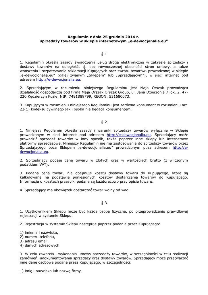 Regulamin z dnia 25 grudnia 2014 r. sprzedaży towarów w sklepie internetowym „e-dewocjonalia.eu” §1 1. Regulamin określa zasady świadczenia usług drogą elektroniczną w zakresie sprzedaży i dostawy towarów na odległość, tj. bez równoczesnej obecności stron umowy, a także wnoszenia i rozpatrywania reklamacji Kupujących oraz zwrotu towarów, prowadzonej w sklepie „e-dewocjonalia.eu” (dalej zwanym „Sklepem” lub „Sprzedającym”), w sieci internet pod adresem http://e-dewocjonalia.eu. 2. Sprzedającym w rozumieniu niniejszego Regulaminu jest Maja Orszak prowadząca działalność gospodarczą pod firmą Maja Orszak Orszak Group, ul. Jana Dzierżonia 7 lok. 2, 47220 Kędzierzyn Koźle, NIP: 7491888799, REGON: 531680073. 3. Kupującym w rozumieniu niniejszego Regulaminu jest zarówno konsument w rozumieniu art. 22(1) kodeksu cywilnego jak i osoba nie będąca konsumentem. §2 1. Niniejszy Regulamin określa zasady i warunki sprzedaży towarów wyłącznie w Sklepie prowadzonym w sieci internet pod adresem http://e-dewocjonalia.eu. Sprzedający może prowadzić sprzedaż towarów w inny sposób, także poprzez inne sklepy lub internetowe platformy sprzedażowe. Niniejszy Regulamin nie ma zastosowania do sprzedaży towarów przez Sprzedającego poza Sklepem „e-dewocjonalia.eu” prowadzonym poza adresem http://edewocjonalia.eu. 2. Sprzedający podaje cenę towaru w złotych oraz w wartościach brutto (z wliczonym podatkiem VAT). 3. Podana cena towaru nie obejmuje kosztu dostawy towaru do Kupującego, które są kalkulowane na podstawie poniesionych kosztów dostarczenia towarów do Kupującego. Informacje o kosztach przesyłki podane są każdorazowo przy opisie towaru. 4. Sprzedający ma obowiązek dostarczać towar wolny od wad. §3 1. Użytkownikiem Sklepu może być każda osoba fizyczna, po przeprowadzeniu prawidłowej rejestracji w systemie Sklepu. 2. Rejestracja w systemie Sklepu następuje poprzez podanie przez Kupującego: 1) 2) 3) 4) imienia i nazwiska, numeru telefonu, adresu email, danych adresowych 3. W celu zawarcia i wykonania umowy sprzedaży towarów, w szczególności w celu realizacji zamówień, udokumentowania sprzedaży oraz dostawy towarów, Sprzedający może przetwarzać inne dane osobowe podane przez Kupującego, w szczególności: 1) imię i nazwisko lub nazwę firmy, 2) numer NIP, 3) adres dostawy. 3. Przez rejestrację w systemie Sklepu Kupujący zawiera ze Sprzedającym umowę o nieodpłatne świadczenie usług drogą elektroniczną w zakresie prezentacji towarów w celu ich sprzedaży na odległość. Zawarcie umowy o świadczenie usług drogą elektroniczną nie oznacza zawarcia umowy sprzedaży jakichkolwiek towarów i nie pociąga za sobą zobowiązania po stronie Kupującego do nabycia jakichkolwiek towarów w Sklepie. 4. Sprzedający może przetwarzać dane osobowe podane przez Kupującego wyłącznie w celu prawidłowego wykonania zobowiązań wynikających z zawartych umów, w tym umowy sprzedaży, a w szczególności: 1) udokumentowania sprzedaży w sposób przewidziany przepisami prawa, 2) dostawy towarów w sposób i na adres wskazany przez Kupującego, 3) obsługi zwrotów oraz reklamacji. 5. Sprzedający przetwarza podane przez Kupującego dane osobowe w sposób zgodny z ustawą o ochronie danych osobowych oraz ustawą o świadczeniu usług drogą elektroniczną. Kupujący ma prawo dostępu do swoich danych, a także ich poprawiania oraz zwrócenia się z żądaniem ich usunięcia. 6. Sprzedający nie przekazuje i nie udostępnia danych osobowych innym administratorom danych, z wyjątkiem sytuacji niezbędnych do prawidłowego wykonania zobowiązania. 7. Podanie danych osobowych przez Kupującego jest całkowicie dobrowolne, jednak jest wymagane dla prawidłowego wykonania zawartej umowy. §4 1. Informacje podane w Sklepie stanowią zaproszenie do zawarcia umowy w rozumieniu art. 71 kc. Żadna z informacji podanych w Sklepie przez Sprzedającego nie stanowi oferty w rozumieniu przepisów kodeksu cywilnego. 2. Wyrażone przez Sprzedającego zaproszenie do zawarcia umowy określa w szczególności: 1) 2) 3) 4) rodzaj towaru, jego producenta, krótki opis towaru, cenę towaru, przewidywany czas realizacji zamówienia, 3. Kupujący może złożyć Sprzedającemu ofertę zawarcia umowy sprzedaży towaru poprzez wybór towaru przy użyciu stosownej funkcjonalności Sklepu (dodając do „koszyka” i zatwierdzając zamówione towary w koszyku). §5 1. Sprzedający niezwłocznie po otrzymaniu oferty potwierdza Kupującemu jej przyjęcie, za pośrednictwem wiadomości przesłanej na adres poczty elektronicznej Kupującego. 2. Sprzedający może, niezwłocznie po otrzymaniu oferty od Kupującego, odmówić przyjęcia oferty, jeśli jej realizacja będzie niemożliwa. 3. Po przyjęciu oferty przez Sprzedającego Kupujący może dokonać płatności ceny za towar oraz przesyłkę w jeden z wybranych przez siebie sposobów: 1) przelewem bankowym, bezpośrednio na rachunek Sprzedającego prowadzony w ING Bank SA nr 86 1050 1517 1000 0091 0235 3365, 2) płatność elektroniczna za pośrednictwem systemu PayPal, 3) płatność elektroniczna za pośrednictwem systemu PayU, 4) gotówką za pobraniem, przy odbiorze towaru, przy wyborze dostawy poprzez Pocztę Polską lub kuriera. 4. Dostawa towarów następuje w jeden z następujących, wybranych przez Kupującego sposobów: 1) 2) 3) 4) 5) przesyłka kurierska standardowa DPD, przesyłka kurierska standardowa za pobraniem DPD, dostawa do Paczkomatów InPost, przesyłka pocztowa priorytetowa Pocztą Polską, przesyłka pocztowa Pocztą Polską z płatnością za pobraniem. 5. Szczegółowa opłata za dostawę towarów podana jest przy każdej ofercie sprzedaży, a jej wysokość zależna jest w szczególności od wybranego sposobu dostawy oraz rodzaju, gabarytów i ciężaru towaru. §6 1. Sprzedający realizuje zamówienie w terminie określonym przy każdym z rodzaju towarów, nie późn