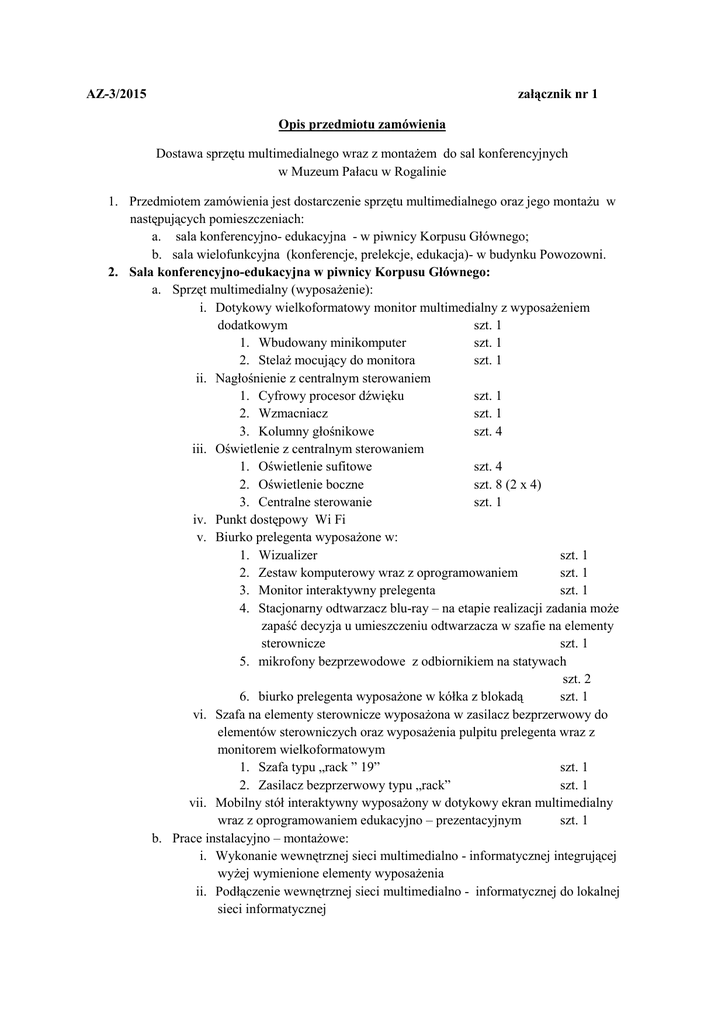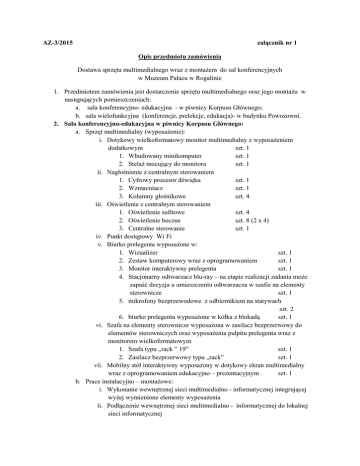załącznik nr 1 AZ-3/2015 Opis przedmiotu zamówienia Dostawa sprzętu multimedialnego wraz z montażem do sal konferencyjnych w Muzeum Pałacu w Rogalinie 1. Przedmiotem zamówienia jest dostarczenie sprzętu multimedialnego oraz jego montażu w następujących pomieszczeniach: a. sala konferencyjno- edukacyjna - w piwnicy Korpusu Głównego; b. sala wielofunkcyjna (konferencje, prelekcje, edukacja)- w budynku Powozowni. 2. Sala konferencyjno-edukacyjna w piwnicy Korpusu Głównego: a. Sprzęt multimedialny (wyposażenie): i. Dotykowy wielkoformatowy monitor multimedialny z wyposażeniem dodatkowym szt. 1 1. Wbudowany minikomputer szt. 1 2. Stelaż mocujący do monitora szt. 1 ii. Nagłośnienie z centralnym sterowaniem 1. Cyfrowy procesor dźwięku szt. 1 2. Wzmacniacz szt. 1 3. Kolumny głośnikowe szt. 4 iii. Oświetlenie z centralnym sterowaniem 1. Oświetlenie sufitowe szt. 4 2. Oświetlenie boczne szt. 8 (2 x 4) 3. Centralne sterowanie szt. 1 iv. Punkt dostępowy Wi Fi v. Biurko prelegenta wyposażone w: 1. Wizualizer szt. 1 2. Zestaw komputerowy wraz z oprogramowaniem szt. 1 3. Monitor interaktywny prelegenta szt. 1 4. Stacjonarny odtwarzacz blu-ray – na etapie realizacji zadania może zapaść decyzja u umieszczeniu odtwarzacza w szafie na elementy sterownicze szt. 1 5. mikrofony bezprzewodowe z odbiornikiem na statywach szt. 2 6. biurko prelegenta wyposażone w kółka z blokadą szt. 1 vi. Szafa na elementy sterownicze wyposażona w zasilacz bezprzerwowy do elementów sterowniczych oraz wyposażenia pulpitu prelegenta wraz z monitorem wielkoformatowym 1. Szafa typu „rack ” 19” szt. 1 2. Zasilacz bezprzerwowy typu „rack” szt. 1 vii. Mobilny stół interaktywny wyposażony w dotykowy ekran multimedialny wraz z oprogramowaniem edukacyjno – prezentacyjnym szt. 1 b. Prace instalacyjno – montażowe: i. Wykonanie wewnętrznej sieci multimedialno - informatycznej integrującej wyżej wymienione elementy wyposażenia ii. Podłączenie wewnętrznej sieci multimedialno - informatycznej do lokalnej sieci informatycznej iii. Instalacja 4 punktów abonenckich wewnętrznej sieci multimedialno – informatycznej w miejscach uzgodnionych ze zleceniodawcą w etapie wykonawczym; w przypadku konieczności zastosowania dodatkowych urządzeń sieciowych należy przewidzieć urządzania kategorii VI; niezbędne elementy aktywne należy uwzględnić w ofercie iv. Integracja i uruchomienie systemu multimedialnego od strony sprzętowej i programowej v. Punkt dostępowy WiFi dostarczy zleceniodawca, wykonawca wykonuje montaż urządzenia oraz podłączenie do wewnętrznej sieci multimedialno informatycznej vi. Wykonawca w swojej ofercie musi uwzględnić niezbędne elementy instalacyjne i montażowe vii. Wymaga się instalacji podtynkowej z przywróceniem pierwotnego wyglądu pomieszczenia 3. Sala wielofunkcyjna - w Powozowni a. Wyposażenie (sprzęt multimedialny): i. Wielkoformatowy monitor multimedialny szt. 1 1. Wbudowany minikomputer szt. 1 2. Stelaż mocujący do monitora szt. 1 3. Aktywne kolumny głośnikowe kpl. 1 (2 głośniki ) ii. Projektor multimedialny z obiektywem szt. 1 1. Aktywne kolumny głośnikowe kpl. 1 (2 głośniki ) iii. Ekran elektrycznie rozwijany iv. Notebook szt. 1 b. Prace instalacyjno – montażowe i. Wykonanie wewnętrznej sieci multimedialno - informatycznej integrującej wyżej wymienione elementy wyposażenia ii. Podłączenie wewnętrznej sieci multimedialno - informatycznej do lokalnej sieci informatycznej – przełącznik sieciowy znajduje się w piwnicy budynku iii. Instalacja 6 punktów abonenckich wewnętrznej sieci multimedialno – informatycznej w miejscach uzgodnionych ze zleceniodawcą w etapie wykonawczym; w przypadku konieczności zastosowania dodatkowych urządzeń sieciowych należy przewidzieć urządzania kategorii VI; niezbędne elementy aktywne należy uwzględnić w ofercie iv. W uzgodnionym ze zleceniodawcą miejscu (w okolicy ekranu) znajdować się będzie pulpit podłączeniowy do wyposażenia sieci multimedialnej umożliwiający: 1. równoległe odtwarzanie obrazu i dźwięku przez monitor i projektor multimedialny 2. niezależna praca monitora i projektora 3. gniazda przyłączeniowe pulpitu: a. vga 2 szt. (monitor i projektor) b. hdmi 2 szt. (monitor i projektor) c. podłączenie do wewnętrznej sieci informatycznej v. Integracja i uruchomienie systemu multimedialnego od strony sprzętowej i programowej vi. Wykonawca w swojej ofercie musi uwzględnić niezbędne elementy instalacyjne i montażowe vii. Wymaga się instalacji podtynkowej z przywróceniem pierwotnego wyglądu pomieszczenia 4. Wyposażenie multimedialne sali konferencyjnej Korpusu Głównego – parametry techniczne a. Dotykowy wielkoformatowy monitor multimedialny z wyposażeniem dodatkowym i. Parametry techniczne monitora Lp. Wartości graniczne (minimalne lub maksymalne) Opis parametru / funkcji: 1 Rodzaj matrycy: 2 3 4 5 6 7 8 9 10 11 12 13 14 15 Wielkość plamki: Wielkość ekranu: Rozdzielczość: Częstotliwość pozioma: Częstotliwość pionowa: Kontrast Jasność: Głośniki: Rozmiar plamki: Poziom hałasu: Funkcja wykrywania osób w pomieszczeniu Minimalny dzienny czas pracy ciągłej Montowanie VESA 800 mm x 400 mm Złącza: 16 Dołączone wyposażenie 17 Wymiary bez półki: max 18 19 Waga bez pisaków i półki max Certyfikaty: 20 21 Zasilanie Pobór mocy 22 Warunki otoczenia 23 Oprogramowanie edukacyjno prezentacyjne: LCD z podświetleniem LED dotykowa wielopunktowa z gładką przeciwodblaskową powierzchnią szklaną max 0.8 mm +/- 0,02 mm min 70” min 1920 x 1080 pix 16:9 min 16 milionów kolorów 54-69.75 kHz 48-62 kHz 4000:1 220-250 cd/m2 Zintegrowane głośniki 2x10W 0.807 mm 35 dBA tak 8 godzin tak Z przodu: 19V DC Micro-Fit 2-pin connector, stereo 3.5 mm out, USB 3.0 type-A, Z lewej strony: 19V DC Micro-Fit 2-pin connector, stereo 3.5 mm out, USB 3.0 type-A, Z prawej strony: : 19V DC Micro-Fit 2-pin connector, stereo 3.5 mm out, Z tyłu: 
