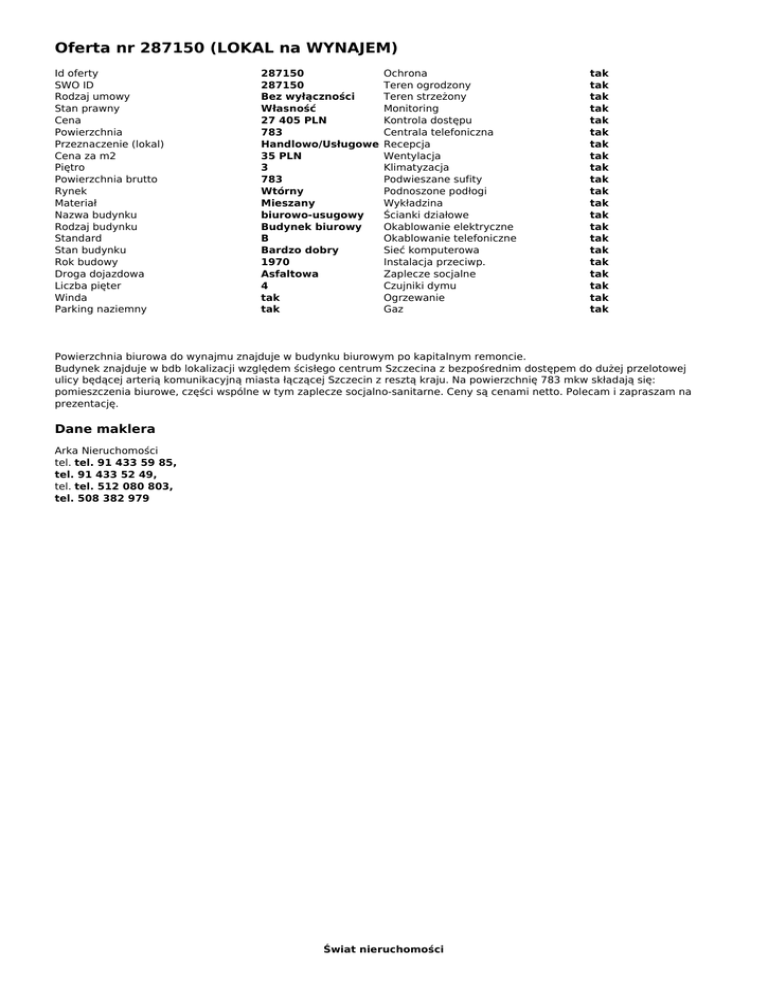 Oferta nr 287150 (LOKAL na WYNAJEM) Id oferty SWO ID Rodzaj umowy Stan prawny Cena Powierzchnia Przeznaczenie (lokal) Cena za m2 Piętro Powierzchnia brutto Rynek Materiał Nazwa budynku Rodzaj budynku Standard Stan budynku Rok budowy Droga dojazdowa Liczba pięter Winda Parking naziemny 287150 287150 Bez wyłączności Własność 27 405 PLN 783 Handlowo/Usługowe 35 PLN 3 783 Wtórny Mieszany biurowo-usugowy Budynek biurowy B Bardzo dobry 1970 Asfaltowa 4 tak tak Ochrona Teren ogrodzony Teren strzeżony Monitoring Kontrola dostępu Centrala telefoniczna Recepcja Wentylacja Klimatyzacja Podwieszane sufity Podnoszone podłogi Wykładzina Ścianki działowe Okablowanie elektryczne Okablowanie telefoniczne Sieć komputerowa Instalacja przeciwp. Zaplecze socjalne Czujniki dymu Ogrzewanie Gaz tak tak tak tak tak tak tak tak tak tak tak tak tak tak tak tak tak tak tak tak tak Powierzchnia biurowa do wynajmu znajduje w budynku biurowym po kapitalnym remoncie. Budynek znajduje w bdb lokalizacji względem ścisłego centrum Szczecina z bezpośrednim dostępem do dużej przelotowej ulicy będącej arterią komunikacyjną miasta łączącej Szczecin z resztą kraju. Na powierzchnię 783 mkw składają się: pomieszczenia biurowe, części wspólne w tym zaplecze socjalno-sanitarne. Ceny są cenami netto. Polecam i zapraszam na prezentację. Dane maklera Arka Nieruchomości tel. tel. 91 433 59 85, tel. 91 433 52 49, tel. tel. 512 080 803, tel. 508 382 979 Świat nieruchomości Powered by TCPDF (www.tcpdf.org)