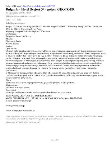 Adres URL strony http://www.eholiday.com.pl/21735 Bułgaria - Hotel Svejest 3* - poleca GEOTOUR ID ogłoszenia: 21735 / 74994 URL: http://www.eholiday.com.pl/21735 Cena: 1 343 PLN Lokalizacja: zagranica Svejest Hotel Bułgaria » Riwiera Bułgarska » Słoneczny Brzeg Cena za 1 osobę: od 1343 do 1703 zł Długość pobytu: 7 dni Wybrany transport: Samolot Wylot z: Warszawa Destynacja: Bulgaria - Sloneczny Brzeg Miasto: Słoneczny Brzeg Nazwa hotelu: Svejest Opis hotelu: Okazały hotel znajduje się w Słonecznym Brzegu, stanowiącym najpopularniejszy kurort czarnomorskiego wybrzeża Bułgarii. Największym atutem znanej miejscowości letniskowej jest bardzo dobrze utrzymana plaża o długości około 8 km i szerokości do 100 metrów. W mieście działa ponad sto hoteli oraz setki restauracji, barów, sklepów i kawiarni. Całe miasto pełne jest zieleni, większość restauracji i kawiarni znajduje się w ocienionych parkach. Atrakcyjnie zlokalizowany hotel Svejest mieści się blisko plaży piaszczystej, tuż obok lokalnego centrum handlowo-rozrywkowego. Do wyposażenia hotelu należą: mieszcząca się w rozległym lobby recepcja z sejfem, restauracja z tarasem, cocktail bar oraz basen na wolnym powietrzu z oddzielną sekcją dla dzieci, tarasem słonecznym i barem. Na terenie hotelu można korzystać z sauny i masaży. Lokalizacja: w Słonecznym Brzegu, 250 m od plaży, 2 km od centrum, 30 km od lotniska, główna ulica przy hotelu, centrum handlowe przy hotelu, 100 m od przystanku komunikacji publicznej, centrum rozrywki przy hotelu, lokalne centrum przy hotelu. Plaża: publiczna, piaszczysta, zagospodarowana, parasole (płatne), leżaki (płatne). Wyżywienie: śniadania w formie bufetu. Opis pokoi: telewizja satelitarna lodówka telefon taras/balkon łazienka z prysznicem. Biuro Podróży GEOTOUR UL. SOBIESKIEGO 8 41-500 CHORZÓW tel/fax: 32 249 14 53, 3460306, 3460307 tel.kom 500-55-66-00 e-mail: [email protected] www.geotour.com.pl www.biletyautobusowe.com.pl Dane kontaktowe: Firma: Geotour województwo: śląskie Chorzów, Sobieskiego 8 telefon: 323460306, 500556600 komunikator GG: 2805753 http://www.geotour.pl [email protected] Aktywacja: 06/05/10 15:05, odsłony: 647 Strona 1 / 1