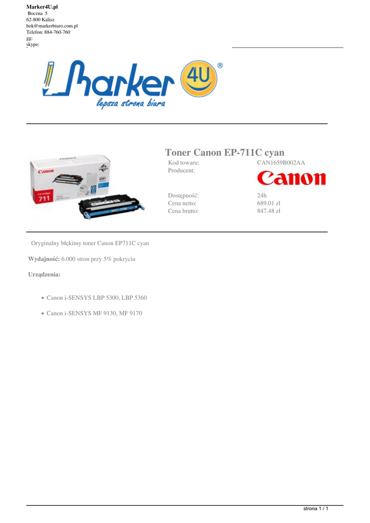 Marker4U.pl Boczna 5 62-800 Kalisz [email protected] Telefon: 884-760-760 gg: skype: Toner Canon EP-711C cyan Kod towaru: Producent: CAN1659B002AA Dostępność: Cena netto: Cena brutto: 24h 689.01 zł 847.48 zł Oryginalny błękitny toner Canon EP711C cyan Wydajność: 6.000 stron przy 5% pokryciu Urządzenia: Canon i-SENSYS LBP 5300, LBP 5360 Canon i-SENSYS MF 9130, MF 9170 strona 1 / 1 Powered by TCPDF (www.tcpdf.org)