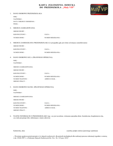 KARTA ZGŁOSZENIA DZIECKA DO PRZEDSZKOLA „Mały VIP” 1. DANE OSOBOWE PRZEDSZKOLAKA IMIĘ – NAZWISKO – DATA I MIEJSCE URODZENIA – PESEL – 2. MIEJSCE ZAMELDOWANIA MIEJSCOWOŚĆ – 3. KOD POCZTOWY – ULICA – NUMER DOMU – NUMER MIESZKANIA – MIEJSCE ZAMIESZKANIA PRZEDSZKOLAKA (w przypadku gdy jest różne od miejsca zameldowania) MIEJSCOWOŚĆ – 4. KOD POCZTOWY – ULICA – NUMER DOMU – NUMER MIESZKANIA – DANE OSOBOWE OJCA (PRAWNEGO OPIEKUNA) IMIĘ – NAZWISKO – MIEJSCE ZAMELDOWANIA: MIEJSCOWOŚĆ – KOD POCZTOWY – ULICA – NUMER DOMU – NUMER MIESZKANIA – NUMER TELEFONU – ADRES E-MAIL – MIEJSCE PRACY – 5. DANE OSOBOWE MATKI (PRAWNEGO OPIEKUNA) IMIĘ – NAZWISKO – MIEJSCE ZAMELDOWANIA: MIEJSCOWOŚĆ – KOD POCZTOWY – ULICA – NUMER DOMU – NUMER MIESZKANIA – NUMER TELEFONU – ADRES E-MAIL – MIEJSCE PRACY – 6. WAŻNE INFORMACJE O PRZEDSZKOLAKU (np.: czy jest uczulone, wskazana specjalna dieta- bezmleczna, bezglutenowa itp., czy stale przyjmuje leki, informacje o stanie zdrowia) Kalinówka, data: czytelny podpis rodzica (prawnego opiekuna) „ Wyrażam zgodę na przetwarzanie w/w danych osobowych dla potrzeb niezbędnych dla realizacji procesu rekrutacji (zgodnie z ustawą z dn. 29.08.1997 r. o Ochronio Danych Osobowych Dz. Ust.. Nr. 133 poz. 833)”.