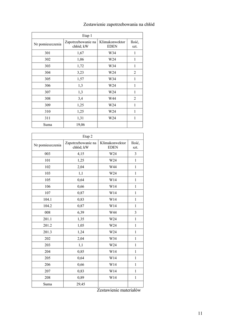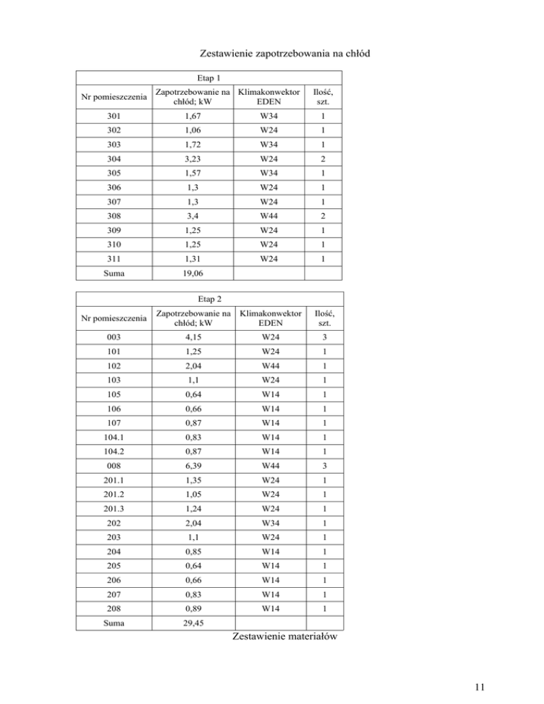 Zestawienie zapotrzebowania na chłód Etap 1 Nr pomieszczenia Zapotrzebowanie na Klimakonwektor chłód; kW EDEN Ilość, szt. 301 1,67 W34 1 302 1,06 W24 1 303 1,72 W34 1 304 3,23 W24 2 305 1,57 W34 1 306 1,3 W24 1 307 1,3 W24 1 308 3,4 W44 2 309 1,25 W24 1 310 1,25 W24 1 311 1,31 W24 1 Suma 19,06 Etap 2 Nr pomieszczenia Zapotrzebowanie na Klimakonwektor chłód; kW EDEN Ilość, szt. 003 4,15 W24 3 101 1,25 W24 1 102 2,04 W44 1 103 1,1 W24 1 105 0,64 W14 1 106 0,66 W14 1 107 0,87 W14 1 104.1 0,83 W14 1 104.2 0,87 W14 1 008 6,39 W44 3 201.1 1,35 W24 1 201.2 1,05 W24 1 201.3 1,24 W24 1 202 2,04 W34 1 203 1,1 W24 1 204 0,85 W14 1 205 0,64 W14 1 206 0,66 W14 1 207 0,83 W14 1 208 0,89 W14 1 Suma 29,45 Zestawienie materiałów 11 Etap 1 ( 2 pietro ) Lp 2.1 Ręczny zawór równoważący z płynną nastawą wstępną, typ MSV-C ze złączkami pomiarowymi. Prod. Danfoss 20 2.2 2.3 2.4 Zawór kulowy typ JFA-149****. Prod. Valvex 20 18 40 4 Złącze metalowe z podwójnym G.Z. prod.Aquatherm 1 ½” G.Z. x 1” G.Z. 4 2” G.Z. x 1 ¼” G.Z. 4 Złącze metalowe z gwintem zewnętrznym i wewnętrzny prod.Aquatherm 2 ¼” G.Z. x 1 ½” G.W. 2.5 2.6 11 4 Łącznik z ruchomą nakrętką wg normy i ISO i DIN 2999 prod.Aquatherm 63mm z nakr. x R2 ¼” 4 50mm z nakr. x R2” 2 Złączka z gwintem zewętrznym dostosowana do płaskiego klucza prod.Aquatherm 20 x ¾” 36 63 x 1 ½” G.Z. 8 12 2.7 2.8 2.9 2.10 2.11 2.12 2.13 2.14 2.15 2.16 Redukcja prod.Aquatherm 63/50 2 63/40 4 40/32 4 40/32 2 32/25 8 40x40x40 2 40x25x40 6 32x32x32 10 32x25x32 4 Trójnik prod.Aquatherm Rura zespolona fusiothem Prod. Aquatherm 20 32,3 25 17 32 12 Kolano 90 st. Prod. Aquatherm 20 15 25 1 25x25x25 12 20x20x20 1 Trójnik prod.Aquatherm Redukcja prod.Aquatherm 25/20 9 32/25 1 Kolano 90 st. Prod. Aquatherm 32 8 63 4 Rura zespolona climatherm-Stabi Glass stabilizowana warstwą z włókna szklanego. Prod. Aquatherm 25×3.5 27,3 32×2.9 50,1 40×3.7 25 63×5.8 12 Klimakonwektory EDEN W24 8 W34 3 W44 2 Agregat wody lodowej firmy Clivet Typ WSAT-EE 91 2.17 1 Zestaw pompowy firmy Clivet Typ GPA-65 1 13 Etap 2 ( parter i 1 pietro ) Lp 1.1 Ręczny zawór równoważący z płynną nastawą wstępną, typ MSV-C ze złączkami pomiarowymi. Prod. Danfoss 1.1.1 15 11 1.1.2 20 6 1.1.3 25 1 1.1.4 32 1 1.2 Zawór kulowy typ JFA-149****. Prod. Valvex 1.2.1 15 11 1.2.1 20 20 1.2.1 32 1 1.2.1 40 12 1.3 1.4 Łącznik z ruchomą nakrętką wg normy i ISO i DIN 2999 prod.Aquatherm 50mm z nakr. x R2” 2 63mm z nakr. x R2” 16 Złączka z gwintem wewnętrznym dostosowana do płaskiego klucza prod.Aquatherm 63 x 2”G.W. 1.5 1.6 Złączka z gwintem zewętrznym dostosowana do płaskiego klucza prod.Aquatherm 16 x ½” 22 20 x ¾” 8 25 x ¾” 2 32 x 1” 2 63 x 1 ½” G.Z. 4 Złącze metalowe z podwójnym G.Z. prod.Aquatherm 2 ¼” G.Z. x 1 ½” G.Z. 1.7 1.9 16 Złącze metalowe z gwintem zewnętrznym i wewnętrznym prod.Aquatherm 2” G.Z. x 1 ¼” G.W. 1.8 2 2 Redukcja prod.Aquatherm 63/50 2 40/32 8 40/25 4 40/20 8 40/16 4 32/25 18 32/20 6 32/16 4 25/20 4 Kolano 90 st. Prod. Aquatherm 14 1.10 1.11 1.12 16 8 20 12 25 6 32 6 40 22 63 26 Filtr siatkowy, typ 4111 0*, oczka siatki 0.4 mm. 40 2 40 1 Zawór zwrotny Pompa obiegowa prod.WILO TOP-S 30/10 1.13 1.14 1.15 1.16 1.17 1 Trójnik prod.Aquatherm 63x40x63 2 63x32x63 2 50x50x50 2 40x40x40 4 40x25x40 2 40x20x40 8 40x16x40 4 32x32x32 16 32x16x32 4 25x25x25 2 Rura zespolona fusiothem Prod. Aquatherm 20 54,2 25 41 Kolano 90 st. Prod. Aquatherm 20 44 25 2 32x25x32 4 25x25x25 16 20x20x20 7 Trójnik prod.Aquatherm Redukcja prod.Aquatherm 25/20 1.18 Prod Herz 25 Rura zespolona climatherm-Stabi Glass stabilizowana warstwą z włókna szklanego. Prod. Aquatherm 16×2.2 16 20×2.8 42 25×3.5 39,2 32×2.9 41,5 15 1.19 1.20 40×3.7 56,5 50×4.6 6 63×5.8 92,4 Klimakonwektory EDEN W14 10 W24 9 W34 1 W44 4 Agregat wody lodowej firmy Clivet Typ WSH-EE 121 1.21 Skraplacz firmy TECNAIR Typ EAL9N 6112 D 1 VENT 1.22 2 Zbiornik buforowy GALMET Poj 200l 1.24 1 Naczynie wzbiorcze firmy Reflex Ng 50 1.23 1 1 Zestaw uzupełniającyt firmy Reflex Typ Fillset 1 16