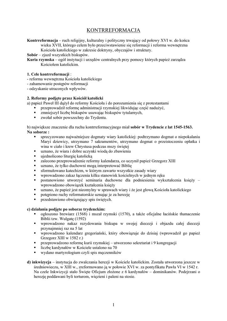 KONTRREFORMACJA Kontrreformacja – ruch religijny, kulturalny i polityczny trwający od połowy XVI w. do końca wieku XVII, którego celem było przeciwstawienie się reformacji i reforma wewnętrzna Kościoła katolickiego w zakresie doktryny, obyczajów i struktury. Sobór – zjazd wszystkich biskupów. Kuria rzymska – ogół instytucji i urzędów centralnych przy pomocy których papież zarządza Kościołem katolickim. 1. Cele kontrreformacji : - reforma wewnętrzna Kościoła katolickiego - zahamowanie postępów reformacji - odzyskanie utraconych wpływów. 2. Reformy podjęte przez Kościół katolicki a) papież Paweł III dążył do reformy Kościoła i do porozumienia się z protestantami przeprowadził reformę administracji rzymskiej likwidując część nadużyć, zmniejszył liczbę biskupów usuwając biskupów tytularnych, zwołał sobór powszechny do Trydentu. b) największe znaczenie dla ruchu kontrreformacyjnego miał sobór w Trydencie z lat 1545-1563. Na soborze : sprecyzowano najważniejsze dogmaty wiary katolickiej: podtrzymano dogmat o niepokalaniu Maryi dziewicy, utrzymano 7 sakramentów, utrzymano dogmat o przeistoczeniu opłatka i wina w ciało i krew Chrystusa podczas mszy świętej uznano, że wiara i dobre uczynki wiodą do zbawienia ujednolicono liturgię katolicką zalecono przeprowadzenie reformy kalendarza, co uczynił papież Grzegorz XIII uznano, że tylko duchowni mogą interpretować Biblię sformułowano katechizm, w którym zawarto wszystkie zasady wiary wprowadzono zakaz łączenia kilku stanowisk kościelnych w jednym ręku postanowiono utworzyć seminaria duchowne dla podniesienia wykształcenia księży – wprowadzono obowiązek kształcenia księży uznano, że papież jest nieomylny w sprawach wiary i że jest głową Kościoła katolickiego potępiono ruchy reformatorskie uznając je za herezję przedstawiono obwiązujący spis świętych. c) działania podjęte po soborze trydenckim: ogłoszono brewiarz (1568) i mszał rzymski (1570), a także oficjalne łacińskie tłumaczenie Biblii tzw. Wulgatę (1592) wprowadzono nakaz rezydowania biskupa w swojej diecezji i objazdu całej diecezji przynajmniej raz na 5 lat wprowadzono kalendarz gregoriański, który obowiązuje do dzisiaj (wprowadził go papież Grzegorz XIII w 1582 r.) przeprowadzono reformę kurii rzymskiej – utworzono sekretariat i 9 kongregacji liczbę kardynałów w Kościele ustalono na 70 wydano martyrologium czyli spis męczenników d) inkwizycja – instytucja do zwalczania herezji w Kościele katolickim. Została utworzona jeszcze w średniowieczu, w XIII w., zreformowano ją w połowie XVI w. za pontyfikatu Pawła VI w 1542 r. Na czele Inkwizycji stało Święte Oficjum złożone z 6 kardynałów – dominikanów. Podejrzani o herezję poddawani byli torturom, więzieni i paleni na stosie. 1 e) Indeks ksiąg zakazanych – w 1559 r. opracowano i przedstawiono spis dzieł, których treść była sprzeczna z naukami Kościoła katolickiego. Książki te zostały zakazane w państwach katolickich. Spis ten powiększano do XX wieku. f) Zakon Towarzystwa Jezusowego – zakon jezuitów. Utworzony w 1534 (1540 r.) przez Ignacego Loyolę. Był to zakon elitarny. Obok zwykłych ślubów zakonnicy składali ślub bezwzględnego posłuszeństwa przełożonym i przysięgę na wierność papieżowi. W zakonie obowiązywała ścisła hierarchia. Jezuici byli doskonale wykształceni. Działalność jezuitów: kaznodzieje i spowiednicy władców chrześcijańskich reforma szkolnictwa – organizacja szkół – kolegiów – na wysokim poziomie nauczania, do których wprowadzono nauki przyrodnicze i humanistyczne w zakresie języków starożytnych i literatury, kładziono głównie nacisk na naukę teologii, łaciny; wprowadzono nową organizację szkół dzieląc klasy według wieku uczniów kształcili własną kadrę wychowawczą w seminariach 2