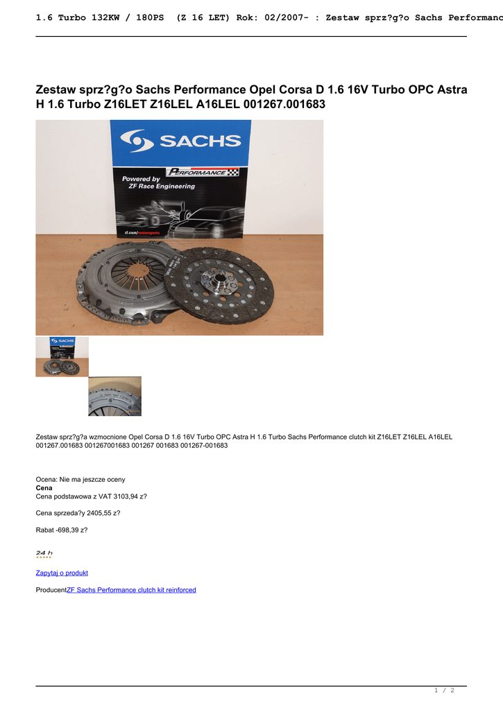 1.6 Turbo 132KW / 180PS (Z 16 LET) Rok: 02/2007- : Zestaw sprz?g?o Sachs Performanc Zestaw sprz?g?o Sachs Performance Opel Corsa D 1.6 16V Turbo OPC Astra H 1.6 Turbo Z16LET Z16LEL A16LEL 001267.001683 Zestaw sprz?g?a wzmocnione Opel Corsa D 1.6 16V Turbo OPC Astra H 1.6 Turbo Sachs Performance clutch kit Z16LET Z16LEL A16LEL 001267.001683 001267001683 001267 001683 001267-001683 Ocena: Nie ma jeszcze oceny Cena Cena podstawowa z VAT 3103,94 z? Cena sprzeda?y 2405,55 z? Rabat -698,39 z? Zapytaj o produkt ProducentZF Sachs Performance clutch kit reinforced 1 / 2 1.6 Turbo 132KW / 180PS (Z 16 LET) Rok: 02/2007- : Zestaw sprz?g?o Sachs Performanc Opis Sachs Race Engineering / Sachs Performance Kupplung clutch kit 001267 001683 bis 520NM mit starrer organischer Kupplungsscheibe 2 / 2 Powered by TCPDF (www.tcpdf.org)