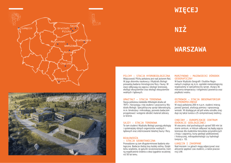 P P P Łukęcin Sajzy Urwitałt Pilchy Murzynowo WIĘCEJ L L L NIŻ Białowieża WARSZAWA WARSZAWA Ostrowik Chęciny Zakopane Pilchy – Stacja Hydrobiologiczna Miejscowość Pilchy położona jest nad jeziorem Roś. W jego zbiorniku naukowcy z Wydziału Biologii prowadzą badania limnologiczne flory i fauny. W stacji odbywają się zajęcia z ekologii terenowej, ekologii ekosystemów oraz ekologii ekosystemów wodnych i lądowych. Murzynowo – Mazowiecki Ośrodek Geograficzny W bazie Wydziału Geografii i Studiów Regionalnych znajduje się m.in. ogródek meteorologiczny wyposażony w specjalistyczny sprzęt, służący do mierzenia temperatury i wilgotności powietrza oraz prędkości wiatru. Urwitałt – Stacja Terenowa Stacja położona niedaleko Mikołajek działa od 1975 r. Korzystają z niej studenci i pracownicy Wydziału Biologii. Specjalistyczny sprzęt laboratoryjny, m.in. binokulary i mikroskopy, pozwala badaczom przygotować i wstępnie obrobić materiał zebrany w terenie. Ostrowik – Stacja Obserwatorium Astronomicznego W stacji położonej 200 m n.p.m. studenci mierzą jasność gwiazd, analizują pomiary i opracowują wnioski. W działającym od pół wieku ośrodku znajduje się także luneta o 25-centymetrowej średnicy. Sajzy – Stacja Terenowa To tam studenci Wydziału Biologii poznają ekologię i systematykę różnych organizmów wodnych i lądowych oraz zróżnicowanie lokalnej fauny i flory. Białowieża – Stacja Geobotaniczna Prowadzone są tam długoterminowe badania ekologiczne. Badacze śledzą losy każdej rośliny. Dzięki temu wiadomo, że gatunki wczesnowiosenne, kwitną współcześnie średnio o dwa tygodnie wcześniej niż 50 lat temu. Chęciny – Europejskie Centrum Edukacji Geologicznej W otoczeniu skał pochodzących sprzed 500 mln lat stanie centrum, w którym odbywać się będą zajęcia terenowe dla studentów kierunków przyrodniczych z kraju i zagranicy, kursy geologii podstawowej i historycznej, mikropaleontologii czy hydrologii (więcej s. 13). ŁUKĘCIN I ZAKOPANE Nad morzem i w górach mogą odpoczywać oraz aktywnie spędzać czas studenci, a także pracownicy UW.