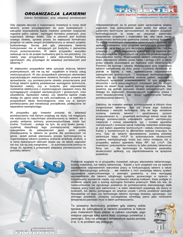 ORGANIZACJA LAKIERNI Zakres formalności, przy adaptacji pomieszczeń Gdy zapada decyzja o rozpoczęciu inwestycji w nowy dział lakierni, przed przystąpieniem do prac budowlanych i zakupów wyposażenia każdy inwestor powinien rozpoznać najpierw pełny zakres wymagań formalno prawnych, przy organizacji takiego działu. Gdy w planach jest budowa nowego obiektu, sprawa prosta, bo większość formalności przejmie na siebie zespól architektoniczny w ramach projektu budowlanego. Gorzej jest gdy planowana lakiernia funkcjonować ma w istniejącym już budynku z pierwotnie innym przeznaczeniem. W takim przypadku wszystko wskazuje na to że projekt budowlany jest tu nie potrzebny. Co należy więc przygotować i jakie dokumenty formalne zgromadzić, aby przystąpić do adaptacji pomieszczeń pod lakiernię ? W większości przypadków takie sytuacje dotyczą lakierni przemysłowych, ale nie są też wyjątkiem w branży usług motoryzacyjnych. W obu przypadkach pierwszym elementem poprzedzającym realizowane działania formalno prawne jest sprawdzenie, czy pomieszczenia obiektu przeznaczane pod funkcję lakierni spełnią podstawowe wymagania techniczne. Sprawdzić należy, czy w budynku jest odpowiednia rozdzielnia elektryczna z wystarczającym zapasem mocy dla wymagających urządzeń wentylacyjnych i grzewczych, oraz oświetlenia. Sprawdzić należy, czy lakiernia będzie miała dostęp do ujęcia wody na cele porządkowe, a w niektórych przypadkach także technologiczne, oraz czy w samym pomieszczeniu jest kanalizacja porządkowa, podłączona do separatora zewnętrznego. W przypadku gdy inwestor posiada do adaptacji pomieszczeniu nad którym znajdują się biura, lub magazyny nie wyklucza to natychmiast zlokalizowaniu tu lakierni, ale z punktu widzenia ochrony przeciwwybuchowej może być trudne. Trudność - polega na tym, że przy braku jasnej i czytelnej klasyfikacji tego pomieszczenia, większość specjalistów ds. zabezpieczeń ppoż. uzna próbę zlokalizowania tu lakierni za groźne dla pomieszczeń na górze. Jeżeli jednak planowany proces technologiczny w organizowanej lakierni poddany zostanie wnikliwej analizie, a w rama dokonanych obliczeń okaże się, że takich zagrożeń nie ma, lub są one marginalne … to automatycznie otworzy to drogę do zgodnej z przepisami adaptacji pomieszczenia na potrzeby lakierni. Odpowiedzialność za to ponosi autor opracowanej analizy zagrożeń. Gdy jednocześnie autor analiz ma wpływ na parametry techniczne wprowadzanych do lakierni urządzeń technologicznych to może on utrzymać zależności parametrów urządzeni i materiałów tak, aby obok swoje skuteczności technicznej spełnione zostały wymogi formalne. To wybór konkretnych materiałów lakierniczych i sposobu ich aplikacji, pistoletów, oraz urządzeń wentylacyjno grzewczych powoduje, że w ślad za tymi decyzjami, pojawiają się ( lub nie pojawiają ) … strefy zagrożenia wybuchem czy stężenia par lotnych związków organicznych na poziomie przekraczającym dopuszczalne normy. Wyposażenie lakierni oddziaływuje na teren zewnętrzny obiektu przez hałas i emisję LZO, a także przez odpady pozostające po realizacji cykli lakierniczych. Pomimo, że wymogi i zasady obowiązujące przy organizacji lakierni natryskowej są dość jasno i czytelnie określone, to jednak w każdej z nich, wprowadzanie odpowiednich zabezpieczeń technicznych i rozwiązań technologicznych odbywa się po indywidualnej analizie zadań, zagrożeń i możliwych sposobów przeciwdziałania. W tym przypadku ekonomia i cena poszczególnych rozwiązań jest na drugim planie bo obiekt musi spełnić wymogi bezpieczeństwa. Nie powinno się jednak posuwać działań prewencyjnych zbyt dlatego bo większość obowiązujących przepisów prawa i norm bezpieczeństwa i tak dosyć rygorystycznie traktuje pomieszczenia lakierni. Załóżmy, że inwestor wskaże pomieszczenie w którym chce zorganizować lakiernię. Jest już znana jego kubatura lokalizacja i warunki techniczne. Gdy do tego określone zostaną zadania lakierni i spodziewany poziom przepustowości to … projektant technologii dobrać może dla takiego pomieszczenia odpowiedni system wentylacyjny natężenie i rodzaj oświetlenia, typ i modele aparatów natryskowych i wreszcie same materiały malarskie dobierając je pod kątem aspektów technicznych i składu chemicznego. Każdy z wymienionych tu elementów wpływa znacząco na inny. Gdy do lakierni wprowadzone zostaną pistolety lakiernicze klasy HVLP to automatycznie skuteczność systemu wentylacyjnego może być nieco mniejsza niż w przypadku wyboru aparatów klasy RP, lub LVLP. Dla inwestora i pracowników nadzoru to tylko pistolety lakiernicze firmy xxx … dla technologia to konkretne parametry skuteczności aplikacji, czy zapotrzebowania na sprężone powietrze. Podobnie wygląda to w przypadku rozważań zakupu stanowiska lakierniczego, ściany malarskiej, lub kabiny lakierniczej. Każde z tych urządzeń ma za zadanie zapewnienie odpowiednich warunków pracy w funkcjonującej lakierni a także efektu dekoracyjnego pokrycia … ale niektóre z nich posiadają własny system ogrzewania nadmuchiwanego z zewnątrz powietrza, a inne wymagają wprowadzenia dla lakierni odrębnego systemu grzewczego w oparciu o indywidualny wymiennik ciepła, czy możliwości lokalnej kotłowni. Każe podjęte tu działanie oparte jest o szereg wymogów formalno prawnych. Mało kto wie, że nadmuchiwanie nie ogrzanego powietrza do pomieszczenia stanowiącego stałe miejsce pracy ludzi jest zabronione i w wielu lakierniach pojawiają się dziury w ścianach, lub dachu pompujące do wnętrza czyste i zimne powietrze zewnątrz Niezależnie od tego czy technologia lakierni wymaga dostawy ogrzanego, czy zimnego powietrza, przepisy szczegółowe określają jasno jaka minimalna temperatura panować musi w takim pomieszczeniu. To poważny techniczny problem gdy zdamy sobie sprawę że zabrudzone w lakie