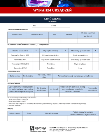 WYNAJEM URZĄDZEŃ ZAMÓWIENIE DLA FIRM NR z dnia DANE WYNAJMUJĄCEGO Nazwa firmy Dokładny adres NIP REGON Wpis do rejestru / ewidencji PRZEDMIOT ZAMÓWIENIA – zaznacz „X” co wybierasz Nazwa urządzenia X Osprzęt darmowy X Materiały spawalnicze Spawarka Bester 151 Uchwyt spawalniczy Drut spawalniczy Powertec 305C Rękawice spawalnicze Elektrody spawalnicze Tecnotig 220 AC/DC Przyłbica Styki prądowe Speedtec 215C Reduktor Inne X TERMIN NAJMU Data najmu Godz. najmu Na okres / ilość dób Adres eksploatacji wynajętego urządzenia UPOWAŻNIENIA Upoważniam poniższą osobę do podpisania umowy najmu i kontaktu w sprawie najmu Nr dowodu osobistego tel. / mail Upoważniam poniższą osobę do podpisania protokołu wydania i odbioru Nr dowodu osobistego W załączeniu przedkładamy dokumenty : 1. Dokument nadania REGON 2. Dokument nadania NIP 3. Aktualny odpis wpisu do ewidencji działalności gospodarczej, rejestru przedsiębiorców lub rejestru sądowego. 4. Dowód osobisty PODPIS Miejscowość Data Pieczęć firmowa Podpis osoby figurującej w dokumentach rejestrowych KARTIKA Artur Załęczny ul. Zwierzyckiego 29, 59-300 Lubin NIP: 692-209-54-89 REGON: 021329264 [email protected]; tel./fax. 76 8400600