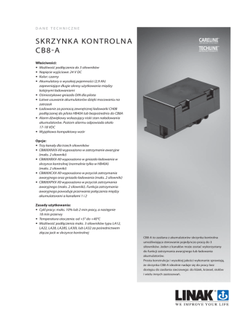 DANE TECHNICZNE SKRZYNKA KONTROLNA CB8-A Właściwości: • Możliwość podłączenia do 3 siłowników • Napięcie wyjściowe: 24 V DC • Kolor: czarny • Akumulatory o wysokiej pojemności (2,9 Ah) zapewniające długie okresy użytkowania między kolejnymi ładowaniami • Ośmiostykowe gniazdo DIN dla pilota • Łatwe usuwanie akumulatorów dzięki mocowaniu na zatrzask • Ładowanie za pomocą zewnętrznej ładowarki CH08 podłączanej do pilota HB40A lub bezpośrednio do CB8A • Alarm dźwiękowy wskazujący niski stan naładowania akumulatorów. Poziom alarmu odpowiada około 17-18 VDC • Wyjątkowo kompaktowy wzór Opcje: • Trzy kanały dla trzech siłowników • CB800XNXX-X0 wyposażono w zatrzymanie awaryjne (maks. 2 siłowniki) • CB800XBXX-X0 wyposażono w gniazdo ładowania w skrzynce kontrolnej (normalnie tylko w HB40A) (maks. 2 siłowniki) • CB800XCXX-X0 wyposażono w przycisk zatrzymania awaryjnego oraz gniazdo ładowania (maks. 2 siłowniki) • CB800XPXX-X0 wyposażono w przycisk zatrzymania awaryjnego (maks. 2 siłowniki). Funkcja zatrzymania awaryjnego powoduje przerwanie połączenia między akumulatorami a kanałami 1 i 2 Zasady użytkowania: • Cykl pracy: maks. 10% lub 2 min pracy, a następnie 18 min przerwy • Temperatura otoczenia: od +5° do +40°C • Możliwość podłączenia maks. 3 siłowników typu LA12, LA22, LA28, LA28S, LA30L lub LA32 za pośrednictwem złącza jack w skrzynce kontrolnej CB8-A to zasilana z akumulatorów skrzynka kontrolna umożliwiająca sterowanie pojedynczo pracą do 3 siłowników. Jeden z kanałów może zostać wykorzystany do funkcji zatrzymania awaryjnego lub ładowania akumulatorów. Prosta konstrukcja i wysokiej jakości wykonanie sprawiają, że skrzynka CB8-A idealnie nadaje się do pracy bez dostępu do zasilania sieciowego: do łóżek, krzeseł, stołów i wielu innych zastosowań. Ważne: System pojedynczego odcinania napięcia: Prąd doprowadzany do każdego siłownika jest monitorowany i odcinany, gdy jego wartość osiąga określony poziom. Z uwagi na fakt, że poszczególne siłowniki odznaczają się różnym poborem prądu, wartości odcięcia muszą także być różne. Dlatego też konieczne jest określenie, który siłownik ma zostać podłączony do danego kanału: TYP LA12, LA22, LA28 LA30.2L LA30.1/2 / LA32.1/2 LA28.S LA30.KL / LA32.K / LA32F WARTOŚĆ ODCIĘCIA (A) 2A (2.35 +/- 0.35 Amp) 3A (3.00 +/- 0.35 Amp) 4A (4.00 +/- 0.50 Amp) 5A (5.35 +/- 0.50 Amp) 6A (5.90 +/- 0.70 Amp) Wartości w nawiasach pokazują tolerancje CB8-2A – dla dwóch kanałów Przykładowe zamówienie: CB8 00 2 A 2 3 - 0 0 Stopień IP: 0 = nie określono Kolor: 0 = czarny 1 = szary CH 2: 0 = brak połączenia na K 2 2 = dla LA28.1/2; LA12; LA22 (2 A) 3 = dla LA30.2L (3 A) 4 = dla LA32.1/2 (4 A) 5 = dla LA28.1/25S (5 A) 6 = dla LA32K (6 A) CH 1: 2 = dla LA28.1/2; LA22 (2 A) 3 = dla LA30.2L (3 A) 4 = dla LA32.1/2 (4 A) 5 = dla LA28.1/25S (5 A) 6 = dla LA32K (6 A) A = montaż z akumulatorami (standard) P = montaż z akumulatorami oraz przyciskiem zatrzymania awaryjnego B = montaż z akumulatorami oraz gniazdem ładowania w CB0800xA C = montaż z akumulatorami, gniazdem ładowania oraz przyciskiem zatrzymania awaryjnego M = miejsce na akumulatory H = miejsce na akumulatory, z przyciskiem zatrzymania awaryjnego Q = miejsce na akumulatory, z gniazdem ładowania w CB0800xA R = miejsce na akumulatory, z gniazdem ładowania oraz przyciskiem zatrzymania awaryjnego Liczba kanałów: 1 = 1 kanał 2 = 2 kanały Możliwy kod spec. Maks. liczba połączeń 1 x LA32K z CB08002A. Ładowarki 110/220/240 V należy zamawiać oddzielnie. Zestaw akumulatorów (BA0801) należy zamawiać oddzielnie dla wersji M, H, Q, R. Maks. siła LA22 mniejsza o ok. 25%. CB8-3A – dla trzech kanałów Przykładowe zamówienie: CB8 00 3 A 2 6 N - 0 0 Stopień IP: 0 = nie określono Kolor: 0 = czarny 1 = szary CH 3 N = miejsce na funkcję zatrzymania awaryjnego 2 = dla LA28.1/2; LA22 (2 A) 3 = dla LA30.2L (3 A) 4 = dla LA32.1/2 (4 A) 5 = dla LA28.1/25S (5 A) 6 = dla LA32K (6 A) CH 2 0 = brak połączenia na K 2 2 = dla LA28.1/2; LA22 (2 A) 3 = dla LA30.2L (3 A) 4 = dla LA32.1/2 (4 A) 5 = dla LA28.1/25S (5 A) 6 = dla LA32K (6 A) CH 1 2 = dla LA28.1/2; LA22 (2 A) 3 = dla LA30.2L (3 A) 4 = dla LA32.1/2 (4 A) 5 = dla LA28.1/25S (5 A) 6 = dla LA32K (6 A) A = montaż z akumulatorami (standard) M = miejsce na akumulatory Liczba kanałów (wersja N maks. 2 kanały) 1 = 1 kanał 2 = zob. na odwrocie strony 3 = 3 kanały Możliwy kod spec. Maks. liczba połączeń 1 x LA32K z CB08003A. Ładowarki 110/220/240 V należy zamawiać oddzielnie. Zestaw akumulatorów należy zamawiać oddzielnie dla wersji M. Maks. siła LA22 mniejsza o ok. 25%. Uwaga: Ładowanie CB83xxx możliwe jest tylko przy wykorzystaniu HB4xA Środki ostrożności dla CB8-2A i CB8-3A: • Uwaga: maksymalny całkowity pobór mocy wynosi 10 A. • Pomiar wykonywany jest oddzielnie dla każdego kanału, ale jeżeli całkowity pobór mocy przekracza 10 A, skrzynka kontrolna odcina dopływ prądu. W ten sposób skrzynka kontrolna oraz siłownik są chronione wspólnym pomiarem. • Ładowarkę należy zamówić oddzielnie • Akumulator BA0801 dla CB8-2A w wersji M, G, H, Q, R oraz CB8-3A w wersji M należy zamawiać oddzielnie. • W CB800XNXX-X0 przed podłączeniem należy zewrzeć kanał 3, aby ładowanie baterii przebiegało prawidłowo. • W CB8-A z przyciskiem zatrzymania awaryjnego przed rozpoczęciem ładowania akumulatorów należy zwolnić przycisk zatrzymania. Wymiary CB8-A z 2 kanałami: CB8-2A 111 Ø 29 Ø 9 +0 0 .2 Wymiary CB8-A z przyciskiem zatrzymania awaryjnego: 68 80 130 6 Ø 5.5 167 6 9 22 179 CB08P001A CB8-3A Warunki Użytkowania Za określenie przydatności produktów firmy LINAK do konkretnych zastosowań odpowiada użytkownik. Firma LINAK dołożyła wszelkich starań, aby dostarczyć dokładne i aktualne informacje o swoich produktach. Z uwagi na ciągły rozwój produkty 