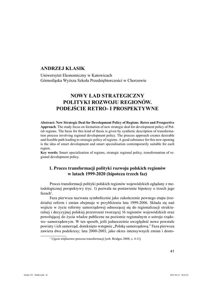ANDRZEJ KLASIK Uniwersytet Ekonomiczny w Katowicach Górnośląska Wyższa Szkoła Przedsiębiorczości w Chorzowie NOWY ŁAD STRATEGICZNY POLITYKI ROZWOJU REGIONÓW. PODEJŚCIE RETRO- I PROSPEKTYWNE Abstract: New Strategic Deal for Development Policy of Regions. Retro and Prospective Approach. The study focus on formation of new strategic deal for development policy of Polish regions. The basis for this kind of thesis is given by synthetic description of transformation process involving regional development policy. The process approach creates desirable and feasible path leading to strategic policy of regions. A good substance for this new opening is the idea of smart development and smart specialisation contemporarily suitable for each region. Key words: Smart specialisation of regions, strategic regional policy, transformation of regional development policy. 1. Proces transformacji polityki rozwoju polskich regionów w latach 1999-2020 (hipoteza trzech faz) Proces transformacji polityki polskich regionów wojewódzkich oglądany z metodologicznej perspektywy (ryc. 1) pozwala na postawienie hipotezy o trzech jego fazach1. Faza pierwsza nazwana symbolicznie jako zakończenie pewnego etapu (rozdziału) reform i zmian obejmuje w przybliżeniu lata 1999-2006. Składa się nań wejście w życie reformy samorządowej odnoszącej się do regionalizacji strukturalnej i decyzyjnej polskiej przestrzeni tworzącej 16 regionów wojewódzkich oraz powołującej do życia władze publiczne na poziomie regionalnym o ustroju rządowo–samorządowym. W ten sposób, jeśli jednocześnie uwzględnić nowo powstałe powiaty i ich samorząd, domknięto wstępnie „Polskę samorządową.” Faza pierwsza zawiera dwa podokresy; lata 2000-2003, jako okres intensywnych zmian i dosto1 Ujęcie trójfazowe procesu transformacji [zob. Bridges 2008, s. 4-11]. 41 Studia 155 - Malik.indd 41 2015-04-12 20:21:25 Ryc. 1. Proces transformacji polityki rozwoju polskich regionów w latach 1999-2020 Źródło: Opracowanie własne z wykorzystaniem idei procesu transformacji [Bridges 2008, s. 5. sowań przygotowujących polskie regiony do zaistnienia w europejskiej przestrzeni oraz okres 2004-2006 eksperymentalnego uczestnictwa polskich regionów w europejskiej polityce regionalnej w ramach krajowej strategii rozwoju regionalnego i zintegrowanego programu operacyjnego. W większości polskich regionów były to pierwsze doświadczenia z wprowadzenia i przyswajania przez praktykę metod (i organizacji procesu) formułowania strategii regionalnych. Były to po części strategie średnio – oraz długoterminowe. Jakość pierwszej edycji strategii regionalnych zależała w dużym stopniu od determinacji i poziomu zorganizowania nowych władz i administracji regionalnej, samorządowej i rządowej, od ułożenia się ich wzajemnych relacji, a przede wszystkim sposobu współdziałania. W równym stopniu jakość pierwszych strategii, sensowność wyznaczonych w nich priorytetów i celów strategicznych oraz ustalenie pierwszej listy „regionalnych” projektów strategicznych miało silny związek ze wsparciem doradczo-eksperckim środowiska akademickiego. W tym okresie głównie silne intelektualnie województwa znalazły oparcie we własnym endogenicznym potencjale naukowo-badawczym. Faza druga nazywana umownie fazą przejścia, swego rodzaju okresem pośrednim, w którym „stare jeszcze nie ustąpiło, a nowe jeszcze nie stało się funkcjonalne”. W tym etapie nastąpiła generalna reorientacja polskich regionów na priorytety europejskiej polityki spójności, za które uznano regionalną konkurencyjność, konwergencję i kooperację regionów. Myśl strategiczna polskich regionów została skupiona na strategiach rozwoju województw i regionalnych programach operacyjnych. Kontynuowane było wdrażanie pierwszych regionalnych strategii innowacji. Ważnym sygnałem fazy przejścia było przygotowanie przez województwa pierwszych strategii w dziedzinie kultury. W orbicie myślenia strategicznego pojawiły się układy subregionalne jako obszary polityki rozwoju regionów. Strategie rozwoju województw sięgały po raz pierwszy horyzontu 2020, natomiast regionalne programy operacyjne zakreślone zostały europejską perspektywą budżetową 2007-2013. Międzyregionalna alokacja środków Europejskiego Funduszu Rozwo42 Studia 155 - Malik.indd 42 2015-04-12 20:21:31 ju Regionalnego spotkała się wówczas z brakiem akceptacji ze strony niektórych województw. Górny Śląsk mimo trwających procesów restrukturyzacyjnych nie uzyskał oczekiwanych preferencji w algorytmie repartycyjnym. Największy sukces święciły województwa Polski Wschodniej, dla których uruchomiono specjalny program operacyjny. Wejście polskich regionów w pierwszy pełny okres programowania wymagał ustanowienia zasad prowadzenia polityki rozwoju (2006) oraz zmiany sfery kompetencyjnej samorządu województwa (2008) z zachowaniem dotychczasowej misji polityki rozwoju. Następowały ważne zmiany poszerzające możliwości i narzędzia realizacyjne koncepcji rozwojowych województw. Na ostatnie lata fazy przejścia polskich regionów przez okres pośredni nałożyły się zjawiska światowego i europejskiego kryzysu finansowego i ekonomicznego. Był to i nadal jest czas, gdy można prawdziwie ocenić stopień odporności regionalnych struktur gospodarczych na zjawiska kryzysowe lub wręcz przeciwnie, stwierdzić ich wysoką podatność na te zjawiska i ustalić kryzysogenny charakter struktur niektórych gospodarek regionalnych. Faza trzecia transformacji polityki rozwoju polskich regionów to etap „nowego otwarcia” obejmujący lata 2014-2020. Ma to być ich rozwój inteligentny, zrównoważony i inkluzyjny [Europa 2020… 2010; New Evidence… 2013]. Nowe podejście do polityki spójnościowej i regionalnej podkreśla fundamentalne znaczenie zintegrowanego podejścia terytorialnego dla praktyki prowadzenia polityki rozwoju regionów i zawie