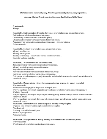 Wartościowanie stanowisk pracy. Przestrzeganie zasady równej płacy w praktyce. Autorzy: Michael Armstrong, Ann Cummins, Sue Hastings, Willie Wood O autorach. Wstęp. Rozdział 1. Najważniejsze kwestie dotyczące wartościowania stanowisk pracy. Definicja wartościowania stanowisk pracy. Cele i cechy wartościowania stanowisk pracy. Obszar zastosowania wartościowania stanowisk pracy. Argumenty za wartościowaniem stanowisk pracy i przeciw niemu. Podsumowanie. Rozdział 2. Metody wartościowania stanowisk pracy. Metody analityczne. Metody sumaryczne. Zasady konstrukcji i stosowanie metod wartościowania . Kryteria wyboru metody. Rozdział 3. Wartościowanie stanowisk dziś. Zainteresowanie wartościowaniem stanowisk pracy. Metody wartościowania stanowisk pracy. Kryteria wartościowania. Powody stosowania wartościowania stanowisk pracy. Opinie na temat wartościowania stanowisk pracy. Praktyczne porady dotyczące projektowania, wdrażania i stosowania metod wartościowania stanowisk pracy. Rozdział 4. Zapewnienie równych wynagrodzeń za pracę o tej samej wartości. Wprowadzenie. Prawodawstwo brytyjskie dotyczące równych płac. Wpływ regulacji prawnych na praktykę w zakresie wartościowania stanowisk pracy w Wielkiej Brytanii. Wpływ regulacji prawnych dotyczących równej płacy na konstrukcję metod wartościowania stanowisk pracy. Wpływ regulacji prawnych dotyczących równej płacy na wdrażanie metod wartościowania stanowisk pracy. Rozdział 5. Kontrolowanie przestrzegania zasady równych płac. W jakim celu przeprowadza się kontrolę równych płac. Plan kontroli. Przebieg kontroli równości płac. Analiza wynagrodzeń. Podsumowanie. Rozdział 6. Przygotowanie nowej metody wartościowania stanowisk pracy. Wprowadzenie. Wybór metody wartościowania stanowisk pracy. Przygotowanie planu projektu. Zagadnienie pracy o jednakowej wartości. Plan komunikacji. Harmonogram tworzenia metody. Rozdział 7. Projektowanie metody. Wybór i ustalenie kryteriów. Analiza stanowisk pracy. Testowanie wstępnych kryteriów wartościowania. Ustalenie znaczenia kryteriów i opracowanie modelu punktacji. Przygotowanie do wdrożenia metody. Rozdział 8. Wartościowanie stanowisk z wykorzystaniem komputera. Dwa etapy wartościowania stanowisk pracy. Zastosowanie komputera podczas projektowania metody. Zastosowanie komputerów w procesie wartościowania stanowisk. Rozdział 9. Tworzenie struktury kategorii zaszeregowania stanowisk i tabeli wynagrodzeń. Struktury kategorii zaszeregowania stanowisk i tabele wynagrodzeń. Cel tworzenia struktury kategorii zaszeregowania stanowisk i tabeli wynagrodzeń. Kryteria, jakie powinny spełniać struktury kategorii zaszeregowania stanowisk i tabele wynagrodzeń. Zagadnienia związane z tworzeniem struktur kategorii zaszeregowania stanowisk. Zastosowanie wyników wartościowania stanowisk podczas tworzenia struktury kategorii zaszeregowania stanowisk Tworzenie tabeli wynagrodzeń Zasada równej płacy. Podsumowanie. Rozdział 10. Przeprowadzenie wartościowania stanowisk. Plan wdrożenia. Komunikacja. Podręcznik operacyjny. Szkolenia. Ustalenie harmonogramu wartościowania stanowisk. Wartościowanie stanowisk. Kontrola wyników. Ujawnienie wyników. Kontrola wyceny stanowiska lub jego zaszeregowania . Ostateczne ustalenie przedziałów płacowych wynagrodzeń. Asymilacja i ochrona płac. Zasada pracy o równej wartości. Rozdział 11. Zarządzanie wartościowaniem stanowisk. Coroczne badanie wyceny i zaszeregowania stanowisk. Praktyczne porady dotyczące zarządzania wartościowaniem stanowisk pracy. Załącznik 1. Metoda wartościowania stanowisk zgodna z zasadą pracy o równej wartości: kryteria wartościowania stanowisk opracowane dla krajowej rady brytyjskich samorządów lokalnych National Joint Council (NJC). Załącznik 2. Przykładowa polityka równych płac opracowana przez Komisję Równych Szans. Załącznik 3. Czynniki powstawania różnic w wynagrodzeniach i działania naprawcze. Załącznik 4. Przestrzeganie zasady pracy o równej wartości podczas opracowywania metody wartościowania stanowisk. Załącznik 5. Ilustracja techniki tworzenia "stosów" stanowisk. Załącznik 6. Przykłady kryteriów wartościowania stanowisk. Załącznik 7a. Przykład profilu roli 1. Załącznik 7b. Przykład profilu roli 2. Załącznik 8. Metoda wartościowania stanowisk Stowarzyszenia Uczelni Wyższych (Association of Colleges). Indeks