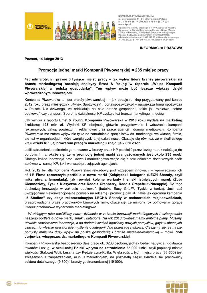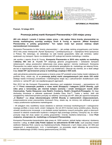 INFORMACJA PRASOWA Poznań, 14 lutego 2013 Promocja jednej marki Kompanii Piwowarskiej = 235 miejsc pracy 493 mln złotych i prawie 3 tysiące miejsc pracy – tak wpływ lidera branży piwowarskiej na branżę marketingową oceniają analitycy Ernst & Young w raporcie „Wkład Kompanii Piwowarskiej w polską gospodarkę”. Ten wpływ może być jeszcze większy dzięki wprowadzonym innowacjom. Kompania Piwowarska to lider branży piwowarskiej i – jak podaje ranking przygotowany pod koniec 2012 roku przez miesięcznik „Rynek Spożywczy” i portalspozywczy.pl – największa firma spożywcza w Polsce. Nic dziwnego, że oddziałuje na całe branże gospodarki, takie jak rolnictwo, sektor opakowań czy transport. Sporo na działalności KP zyskuje też branża marketingu i mediów. Jak wynika z raportu Ernst & Young, Kompania Piwowarska w 2010 roku wydała na marketing i reklamę 493 mln zł. Wydatki KP obejmują głównie przygotowanie i wdrażanie kampanii reklamowych, zakup powierzchni reklamowej oraz pracę agencji i domów mediowych. Kompania Piwowarska ma zatem wpływ nie tylko na zatrudnienie specjalistów ds. marketingu we własnej firmie, ale też w organizacjach, które czerpią zyski z jej działalności. Okazuje się również, że w skali całego kraju dzięki KP i jej browarom pracę w marketingu znajduje 2 830 osób. Jeśli zatrudnienie pośrednie generowane w branży przez KP podzielić przez liczbę marek należącą do portfolio firmy, okaże się, że w promocję jednej marki zaangażowanych jest około 235 osób! Dlatego każda innowacja produktowa i marketingowa wiąże się z zatrudnianiem dodatkowych osób zarówno w samej KP, jak i we współpracujących agencjach. Rok 2012 był dla Kompanii Piwowarskiej rekordowy pod względem innowacji – wprowadzono ich aż 11! Firma rozszerzyła portfolio o nowe marki (Książęce) i kategorie (LECH Shandy, czyli miks piwa z lemoniadą), jak również kolejne warianty i smaki istniejących marek (Żubr Ciemnozłoty, Tyskie Klasyczne oraz Redd’s Cranberry, Redd’s Grapefruit-Pineapple). Do tego dochodzą innowacje w zakresie opakowań (butelka Easy Grip™, Tyskie z tanka). Jeśli zaś uwzględnimy niekonwencjonalne pomysły na reklamę i promocję piw KP, takie jak ogromna kampania „5 Stadion” czy akcja rekomendacyjna LECHA Shandy w nadmorskich miejscowościach, przeprowadzona przez pracowników biurowych firmy, okaże się, że miniony rok obfitował w gorące i wręcz przełomowe wydarzenia marketingowe. – W ubiegłym roku nasililiśmy nasze działania w zakresie innowacji marketingowych i wzbogacenia naszego portfela o nowe marki, smaki i kategorie. Na rok 2013 również mamy ambitne plany. Musimy utrwalić zeszłoroczne innowacje, a na dodatek szukać będziemy nowych pomysłów, gdyż w obecnych czasach to właśnie nowatorskie myślenie o kategorii daje przewagę rynkową. Cieszymy się, że nasze pomysły mają tak duży wpływ na polską gospodarkę i branżę medialno-reklamową – mówi Piotr Jurjewicz, wiceprezes ds. marketingu w Kompanii Piwowarskiej. Kompania Piwowarska bezpośrednio daje pracę ok. 3200 osobom, jednak będąc nabywcą i dostawcą towarów i usług, w skali całej Polski wpływa na zatrudnienie 65 000 ludzi, czyli populacji miasta wielkości Stalowej Woli, Leszna czy Kędzierzyna-Koźla. Większość z tych miejsc pracy (33 300) jest związanych z zaopatrzeniem, m.in. z marketingiem, na pozostałą część składają się pracownicy sektora detalicznego (9 800) i branży gastronomicznej (19 000). Raport „Wkład Kompanii Piwowarskiej w polską gospodarkę” jest częścią badania przeprowadzonego w 2011 roku przez Ernst & Young i Regional Policy Research na zlecenie Grupy SABMiller Europe. Całe badanie dotyczyło znaczenia produkcji i sprzedaży jej piwa. Analizą objęto 10 krajów: Czechy, Węgry, Włochy, Holandię, Polskę, Rumunię, Rosję, Słowację i Wielką Brytanię. Badanie skupiało się na gospodarczym znaczeniu SABMiller w Europie i Rosji, wpływie browarów Grupy na regiony, w których są one zlokalizowane, oraz na polityce w dziedzinie przedsiębiorczości społecznej i zrównoważonego rozwoju. Pełna wersja raportu jest dostępna pod adresem: http://www.kp.pl/documents/article/KP_raport_finansowy_B6.pdf Do redaktora: Kompania Piwowarska – Lider branży piwowarskiej w Polsce Kompania Piwowarska jest największym przedsiębiorstwem piwowarskim w Polsce. Kilkusetletnie doświadczenia w warzeniu piwa, nowoczesne technologie i rygorystyczne przestrzeganie zasad produkcji na światowym poziomie gwarantują najwyższą jakość naszych produktów. Do portfela marek KP należą najpopularniejsze polskie piwa – m.in. Tyskie, Żubr, Lech, Dębowe Mocne, Redd's, a także międzynarodowe marki premium: Pilsner Urquell, Grolsch oraz Peroni Nastro Azzurro. Kompania Piwowarska (utworzona w 1999 roku) posiada trzy browary (w Tychach, Poznaniu i Białymstoku) oraz oddziały handlowe na terenie całego kraju. Kompania Piwowarska prowadzi także działalność społeczną oraz programy edukacyjne popularyzujące odpowiedzialność i umiar w konsumowaniu alkoholu. Wielkość sprzedaży osiągniętej przez KP w roku finansowym zakończonym 31 marca 2012 r. wyniosła 13,5 mln hektolitrów piwa. SABMiller – jeden z największych na świecie producentów piwa Kompania Piwowarska jest częścią jednego z największych na świecie producentów piwa – SABMiller plc. Grupa produkuje lub dystrybuuje piwo na sześciu kontynentach, a jej ogólnoświatowy portfel obejmuje międzynarodowe piwa premium, takie jak Grolsch, Miller Genuine Draft, Peroni Nastro Azzurro czy Pilsner Urquell oraz czołowe marki lokalne, takie jak Aquila, Castle, Miller Lite, Snow czy Tyskie. SABMiller jest jedną z największych na świecie (poza USA) firm rozlewających produkty CocaColi. W roku finansowym zakończonym 31 marca 2012 SABMiller osiągnął przychody w wysokości 31,4 mld USD oraz wypracował