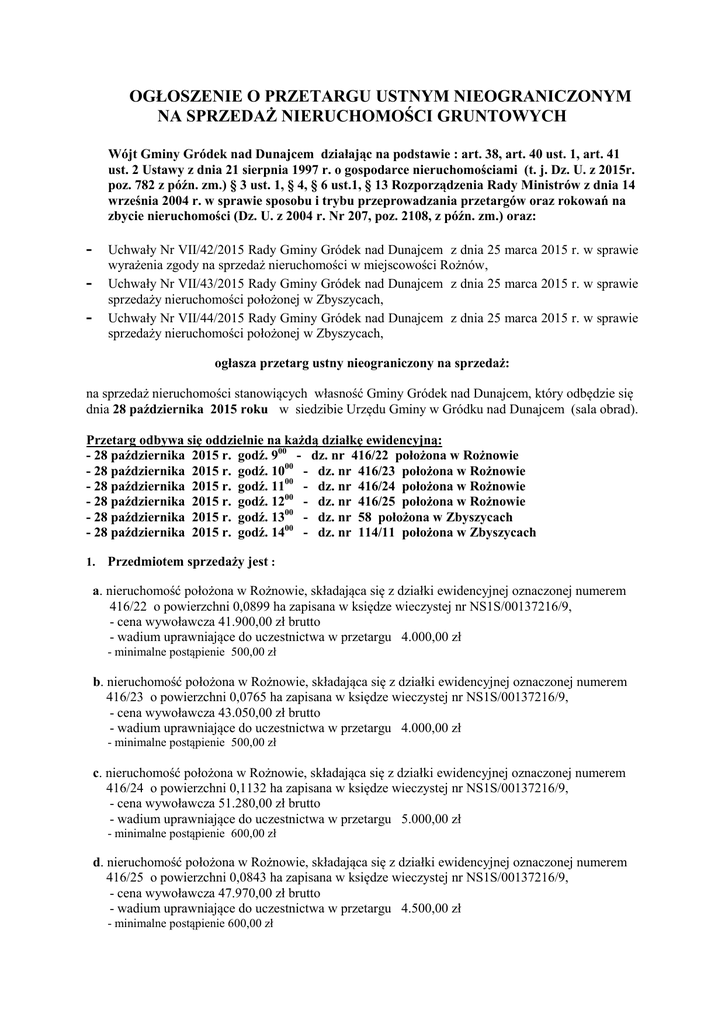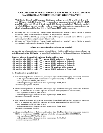 OGŁOSZENIE O PRZETARGU USTNYM NIEOGRANICZONYM NA SPRZEDAŻ NIERUCHOMOŚCI GRUNTOWYCH Wójt Gminy Gródek nad Dunajcem działając na podstawie : art. 38, art. 40 ust. 1, art. 41 ust. 2 Ustawy z dnia 21 sierpnia 1997 r. o gospodarce nieruchomościami (t. j. Dz. U. z 2015r. poz. 782 z późn. zm.) § 3 ust. 1, § 4, § 6 ust.1, § 13 Rozporządzenia Rady Ministrów z dnia 14 września 2004 r. w sprawie sposobu i trybu przeprowadzania przetargów oraz rokowań na zbycie nieruchomości (Dz. U. z 2004 r. Nr 207, poz. 2108, z późn. zm.) oraz: Uchwały Nr VII/42/2015 Rady Gminy Gródek nad Dunajcem z dnia 25 marca 2015 r. w sprawie wyrażenia zgody na sprzedaż nieruchomości w miejscowości Rożnów, Uchwały Nr VII/43/2015 Rady Gminy Gródek nad Dunajcem z dnia 25 marca 2015 r. w sprawie sprzedaży nieruchomości położonej w Zbyszycach, Uchwały Nr VII/44/2015 Rady Gminy Gródek nad Dunajcem z dnia 25 marca 2015 r. w sprawie sprzedaży nieruchomości położonej w Zbyszycach, ogłasza przetarg ustny nieograniczony na sprzedaż: na sprzedaż nieruchomości stanowiących własność Gminy Gródek nad Dunajcem, który odbędzie się dnia 28 października 2015 roku w siedzibie Urzędu Gminy w Gródku nad Dunajcem (sala obrad). Przetarg odbywa się oddzielnie na każdą działkę ewidencyjną: - 28 października 2015 r. godź. 900 - dz. nr 416/22 położona w Rożnowie - 28 października 2015 r. godź. 1000 - dz. nr 416/23 położona w Rożnowie - 28 października 2015 r. godź. 1100 - dz. nr 416/24 położona w Rożnowie - 28 października 2015 r. godź. 1200 - dz. nr 416/25 położona w Rożnowie - 28 października 2015 r. godź. 1300 - dz. nr 58 położona w Zbyszycach - 28 października 2015 r. godź. 1400 - dz. nr 114/11 położona w Zbyszycach 1. Przedmiotem sprzedaży jest : a. nieruchomość położona w Rożnowie, składająca się z działki ewidencyjnej oznaczonej numerem 416/22 o powierzchni 0,0899 ha zapisana w księdze wieczystej nr NS1S/00137216/9, - cena wywoławcza 41.900,00 zł brutto - wadium uprawniające do uczestnictwa w przetargu 4.000,00 zł - minimalne postąpienie 500,00 zł b. nieruchomość położona w Rożnowie, składająca się z działki ewidencyjnej oznaczonej numerem 416/23 o powierzchni 0,0765 ha zapisana w księdze wieczystej nr NS1S/00137216/9, - cena wywoławcza 43.050,00 zł brutto - wadium uprawniające do uczestnictwa w przetargu 4.000,00 zł - minimalne postąpienie 500,00 zł c. nieruchomość położona w Rożnowie, składająca się z działki ewidencyjnej oznaczonej numerem 416/24 o powierzchni 0,1132 ha zapisana w księdze wieczystej nr NS1S/00137216/9, - cena wywoławcza 51.280,00 zł brutto - wadium uprawniające do uczestnictwa w przetargu 5.000,00 zł - minimalne postąpienie 600,00 zł d. nieruchomość położona w Rożnowie, składająca się z działki ewidencyjnej oznaczonej numerem 416/25 o powierzchni 0,0843 ha zapisana w księdze wieczystej nr NS1S/00137216/9, - cena wywoławcza 47.970,00 zł brutto - wadium uprawniające do uczestnictwa w przetargu 4.500,00 zł - minimalne postąpienie 600,00 zł e. nieruchomość położona w Zbyszycach, składająca się z działki ewidencyjnej oznaczonej numerem 58 o powierzchni 0,12 ha zapisana w księdze wieczystej nr NS1S/00078268/6, - cena wywoławcza 78.720,00 zł brutto - wadium uprawniające do uczestnictwa w przetargu 7.000,00 zł - minimalne postąpienie 800,00 zł f. nieruchomość położona w Zbyszycach, składająca się z działki ewidencyjnej oznaczonej numerem 114/11 o powierzchni 0,3005 ha zapisana w księdze wieczystej nr NS1S/00133670/1, - cena wywoławcza 40.000,00 zł brutto - wadium uprawniające do uczestnictwa w przetargu 4.000,00 zł - minimalne postąpienie 400,00 zł Ustalona cena nabycia nieruchomości nie podlega rozłożeniu na raty. Koszty sporządzenia aktu notarialnego i koszty sądowe ponosi nabywca. 2. Przeznaczenie nieruchomości w planie zagospodarowania przestrzennego: a) działka nr 416/22 - obszar ten w MPZP Gminy Gródek nad Dunajcem przeznaczony jest pod: - częściowo symbol I304MU – tereny koncentracji zabudowy mieszkaniowej jednorodzinnej, zagrodowej oraz usługowej o niskiej intensywności - częściowo I149ZL – tereny zieleni leśnej poza Administracją Lasów Państwowych, Nieruchomość położona na spadzistym stoku opadającym do brzegów Jeziora Rożnowskiego. Położona w odległości od drogi powiatowej ok. 400m, od jeziora 600m, od centrum wsi ok. 2,5 km b) działka nr 416/23 - obszar ten w MPZP Gminy Gródek nad Dunajcem przeznaczony jest pod: - I304MU – tereny koncentracji zabudowy mieszkaniowej jednorodzinnej, zagrodowej oraz usługowej o niskiej intensywności Nieruchomość położona na spadzistym stoku opadającym do brzegów Jeziora Rożnowskiego. Położona w odległości od drogi powiatowej ok. 400m, od jeziora 600m, od centrum wsi ok. 2,5 km c) działka nr 416/24 - obszar ten w MPZP Gminy Gródek nad Dunajcem przeznaczony jest pod: - częściowo I304MU – tereny koncentracji zabudowy mieszkaniowej jednorodzinnej, zagrodowej oraz usługowej o niskiej intensywności - częściowo I149ZL – tereny zieleni leśnej poza Administracją Lasów Państwowych Nieruchomość położona na spadzistym stoku opadającym do brzegów Jeziora Rożnowskiego. Położona w odległości od drogi powiatowej ok. 400m, od jeziora 600m, od centrum wsi ok. 2,5 km d) działka nr 416/25 - obszar ten w MPZP Gminy Gródek nad Dunajcem przeznaczony jest pod: - I304MU – tereny koncentracji zabudowy mieszkaniowej jednorodzinnej, zagrodowej oraz usługowej o niskiej intensywności Nieruchomość położona na spadzistym stoku opadającym do brzegów Jeziora Rożnowskiego. Położona w odległości od drogi powiatowej ok. 400m, od jeziora 600m, od centrum wsi ok. 2,5 km e) działka nr 58 - obszar ten w MPZP Gminy Gródek nad Dunajcem przeznaczony jest pod: - L4UK-OS – wydzielone tereny usług publicznych – kultury. Nieruchomość położona przy drodze