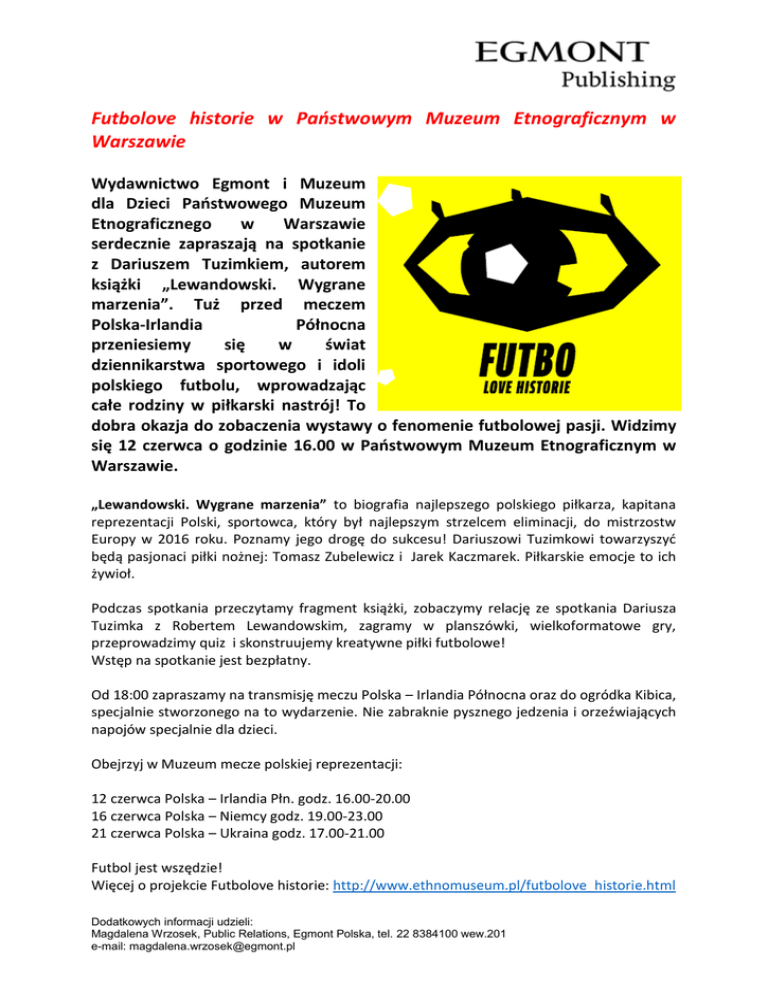 Futbolove historie w Państwowym Muzeum Etnograficznym w Warszawie Wydawnictwo Egmont i Muzeum dla Dzieci Państwowego Muzeum Etnograficznego w Warszawie serdecznie zapraszają na spotkanie z Dariuszem Tuzimkiem, autorem książki „Lewandowski. Wygrane marzenia”. Tuż przed meczem Polska-Irlandia Północna przeniesiemy się w świat dziennikarstwa sportowego i idoli polskiego futbolu, wprowadzając całe rodziny w piłkarski nastrój! To dobra okazja do zobaczenia wystawy o fenomenie futbolowej pasji. Widzimy się 12 czerwca o godzinie 16.00 w Państwowym Muzeum Etnograficznym w Warszawie. „Lewandowski. Wygrane marzenia” to biografia najlepszego polskiego piłkarza, kapitana reprezentacji Polski, sportowca, który był najlepszym strzelcem eliminacji, do mistrzostw Europy w 2016 roku. Poznamy jego drogę do sukcesu! Dariuszowi Tuzimkowi towarzyszyć będą pasjonaci piłki nożnej: Tomasz Zubelewicz i Jarek Kaczmarek. Piłkarskie emocje to ich żywioł. Podczas spotkania przeczytamy fragment książki, zobaczymy relację ze spotkania Dariusza Tuzimka z Robertem Lewandowskim, zagramy w planszówki, wielkoformatowe gry, przeprowadzimy quiz i skonstruujemy kreatywne piłki futbolowe! Wstęp na spotkanie jest bezpłatny. Od 18:00 zapraszamy na transmisję meczu Polska – Irlandia Północna oraz do ogródka Kibica, specjalnie stworzonego na to wydarzenie. Nie zabraknie pysznego jedzenia i orzeźwiających napojów specjalnie dla dzieci. Obejrzyj w Muzeum mecze polskiej reprezentacji: 12 czerwca Polska – Irlandia Płn. godz. 16.00-20.00 16 czerwca Polska – Niemcy godz. 19.00-23.00 21 czerwca Polska – Ukraina godz. 17.00-21.00 Futbol jest wszędzie! Więcej o projekcie Futbolove historie: http://www.ethnomuseum.pl/futbolove_historie.html Dodatkowych informacji udzieli: Magdalena Wrzosek, Public Relations, Egmont Polska, tel. 22 8384100 wew.201 e-mail: [email protected] O autorze: Dariusz Tuzimek, dziennikarz prasowy i telewizyjny oraz znany felietonista. Zdobywca „Piłkarskiego Oskara” dla najlepszego dziennikarza prasowego w 2006 roku. Publikował m.in. na łamach „Przeglądu Sportowego”, „Polska – The Times” i „Gazety Wyborczej”. Kibice znają go z relacji sportowych dla TVP, Canal Plus, TVN, TVN24 oraz nSport. Obecnie jest związany z Wirtualną Polską i portalem Futbolfejs.pl. Futbol to jego pasja, a drużyna biało-czerwonych była jego pierwszą miłością. W wolnych chwilach jest kapitanem Piłkarskiej Reprezentacji Dziennikarzy. Z prawdziwą przyjemnością kopie też piłkę z własnym synem. Z Robertem Lewandowskim o piłce przegadali wiele godzin, nie tylko przy okazji oficjalnych wywiadów. Te rozmowy – prowadzone przez kilka lat dziennikarskiej roboty – pomogły mu dobrze poznać najlepszego polskiego piłkarza. I lepiej przedstawić go w książce najmłodszym kibicom Roberta. Lewandowski. Wygrane marzenia Autor: Dariusz Tuzimek Ilość stron: 208 stron Oprawa flexi Wielkość: 70 x 240 Cena: 29,99 zł Data premiery: 18 maja 2016 Do tej pory w serii piłkarskiej „Mali mistrzowie” ukazały się: MESSI. Mały chłopiec, który stał się wielkim piłkarzem, książka która zdobyła tytuł Najlepszej Książki Dziecięcej 2014 roku w konkursie „Przecinek i kropka”. Ronaldo. Chłopiec, który wiedział, czego chce Ibra. Chłopak, który odnalazł własną drogę Seria przez wiele tygodni królowała na listach bestsellerów, a prawa do niej zostały sprzedane już do 7 krajów. Dodatkowych informacji udzieli: Magdalena Wrzosek, Public Relations, Egmont Polska, tel. 22 8384100 wew.201 e-mail: [email protected]