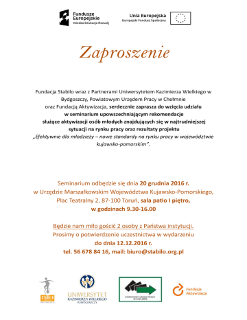 Zaproszenie 694; NIP: 527-13-11-973; REGON: 006229672 Fundacja Stabilo wraz z Partnerami Uniwersytetem Kazimierza Wielkiego w Bydgoszczy, Powiatowym Urzędem Pracy w Chełmnie oraz Fundacją Aktywizacja, serdecznie zaprasza do wzięcia udziału w seminarium upowszechniającym rekomendacje służące aktywizacji osób młodych znajdujących się w najtrudniejszej sytuacji na rynku pracy oraz rezultaty projektu „Efektywnie dla młodzieży – nowe standardy na rynku pracy w województwie kujawsko-pomorskim”. Seminarium odbędzie się dnia 20 grudnia 2016 r. w Urzędzie Marszałkowskim Województwa Kujawsko-Pomorskiego, Plac Teatralny 2, 87-100 Toruń, sala patio I piętro, w godzinach 9.30-16.00 Będzie nam miło gościć 2 osoby z Państwa instytucji. Prosimy o potwierdzenie uczestnictwa w wydarzeniu do dnia 12.12.2016 r. tel. 56 678 84 16, mail: [email protected]