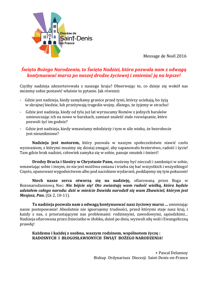 MessagedeNoël2016 ŚwiętaBożegoNarodzenia,toŚwiętaNadziei,którapozwalanamzodwagą kontynuowaćmarszponaszejdrodzeżyciowejizmieniaćjąnalepsze! Czyżby nadzieja zdezerterowała z naszego kraju? Obserwując to, co dzieje się wokół nas możemysobiepostawićwłaśnietopytanie.Jakrównież: ‐Gdziejestnadzieja,kiedyzamykamygraniceprzedtymi,którzyuciekają,bożyją wskrajnejbiedzie,lubprzeżywajątragediewojny,dlatego,żeżyjemywstrachu! ‐Gdziejestnadzieja,kiedyodtylujużlatwyrzucamyRomówzjednychbaraków umieszczającichnanowowbarakach,zamiastznaleźćstalerozwiązanie,które pozwoliżyćimgodnie? ‐Gdziejestnadzieja,kiedywmawiamymłodzieżyitymwsilewieku,żebezrobocie jestnieuniknione? Nadzieja jest motorem, który pozwala w naszym społeczeństwie stawić czoło wyzwaniom,zktórymimusimysiędzisiajzmagać,abyzapanowałobraterstwo,radośćiżycie! Tamgdziebraknadziei,człowiekzamykasięwsobie,panujesmutekiśmierć! DrodzyBraciaiSiostrywChrystusiePanu,możemybyćnieczuliizamknięciwsobie, wmawiającsobieiinnym,żeniejestmożliwazmianaitrzebasiębaćwszystkichiwszystkiego! Często,opanowaniwygodnictwemalbopodnaciskiemwydarzeń,poddajemysiętympokusom! Niech nasze serca otworzą się na nadzieję, ofiarowaną przez Boga w Bożonarodzeniową Noc: Nie bójcie się! Oto zwiastuję wam radość wielką, która będzie udziałemcałegonarodu:dziśwmieścieDawidanarodziłsięwamZbawiciel,którymjest Mesjasz,Pan.(Łk2,10‐11). Tanadziejapozwalanamzodwagąkontynuowaćnaszżyciowymarsz…zmieniając nasze postepowanie! Absolutnie nie ignorujemy trudności, przed którymi staje nasz kraj, i każdy z nas, z przerastającymi nas problemami: rodzinnymi, zawodowymi, sąsiedzkimi… NadziejaofiarowanaprzezDzieciatkowżłobku,dzieńpodniu,wyzwolisiłęwoliiEwangeliczną prawdę! Każdemuikażdejzosobna,waszymrodzinom,wspólnotomżyczę: RADOSNYCHIBŁOGOSŁAWIONYCHŚWIĄTBOŻEGONARODZENIA! +PascalDelannoy BiskupOrdynariuszDiecezjiSaint‐Denis‐en‐France