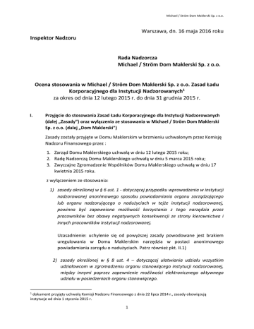 Michael / Ström Dom Maklerski Sp. z o.o. Warszawa, dn. 16 maja 2016 roku Inspektor Nadzoru Rada Nadzorcza Michael / Ström Dom Maklerski Sp. z o.o. Ocena stosowania w Michael / Ström Dom Maklerski Sp. z o.o. Zasad Ładu Korporacyjnego dla Instytucji Nadzorowanych1 za okres od dnia 12 lutego 2015 r. do dnia 31 grudnia 2015 r. I. Przyjęcie do stosowania Zasad Ładu Korporacyjnego dla Instytucji Nadzorowanych (dalej „Zasady”) oraz wyłączenia ze stosowania w Michael / Ström Dom Maklerski Sp. z o.o. (dalej „Dom Maklerski”) Zasady zostały przyjęte w Domu Maklerskim w brzmieniu uchwalonym przez Komisję Nadzoru Finansowego przez : 1. Zarząd Domu Maklerskiego uchwałą w dniu 12 lutego 2015 roku; 2. Radę Nadzorczą Domu Maklerskiego uchwałą w dniu 5 marca 2015 roku; 3. Zwyczajne Zgromadzenie Wspólników Domu Maklerskiego uchwałą w dniu 17 kwietnia 2015 roku. z wyłączeniem ze stosowania: 1) zasady określonej w § 6 ust. 1 - dotyczącej przypadku wprowadzenia w instytucji nadzorowanej anonimowego sposobu powiadamiania organu zarządzającego lub organu nadzorującego o nadużyciach w tejże instytucji nadzorowanej, powinna być zapewniona możliwość korzystania z tego narzędzia przez pracowników bez obawy negatywnych konsekwencji ze strony kierownictwa i innych pracowników instytucji nadzorowanej. Uzasadnienie: uchylenie się od powyższej zasady powodowane jest brakiem uregulowania w Domu Maklerskim narzędzia w postaci anonimowego powiadamiania zarządu o nadużyciach. Patrz również pkt. II.1) 2) zasady określonej w § 8 ust. 4 – dotyczącej ułatwiania udziału wszystkim udziałowcom w zgromadzeniu organu stanowiącego instytucji nadzorowanej, między innymi poprzez zapewnienie możliwości elektronicznego aktywnego udziału w posiedzeniach organu stanowiącego. 1 dokument przyjęty uchwałą Komisji Nadzoru Finansowego z dnia 22 lipca 2014 r., zasady obowiązują instytucje od dnia 1 stycznia 2015 r. 1 Michael / Ström Dom Maklerski Sp. z o.o. Uzasadnienie: uchylenie się od stosowania tej zasady wynika z faktu, iż dla Domu Maklerskiego byłoby to nadmiernie uciążliwe, gdyż skutkowałoby koniecznością nabycia i utrzymania infrastruktury technicznej umożliwiającej udział na posiedzeniach Zgromadzenia Wspólników oraz z uwagi na fakt, iż wprowadzenie możliwości elektronicznego aktywnego udziału w Zgromadzeniach Wspólników nie jest uzasadnione liczbą udziałowców. Odpowiednie zapewnienie udziału wszystkim udziałowcom aktywnego udziału w Zgromadzeniach Wspólników następuje poprzez zastosowanie procedur określonych w Kodeksie Spółek Handlowych. 3) zasady określonej w § 10 ust. 1 – dotyczącej tego, że udziałowcy nie mogą ingerować w sposób sprawowania zarządu, w tym prowadzenie spraw przez organ zarządzający instytucji nadzorowanej. Uzasadnienie: Główny udziałowiec Domu Maklerskiego pozostaje jednocześnie Prezesem Zarządu. W tym przypadku nie jest możliwe spełnienie przedmiotowej zasady. 4) zasady określonej w § 12 ust. 1 i 2 – zgodnie z ust. 1 udziałowcy odpowiedzialni są za niezwłoczne dokapitalizowanie instytucji nadzorowanej w sytuacji, gdy jest to niezbędne do utrzymania kapitałów własnych instytucji nadzorowanej na poziomie wymaganym przez przepisy prawa lub regulacje nadzorcze, a także gdy wymaga tego bezpieczeństwo instytucji nadzorowanej. Ust. 2 przewiduje odpowiedzialność udziałowców za niezwłoczne dostarczanie instytucji nadzorowanej wsparcia finansowego w sytuacji, gdy jest to niezbędne do utrzymania płynności instytucji nadzorowanej na poziomie wymaganym przez przepisy prawa lub regulacje nadzorcze, a także gdy wymaga tego bezpieczeństwo instytucji nadzorowanej. Uzasadnienie: Przepisy prawa, w szczególności Kodeksu Spółek Handlowych nie nakładają na udziałowców spółki kapitałowej obowiązku dokapitalizowania instytucji nadzorowanej w sytuacji, gdy jest to niezbędne do utrzymania kapitałów własnych instytucji nadzorowanej na poziomie wymaganym przez przepisy prawa lub regulacje nadzorcze, a także gdy wymaga tego bezpieczeństwo instytucji nadzorowanej. Należy zauważyć, że obowiązku udziałowców mogą być nałożone jedynie poprzez ustawę bądź umowę spółki. Zamiana umowy spółki wymaga dwóch trzecich głosów (zgodnie z przepisem art. 246 §1 Kodeksu spółek handlowych) i zgody wszystkich wspólników, których dotyczy zmiana umowy spółki (których świadczenia się zwiększą; zgodnie z art. 246 §3 Kodeksu spółek handlowych ). Bez takiej zgody, na uzyskanie której Dom Maklerski nie ma wpływu, nie będzie możliwe stosowanie przedmiotowej zasady. Jednakże Zarząd Domu Maklerskiego będzie rekomendował udziałowcom aby niezwłocznie dokapitalizowali Spółkę w sytuacji gdy będzie to niezbędne. 2 Michael / Ström Dom Maklerski Sp. z o.o. 5) zasady określonej w § 51 ust. 2 – zgodnie z którą członkowie organu zarządzającego, uwzględniając charakter, skalę i złożoność prowadzonej działalności nie powinni łączyć odpowiedzialności za zarządzanie danym ryzykiem z odpowiedzialnością za obszar działalności generujący to ryzyko. Uzasadnienie: zasada ta nie jest stosowana z uwagi na to, że jeden z członków zarządu wykonuje operacyjnie czynności związane z zarządzaniem ryzykiem w Domu Maklerskim (patrz również pkt. IV) 6) zasad określonych w Rozdziale 9 – dotyczących wykonywania uprawnień z aktywów nabytych na ryzyko klienta. Uzasadnienie: uchylenie się od rozdziału 9 Zasad, wynika z faktu iż Dom Maklerski nie prowadzi działalności w zakresie wykonywania uprawnień z aktywów nabytych na ryzyko klienta. Przyjęcie Zasad w Domu Maklerskim nastąpiło z blisko 1,5 miesięcznym opóźnieniem w stosunku do terminu ustalonego przez Komisję Nadzoru Finansowego. Miało to wpływ na obniżenie oceny BION_2015. II. Rozszerzenia stosowania Zasad W dniu 29 września 2015 r. Zarząd Domu Maklerskiego przyjął wyłąc