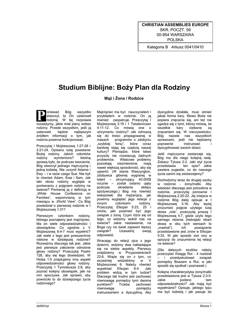 CHRISTIAN ASSEMBLIES EUROPE SKR. POCZT. 59 00-954 WARSZAWA POLSKA Kategoria B Arkusz 0041/0410 Studium Biblijne: Boży Plan dla Rodziny Mąż i Żona / Rodzice P onieważ Bóg wszystko stworzył, to On ustanowił rodzinę. W tej rozprawie rozważymy, jakie miał plany wobec rodziny. Przede wszystkim, jeśli ją ustanowił, będzie najlepszym źródłem informacji o tym, jak rodzina powinna funkcjonować. Przeczytaj I Mojżeszową 1:27-28 i 2:21-24. Opisano tutaj powstanie Bożej rodziny. Jakich członków rodziny wymieniono? Istotną sprawą było, że podczas tworzenia, Bóg stworzył jednego mężczyznę i jedną kobietę. Nie uczynił Adama i Ewy – i w razie czego Sue. Nie byli to również Adam, Ewa i Sam. Jak taki obraz rodziny wygląda w porównaniu z pojęciem rodziny na świecie? Porównaj ją z definicją w „White House Conference on Families”, wspomnianą w tym miesiącu w „World View”. Co Bóg powiedział o pierwszej rodzinie w I Mojżeszowej 1:31? Pierwszym członkiem rodziny, którego poznajemy jest mąż/ojciec. Ma on wiele odpowiedzialności i obowiązków. Co zgodnie z V Mojżeszową 6:4-7 musi wypełnić? Jak wiele z tego jest powszechnie robione w dzisiejszej rodzinie? Rozważmy dlaczego tak jest. Jakie jest pierwsze założenie odnośnie głowy rodziny? Przeczytaj Psalm 128, aby się tego dowiedzieć. W Hioba 1:5 znajdujemy inny aspekt odpowiedzialności głowy rodziny. Przeczytaj 1 Tymoteusza 2:8, aby poznać kolejny obowiązek, jaki na nim spoczywa. Jak sprawić, aby powróciło to do dzisiejszego życia rodzinnego? sb0041pl Mąż/ojciec ma być nauczycielem i przykładem w rodzinie. On ją również zaopatruje. Przeczytaj I Mojżeszową 3:19 i 1 Tesaloniczan 4:11-12. Co mówią one o utrzymaniu rodziny? Jak odnoszą się do treści propagowanej w masach programów o zdobyciu „szybkiej forsy”, które coraz bardziej stają się częścią naszej kultury? Pieniądze, które łatwo przyszły nie rozwiazują żadnych problemów. Właściwe problemy pozostają niezmienione, mają nawet większą sposobność, aby się ujawnić. (W stanie Waszyngton, zdobywca głównej wygranej w loterii – otrzymujący 40.000$ rocznie – został ostanio ujęty podczas okradania sklepu spożywczego.) Bóg ma również wskazówki dla męża/ojca, jak powinny wyglądać jego relacje z innymi członkami rodziny. Przeczytaj Efezjan 5:23, 25 i omów, jaki powinieć być jego związek z żoną. Czym różni się od tego, co widzimy wokół nas na świecie? Jakie nastawienie, na Boga czy na świat zapewni lepszy związek? Uzasadnij swoją odpowiedź. Wracając do relacji ojca z jego dziećmi, widzimy dwa nakładające się na siebie aspekty. Pierwszy znajdziemy w Przypowieściach 22:6. Wiąże się on z tym, co wcześniej widzieliśmy w V Mojżeszowej 6. Należy również wypełniać Efezjan 6:4. Jaki problem widzą w tym ludzie? Dlaczego tak trudno jest zachować równowagę pomiędzy tymi dwoma punktami? Trzeba zachować równowagę pomiędzy instruowaniem a dyscypliną. Aby dyscyplina działała, musi istnieć jakaś forma kary. Słowo Boże nie popiera znęcania się, ani też nie zgadza się z tymi, którzy mówią, że wszelkie kary cielesne są znęcaniem się. W rzeczywistości, Bóg nazwie nas wszystkich oprawcami, jeśli nie będziemy poprawnie instruować i dyscyplinować swoich dzieci. Jeśli mężczyzna zestarzeje się, Bóg ma dla niego kolejną radę. Zobacz Tytusa 2:2. Jaki styl życia przedstawia ten opis? Jakie zawiera sugestie, co do naszego życia zanim się zestarzejemy? Dochodzimy teraz do drugiej osoby w rodzinie - żony/matki. Aby wiedzieć dlaczego jest potrzebna w rodzinie, przeczytaj ponownie I Mojżeszową 2:20-22. Jej miejsce w rodzinie Bóg dalej opisuje w I Mojżeszowej 3:16. Aby lepiej zrozumieć pojęcie użytego tutaj słowa „rola”, przeczytaj proszę I Mojżeszową 4:7, gdzie użyto tego samego rdzenia (hebrajski rdzeń słowa w obu tych wersach to „mashal”). Ich powiązanie przedstawione jest znów w Efezjan 5:33. W jaki sposób stoi ono w opozycji do zrozumienia tej relacji na świecie? (Dla dalszych studiów należy przeczytać Księgę Rut - 4 rozdział – i przedyskutować związek pomiędzy Boazem a Rut, w jaki sposób się spotkali i poznawali.) Kolejna charakterystyka żony/matki przedstawiona jest w Tytusa 2:3-5. Jakie podano tam odpowiedzialności? Jak mają być wypełniane? Opisuje, jakiego typu ma być kobietą i jak pasuje do Strona 1 Kategoria B „STUDIUM BIBLIJNE: BOŻY PLAN DLA RODZINY” dzisiejszego świata. Ten temat rozwinięty został w Przypowieści 31:10-31. Jest to lista osobistych cech idealnej kobiety. Dlaczego dano nam taki opis? Chociaż prawdopodobnie nikt nie mógłby wypełnić tego wszystkiego, z pewnością wyznacza nam cel, do którego powinniśmy zmierzać z pomocą Pana. Dzieci Dzieci w rodzinie są jej członkami i jako takie zostaną omówione w tym studium Biblijnym. Przeczytaj Psalm 127:3-5. Jak są postrzegane w rodzinie zgodnie z tymi wersami? W jaki sposób nasze społeczeństwo reaguje na taką naukę? Każde życie ma dla Boga wartość – od Niego ono pochodzi. Jeśli szanujemy życie, naśladujemy Go. Dzieci mają respektować swoich rodziców. W Łukasza 2:51-52 znajdujemy wspaniały przykład do naśladowania dla nas wszystkich. Dlaczego ten temat lekcji jest taki dobry? Zauważ, że Jezus Chrystus nie tylko perfekcyjnie wypełnił Bożą wolę dla nas, jako dorosłych, ale również dla nas, jako dzieci. Jak można to wykorzystać do nauki dzieci podstawowej lekcji o Bożej przebaczającej łasce? W Piśmie powtarza się oczekiwanie, aby dzieci zachowywały się tak, jak mały Jezus. Przeczytaj Efezjan 6:1-3 i Marka 7:10 dla innych dotyczących tego punktów. II Mojżeszowa 20:12, 21:17 i V Mojżeszowa 5:16 to kolejne wersety, które należy wziąć pod rozwagę. Jak ważne jest, mówi Bóg, aby dzieci z szacunkiem odnosiły się do swoich rodziców? W Biblii znajdujemy synów, którzy