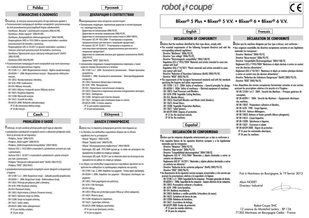Polska Русский OŚWIADCZENIE O ZGODNOŚCI ДЕКЛАРАЦИЯ О СООТВЕТСТВИИ Oświadczyć, że maszyny wyznaczonej przez ich typ wykonane zgodnie z: Нижеприведенные типы аппаратов соответствуют: do nich prawodawstwa poszczególnych krajów członkowskich: - Dyrektywa „Maszyny” z późniejszymi zmianami 2006/42/WE, - Dyrektywa „Niskie napięcie” 2006/95/WE, - Dyrektywa „Kompatybilność elektromagnetyczna” 2004/108/WE, - Rozporządzenie (WE) nr 1935/2004 w sprawie materiałów i wyrobów przeznaczonych do kontaktu z żywnością, - Rozporządzenie (UE) nr 10/2011 w sprawie materiałów i wyrobów z tworzyw sztucznych przeznaczonych do kontaktu z żywnością, - Dyrektywa “Ograniczenie użycia substancji niebezpiecznych” (RoHS) 2002/95/WE, - Dyrektywa DEEE 2002/96/WE. • Postanowieniami następujących norm europejskich oraz norm stanowiących o środkach bezpieczeństwa i higieny: - EN 12100-1 i 2 - 2004: Bezpieczeństwo maszyn - Ogólne zasady koncepcji, - EN 60204-1 - 2006: Bezpieczeństwo maszyn - Wyposażenie elektryczne maszyn, - EN 12852: Wyroby kulinarny i blendery, - EN 1678-1998: Szatkownice, - EN 454: Miksery-mieszarki, - EN 12853: Miksery i trzepaczki ręczne (Miksery ręczne), - EN 14655: Krajalnice bagietek, - EN 13208: Obieraczki warzyw, - EN 13621: Suszarki do sałaty, - EN 60529-2000: Wskaźnik zabezpieczający: - IP 55 dla sterowania elektrycznego, - IP 34 dla maszyn. гос. законодательствам: - Директива по механизмам 2006/42/EC, - Директива по низкому напряжению 2006/95/EC, - Директива по электромагнитной совместимости 2004/108/EC, - Р егламент (ЕС) № 1935/2004 "O материалах и изделиях, предназначенных для контакта с пищевыми продуктами", - Р егламент (ЕС) № 10/2011 "O материалах и изделиях из пластмассовых материалов, предназначенных для контакта с пищевыми продуктами", - Д иректива по снижению опасных для здоровья компонентов (RoHS) 2002/95/CE, - Директива "DEEE" 2002/96/CE, • положениям следующих стандартизированных евронорм, а также норм по технике безопасности и гигиены: - E N 12100-1 и 2 - 2004 : Безопасность механизмов – Общие принципы разработки, - EN 60204-1 - 2006 : Безопасность механизмов – Электорооборудование аппаратов, - EN 12852: Кухонные процессоры и миксеры, - EN 1678- 1998 : Овощерезки, - EN 454 : Сбивательно-смесительные аппараты, - EN 12853: Сбиватели и переносные венчики (погружаемые миксеры), - EN 14655 : Хлеборезки, - EN 13208 : Аппараты для очистки овощей, - EN 13621 : Аппараты для отжимания воды из салата, - EN 60529-2000 : Степень защиты: - IP 55 для кнопок управления, - IP 34 для механизмов. • Postanowieniami następujących dyrektyw europejskich i przystosowanego Czech PROHLÁŠENI O SHODĚ • Положениям следующих Ελληνικά ΔΗΛΩΣΗ ΣΥΜΜΟΡΦΩΣΗΣ Prohlašuje, že výše uvedený přístroje podle jejich typu je odpovídá: Δηλώνει πως το παρακάτω αναφερόμενο μοντελο είναι σύμφωνο με: • požadavkům následujících evropských norem a zákonným předpisům států, • τις διατάξεις των ακόλουθων ευρωπαϊκών οδηγιών και τις εθνικές které je převzaly do své legislativy : - Předpisu „Stroje“ 2006/42/ES - Předpisu „Nízké napětí“ 2006/95/ES - Předpisu „Elektromagnetická kompatibilita“ 2004/108/ES - Nařízení (ES) č. 1935/2004 o materiálech a předmětech určených pro styk s potravinami, - Nařízení (EU) č. 10/2011 o materiálech a předmětech z plastů určených pro styk s potravinami, - Předpisu “Omezování nebezpečných látek” (RoHS) 2002/95/ES, - Předpisu “DEEE” 2002/96/ES • požadavkům harmonizovaných evropských norem týkajících se bezpečnosti a hygieny: - EN 12100-1 a 2 - 2004: Bezpečnost strojů – Základní pravidla projektování, - EN 60204-1 - 2006: Bezpečnost strojů - Elektrovýbava strojů, - EN 12852: Přístroje pro přípravu jídel a blendery, - EN 1678-1998: Krouhače zeleniny, - EN 454: Planetové mixéry, - EN 12853: Ruční mixéry a šlehače (Ponorné mixery), - EN 14655: Nářezové stroje na chleba, - EN 13208: Stroje na loupání zeleniny, - EN 13621: Sušiče salátu, - EN 60529-2000: Index zabezpečovací: - IP 55 pro tlačítka ovládání, - IP 34 pro stroje. Blixer® 5 Plus • Blixer® 5 V.V. • Blixer® 6 • Blixer® 6 V.V. европейских директив и соответсвующим νομοθεσίες που τις μεταφέρουν: - Οδηγία "Μηχανές" 2006/42/EK, - Οδηγία "Χαμηλή τάση" 2006/95/EK, - Οδηγία "Ηλεκτρομαγνητική συμβατότητα" 2004/108/EK, - Κ ανονισμός (ΕΚ) αριθ. 1935/2004 σχετικά με τα υλικά και αντικείμενα που προορίζονται να έρθουν σε επαφή με τρόφιμα, - Κ ανονισμός (ΕΕ) αριθ. 10/2011 για τα πλαστικά υλικά και αντικείμενα που προορίζονται να έρθουν σε επαφή με τρόφιμα, • τις οδηγίες των ακόλουθων εναρ