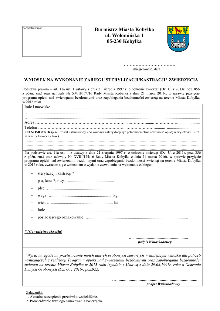 Zarejestrowano: Burmistrz Miasta Kobyłka ul. Wołomińska 1 05-230 Kobyłka ………………………………. miejscowość, data WNIOSEK NA WYKONANIE ZABIEGU STERYLIZACJI/KASTRACJI* ZWIERZĘCIA Podstawa prawna – art. 11a ust. 1 ustawy z dnia 21 sierpnia 1997 r. o ochronie zwierząt (Dz. U. z 2013r. poz. 856 z późn. zm.) oraz uchwały Nr XVIII/174/16 Rady Miasta Kobyłka z dnia 21 marca 2016r. w sprawie przyjęcie programu opieki nad zwierzętami bezdomnymi oraz zapobiegania bezdomności zwierząt na terenie Miasta Kobyłka w 2016 roku. Imię i nazwisko …............................……….…………………………………………………………………. …......................................................................................................................................................................... …......................................................................................................................................................................... Adres ………………………………………………………….....………….......………………...................... Telefon ………………………………………………………...………………….........…................................ PEŁNOMOCNIK (jeżeli został ustanowiony - do wniosku należy dołączyć pełnomocnictwo oraz uiścić opłatę w wysokości 17 zł. za ww. pełnomocnictwo.) ………………………………………………………………………………………………………………………………………… …………………………………………………………………………………………………………………………………………… ……………………………………………………………………………………………………………………………………… Na podstawie art. 11a ust. 1 z ustawy z dnia 21 sierpnia 1997 r. o ochronie zwierząt (Dz. U. z 2013r. poz. 856 z późn. zm.) oraz uchwały Nr XVIII/174/16 Rady Miasta Kobyłka z dnia 21 marca 2016r. w sprawie przyjęcie programu opieki nad zwierzętami bezdomnymi oraz zapobiegania bezdomności zwierząt na terenie Miasta Kobyłka w 2016 roku, zwracam się z wnioskiem o wydanie zezwolenia na wykonanie zabiegu: sterylizacji, kastracji * psa, kota *, rasy …............................................ płeć ….............................................................. waga …............................................................ kg wiek …............................................................. lat imię ….............................................................. posiadającego oznakowanie ….................................................................................................. * Niewłaściwe skreślić …..…...................................................... podpis Wnioskodawcy "Wyrażam zgodę na przetwarzanie moich danych osobowych zawartych w niniejszym wniosku dla potrzeb wynikających z realizacji Programu opieki nad zwierzętami bezdomnymi oraz zapobiegania bezdomności zwierząt na terenie Miasta Kobyłka w 2015 roku (zgodnie z Ustawą z dnia 29.08.1997r. roku o Ochronie Danych Osobowych (Dz. U. z 2016r. poz.922) …......................................................................... podpis Wnioskodawcy Załączniki: 1. Aktualne szczepienie przeciwko wściekliźnie. 2. Potwierdzenie trwałego oznakowania zwierzęcia.