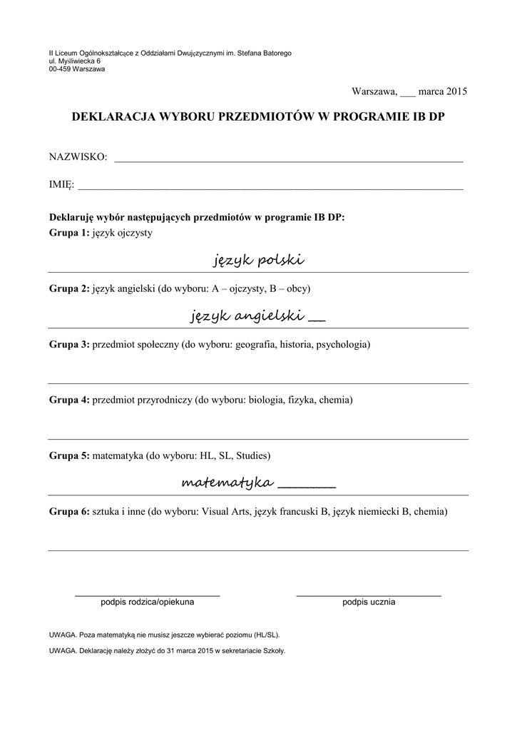 II Liceum Ogólnokształcące z Oddziałami Dwujęzycznymi im. Stefana Batorego ul. Myśliwiecka 6 00-459 Warszawa Warszawa, ___ marca 2015 DEKLARACJA WYBORU PRZEDMIOTÓW W PROGRAMIE IB DP NAZWISKO: ___________________________________________________________________ IMIĘ: __________________________________________________________________________ Deklaruję wybór następujących przedmiotów w programie IB DP: Grupa 1: język ojczysty język polski Grupa 2: język angielski (do wyboru: A – ojczysty, B – obcy) język angielski ___ Grupa 3: przedmiot społeczny (do wyboru: geografia, historia, psychologia) Grupa 4: przedmiot przyrodniczy (do wyboru: biologia, fizyka, chemia) Grupa 5: matematyka (do wyboru: HL, SL, Studies) matematyka __________ Grupa 6: sztuka i inne (do wyboru: Visual Arts, język francuski B, język niemiecki B, chemia) ______________________________ podpis rodzica/opiekuna UWAGA. Poza matematyką nie musisz jeszcze wybierać poziomu (HL/SL). UWAGA. Deklarację należy złożyć do 31 marca 2015 w sekretariacie Szkoły. ______________________________ podpis ucznia