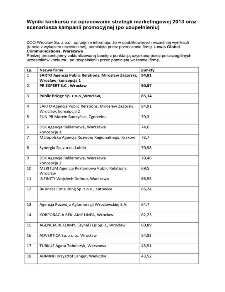 Wyniki konkursu na opracowanie strategii marketingowej 2013 oraz scenariusza kampanii promocyjnej (po uzupełnieniu) ZOO Wrocław Sp. z o.o. uprzejmie informuje, że w opublikowanych wcześniej wynikach (tabela z wykazem uczestników), pominięto przez przeoczenie firmę Lewis Global Communications, Warszawa Poniżej prezentujemy zaktualizowaną tabelę z punktacją uzyskaną przez poszczególnych uczestników konkursu, po uzupełnieniu przez pominiętą wcześniej firmę. Lp. 1 2 Nazwa firmy punkty SARTO Agencja Public Relations, Mirosław Zagórski, 94,81 Wrocław, koncepcja 1 PR EXPERT S.C., Wrocław 90,57 3 Public Bridge Sp. z o.o.,Wrocław, 85,14 4 SARTO Agencja Public Relations, Mirosław Zagórski, Wrocław, koncepcja 2 FUN PR Marcin Budzyński, Zgorzelec 84,91 74,6 7 DSK Agencja Reklamowa, Warszawa koncepcja 1 Małopolska Agencja Rozwoju Regionalnego, Kraków 8 Synergia Sp. z o.o., Lublin 70,98 9 70,46 11 DSK Agencja Reklamowa, Warszawa koncepcja 2 MERITUM Agencja Reklamowa Public Relations, Wrocław INFINITY Wojciech Dołhun, Warszawa 12 Business Consulting Sp. z o.o., Katowice 66,24 13 Agencja Rozwoju Aglomeracji Wrocławskiej S.A. 64,7 14 KORPORACJA REKLAMY LINEA, Wrocław 62,23 15 AGENCJA REKLAMY, Szynal i Lis Sp. J., Wrocław 60,89 16 ADVERTICA Sp. z o.o., Wrocław 54,83 17 TURKUS Agata Tobolczyk, Warszawa 45,51 18 ADMIND Krzysztof Langer, Wieliczka 43,52 5 6 10 79,3 73,7 69,5 66,55 19 AGENCJA PROMOCJI MIAST I REGIONÓW, Kraków 35,09 20 SG24 sp. z o.o., Poznań 32,39 21 Lewis Global Communications, Warszawa 24,2 22 AGORA S.A. o/Wrocław 20,95 23 NEW LOOK ADVERTISING, Warszawa 24 EGZO Group Sp. z o.o., 25 ACZTERY Grzegorz Kaczmarek Praca odrzucona ze względu na brak anonimowości Praca odrzucona ze względu na brak anonimowości Oferent nie został dopuszczony do konkursu na etapie wniosków