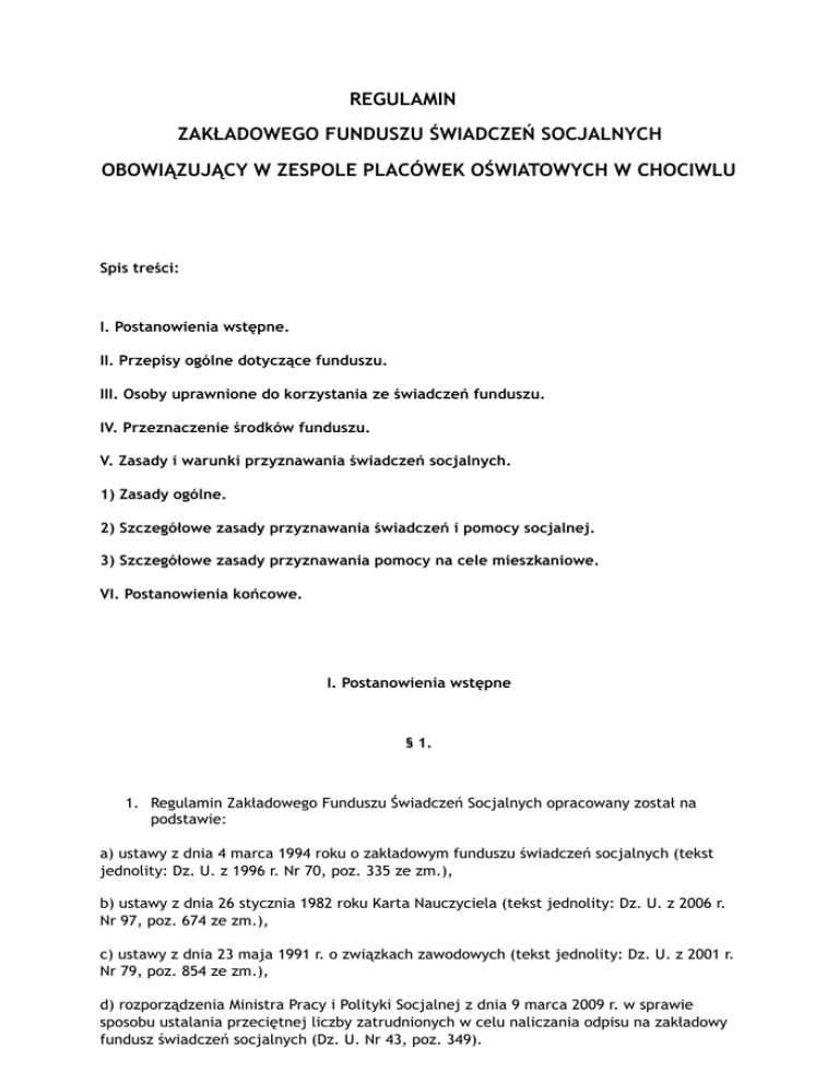 REGULAMIN ZAKŁADOWEGO FUNDUSZU ŚWIADCZEŃ SOCJALNYCH OBOWIĄZUJĄCY W ZESPOLE PLACÓWEK OŚWIATOWYCH W CHOCIWLU Spis treści: I. Postanowienia wstępne. II. Przepisy ogólne dotyczące funduszu. III. Osoby uprawnione do korzystania ze świadczeń funduszu. IV. Przeznaczenie środków funduszu. V. Zasady i warunki przyznawania świadczeń socjalnych. 1) Zasady ogólne. 2) Szczegółowe zasady przyznawania świadczeń i pomocy socjalnej. 3) Szczegółowe zasady przyznawania pomocy na cele mieszkaniowe. VI. Postanowienia końcowe. I. Postanowienia wstępne § 1. 1. Regulamin Zakładowego Funduszu Świadczeń Socjalnych opracowany został na podstawie: a) ustawy z dnia 4 marca 1994 roku o zakładowym funduszu świadczeń socjalnych (tekst jednolity: Dz. U. z 1996 r. Nr 70, poz. 335 ze zm.), b) ustawy z dnia 26 stycznia 1982 roku Karta Nauczyciela (tekst jednolity: Dz. U. z 2006 r. Nr 97, poz. 674 ze zm.), c) ustawy z dnia 23 maja 1991 r. o związkach zawodowych (tekst jednolity: Dz. U. z 2001 r. Nr 79, poz. 854 ze zm.), d) rozporządzenia Ministra Pracy i Polityki Socjalnej z dnia 9 marca 2009 r. w sprawie sposobu ustalania przeciętnej liczby zatrudnionych w celu naliczania odpisu na zakładowy fundusz świadczeń socjalnych (Dz. U. Nr 43, poz. 349). 2. Regulamin określa osoby uprawnione do korzystania z ZFŚS, cele na które mogą być przeznaczone środki funduszu oraz zasady przyznawania świadczeń. § 2. Użyte w regulaminie określenia oznaczają: 1. ZFŚS – Zakładowy Fundusz Świadczeń Socjalnych utworzony, w Zespole Placówek Oświatowych w Chociwlu; 2. Organizacja Związkowa – wszystkie organizacje związkowe działające na terenie Zespole Placówek Oświatowych w Chociwlu; 3. Pracodawca – Dyrektor Zespołu Placówek Oświatowych w Chociwlu 4. Regulamin – niniejszy Regulamin Zakładowego Funduszu Świadczeń Socjalnych Zespole Placówek Oświatowych w Chociwlu; 5. Komisja Socjalna – to zespół powołany przez Pracodawcę i związki zawodowe do uzgodnienia przyznawanych, w oparciu o Regulamin Funduszu, świadczeń socjalnych osobom uprawnionym. 6. Świadczeniobiorca –osoby upoważnione do korzystania z Zakładowego Funduszu Świadczeń Socjalnych w Zespole Placówek Oświatowych w Chociwlu; 7. Pracownik – czynni nauczyciele i pracownicy administracji i obsługi Zespołu Placówek Oświatowych w Chociwlu. § 3. 1. Wysokość odpisów na ZFŚS określają przepisy art. 5 ust 2, 2a, 3 ustawy o ZFŚS oraz art. 53 ust. 1 i 2 Karty Nauczyciela 2. Środki zwiększa się o: a) darowizny oraz zapisy osób fizycznych i prawnych, b) wpływy z oprocentowania pożyczek udzielonych na cele mieszkaniowe, c) wpływ z opłat pobieranych od osób i jednostek organizacyjnych korzystających z działalności socjalnej o której mowa w art. 2 pkt.1 ustawy o zakładowym funduszu świadczeń socjalnych, d) inne środki określone w odrębnych przepisach. § 4. 1. Wszystkie osoby zamierzające korzystać w danym roku kalendarzowym z ulgowych świadczeń, finansowanych ze środków Funduszu, których dochód na osobę nie przekracza 3000 zł, powinny w nieprzekraczalnym terminie do końca kwietnia każdego roku , złożyć informację o sytuacji życiowej, rodzinnej i materialnej w formie PIT za rok ubiegły pracownika i małżonka lub partnera życiowego oraz załącznika nr 3 do niniejszego Regulaminu. Osoby, których dochód przekracza 3000 zł składają oświadczenie w formie załącznika nr 3. 2. Osoba, która nie złożyła informacji wymienionej w ust. 1 lub złożyła ją po terminie, nie będzie mogła w danym roku kalendarzowym korzystać z ulgowych świadczeń finansowanych z Funduszu. W przypadku gdy w złożonej informacji osoba uprawniona do korzystania ze świadczeń Funduszu nie podała dochodów członków rodziny objętych zgodnie z § 7 Regulaminu, opieką socjalną (np. współmałżonka, dziecka itp.) pomoc socjalna dla takiej rodziny będzie ustalana w oparciu o dochody z najwyższego progu dochodowego przewidzianego dla danego świadczenia. 3. Osoba zatrudniona w trakcie roku, tj. po kwietniu, informację wymienioną w ust.1 składa w terminie dwóch miesięcy od daty zatrudnienia. Przepisu ust. 2 stosuje się tu odpowiednio. 4. Do kwietnia danego roku świadczenia są przyznawane w oparciu o informację z roku poprzedniego. 5. Komisja Socjalna rozpatrująca wnioski o przyznanie ulgowego świadczenia finansowanego ze środków Funduszu, w razie powzięcia wątpliwości co do wiarygodności danych przedstawionych w informacji lub we wniosku (zał. Nr 2,3,4 i 6 do Regulaminu ), może zażądać, od składającego taką informację lub wniosek, wszelkich dokumentów potwierdzających te dane (np. aktualnej legitymacji lub zaświadczenia o uczęszczaniu dziecka do szkoły; decyzji o przyznaniu renty, emerytury lub zasiłku – świadczenia przedemerytalnego wraz z ostatnią decyzją waloryzacyjną; postanowienia sądu o rozwodzie bądź separacji; potwierdzonej przez Urząd kopii złożonego zeznania – np. PIT-37, PIT-36, PIT-36L itp.) II. Przepisy ogólne dotyczące ZFŚS § 5. 1. Środkami Zakładowego Funduszu Świadczeń Socjalnych administruje Pracodawca. 2. Środki ZFŚS są gromadzone na odrębnym rachunku. Środki funduszu niewykorzystane w danym roku kalendarzowym przechodzą na rok następny. 3. Dysponentem środków finansowych Zakładowego Funduszu Świadczeń Socjalnych jest Pracodawca, który powołuje Komisję Socjalną do analizowania pisemnych wniosków o świadczenia z ZFŚS i proponowania sposobów zagospodarowania funduszu. 4. Komisję Socjalną tworzą: a) jako przewodniczący – Dyrektor ZPO w Chociwlu (pracodawca), b) jako członkowie – dwóch nauczycieli, księgowa, jeden przedstawiciel każdej organizacji związkowej działającej w ZPO. 5. Na wniosek członka komisji lub z własnej inicjatywy Dyrektor może zmienić skład komisji. § 6. 1. Fundusz tworzy się z corocznego odpisu podstawowego (obowiązkowego), naliczanego w stosunku do 