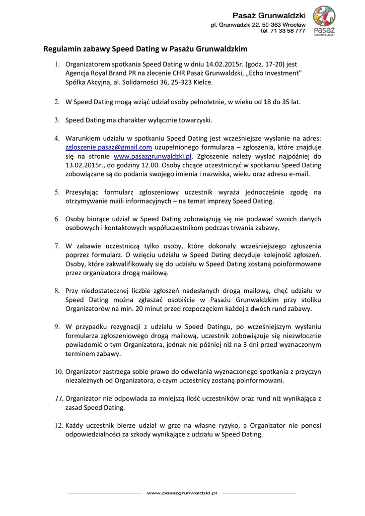 Regulamin zabawy Speed Dating w Pasażu Grunwaldzkim Organizatorem spotkania Speed Dating w dniu 14.02.2015r. (godz. 17-20) jest Agencja Royal Brand PR na zlecenie CHR Pasaż Grunwaldzki, „Echo Investment" Spółka Akcyjna, al. Solidarności 36, 25-323 Kielce. W Speed Dating mogą wziąć udział osoby pełnoletnie, w wieku od 18 do 35 lat. Speed Dating ma charakter wyłącznie towarzyski. Warunkiem udziału w spotkaniu Speed Dating jest wcześniejsze wysłanie na adres: [email protected] uzupełnionego formularza – zgłoszenia, które znajduje się na stronie www.pasazgrunwaldzki.pl. Zgłoszenie należy wysłać najpóźniej do 13.02.2015r., do godziny 12.00. Osoby chcące uczestniczyć w spotkaniu Speed Dating zobowiązane są do podania swojego imienia i nazwiska, wieku oraz adresu e-mail. Przesyłając formularz zgłoszeniowy uczestnik wyraża jednocześnie zgodę na otrzymywanie maili informacyjnych – na temat imprezy Speed Dating. Osoby biorące udział w Speed Dating zobowiązują się nie podawać swoich danych osobowych i kontaktowych współuczestnikom podczas trwania zabawy. W zabawie uczestniczą tylko osoby, które dokonały wcześniejszego zgłoszenia poprzez formularz. O wzięciu udziału w Speed Dating decyduje kolejność zgłoszeń. Osoby, które zakwalifikowały się do udziału w Speed Dating zostaną poinformowane przez organizatora drogą mailową. Przy niedostatecznej liczbie zgłoszeń nadesłanych drogą mailową, chęć udziału w Speed Dating można zgłaszać osobiście w Pasażu Grunwaldzkim przy stoliku Organizatorów na min. 20 minut przed rozpoczęciem każdej z dwóch rund zabawy. W przypadku rezygnacji z udziału w Speed Datingu, po wcześniejszym wysłaniu formularza zgłoszeniowego drogą mailową, uczestnik zobowiązuje się niezwłocznie powiadomić o tym Organizatora, jednak nie później niż na 3 dni przed wyznaczonym terminem zabawy. Organizator zastrzega sobie prawo do odwołania wyznaczonego spotkania z przyczyn niezależnych od Organizatora, o czym uczestnicy zostaną poinformowani. Organizator nie odpowiada za mniejszą ilość uczestników oraz rund niż wynikająca z zasad Speed Dating. Każdy uczestnik bierze udział w grze na własne ryzyko, a Organizator nie ponosi odpowiedzialności za szkody wynikające z udziału w Speed Dating.