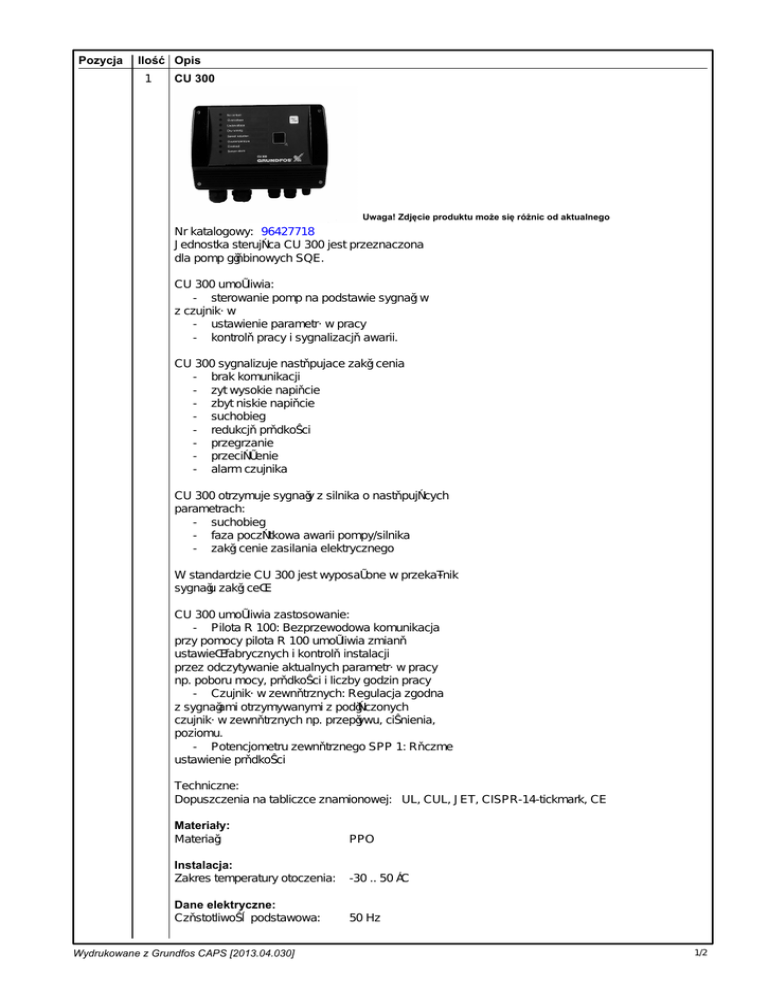 Pozycja Ilość Opis 1 CU 300 Uwaga! Zdjęcie produktu może się różnic od aktualnego Nr katalogowy: 96427718 Jednostka sterująca CU 300 jest przeznaczona dla pomp głębinowych SQE. CU 300 umożliwia: - sterowanie pomp na podstawie sygnałów z czujników - ustawienie parametrów pracy - kontrolę pracy i sygnalizację awarii. CU 300 sygnalizuje następujace zakłócenia - brak komunikacji - zyt wysokie napięcie - zbyt niskie napięcie - suchobieg - redukcję prędkości - przegrzanie - przeciążenie - alarm czujnika CU 300 otrzymuje sygnały z silnika o następujących parametrach: - suchobieg - faza początkowa awarii pompy/silnika - zakłócenie zasilania elektrycznego W standardzie CU 300 jest wyposażone w przekaźnik sygnału zakłóceń. CU 300 umożliwia zastosowanie: - Pilota R 100: Bezprzewodowa komunikacja przy pomocy pilota R 100 umożliwia zmianę ustawień fabrycznych i kontrolę instalacji przez odczytywanie aktualnych parametrów pracy np. poboru mocy, prędkości i liczby godzin pracy - Czujników zewnętrznych: Regulacja zgodna z sygnałami otrzymywanymi z podłączonych czujników zewnętrznych np. przepływu, ciśnienia, poziomu. - Potencjometru zewnętrznego SPP 1: Ręczme ustawienie prędkości Techniczne: Dopuszczenia na tabliczce znamionowej: UL, CUL, JET, CISPR-14-tickmark, CE Materiały: Materiał: PPO Instalacja: Zakres temperatury otoczenia: -30 .. 50 °C Dane elektryczne: Częstotliwość podstawowa: 50 Hz Wydrukowane z Grundfos CAPS [2013.04.030] 1/2 Pozycja Ilość Opis Napięcie nominalne: Prąd znamionowy: Rodzaj ochrony (IEC 34-5): 1 x 100-240 V 130 A IP55 Inne: Masa netto: Język: 2 kg PL Wydrukowane z Grundfos CAPS [2013.04.030] 2/2