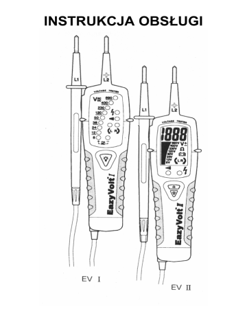INSTRUKCJA OBSŁUGI PROFESJONALNE TESTERY ELEKTRYKA EazyVolt I EazyVolt II NIEAF-SMITT, HOLLAND Gratulujemy zakupu EazyVolt I/II, wysokiej jakości testerów wielofunkcyjnych niezbędnych w pracy każdego elektryka. Gwarantujemy wysoką trwałość i niezawodność testerów. Niezależnie od oznakowania testery EazyVolt I/II posiadają dobrowolny polski znak bezpieczeństwa , potwierdzający w pełni przydatność testera do zastosowań w energetyce w szczególności, co do bezpieczeństwa pomiarów. 1. Bezpieczeństwo Informacje dot. bezpieczeństwa Instrukcja zawiera informacje i wskazówki konieczne do bezpiecznej obsługi i konserwacji testera. Niedostosowanie się do ostrzeżeń i wskazówek zawartych w instrukcji może spowodować uszkodzenie ciała lub śmierć. Aby zapobiec porażeniu prądem elektrycznym, obowiązujące przepisy bezpieczeństwa muszą być traktowane z największą uwagą, szczególnie, kiedy praca jest wykonywana przy napięciach przekraczających 120V (60V) napięcia stałego (DC) lub 50V (25V) napięcia przemiennego (AC). Wartości podane w nawiasach są obowiązujące dla niektórych dziedzin jak np. rolnictwo. Przed przystąpieniem do dowolnego pomiaru, należy upewnić się czy przewody pomiarowe i sam miernik są w dobrym stanie. Podczas używania przyrządu należy dotykać przewidzianych do tego celu rękojeści. We wszystkich przypadkach nie wolno dotykać ostrzy pomiarowych. Jeżeli bezpieczeństwo użytkownika testera nie może być zagwarantowane, tester musi być wyłączny z użytkowania i zabezpieczony przed użyciem. Przed każdym użyciem sprawdź poprawność uzyskiwanych odczytów poprzez np.: pomiar znanego napięcia. Nie wolno podłączać końcówek testera do obwodów, w których napięcie przekracza 690V. Pomiary przy wilgotnych warunkach otoczenia są niedopuszczalne (wilg. Względna >85%) Prawidłowe wskazania przyrządu są zagwarantowane w zakresie temperatur od -10°C do +55°C i przy wilgotności względnej powietrza poniżej 85%. Bezpieczeństwo nie może być już zapewnione z chwilą gdy tester: - wykazuje widoczne uszkodzenia - nie przeprowadza żadnych pomiarów - zbyt długo był przechowywany w niekorzystnych warunkach - został poddany naprężeniom mechanicznym np.: w czasie transportu -3- Wszystkie stosowne zalecenia dotyczące bezpieczeństwa w czasie dokonywania pomiarów muszą być ściśle przestrzegane. Tester nie może być używany, jeżeli jedna lub więcej funkcji testera nie działa, jeśli tester nie działa lub w wypadku, gdy nastąpiło widoczne uszkodzenie testera. Nie wolno używać testera, jeżeli on niewłaściwie lub jest zawilgocony. pracuje Tester należy użytkować zgodnie z danymi technicznymi i warunkami otoczenia zawartymi w tej instrukcji. Muszą być bezwzględnie przestrzegane zalecenia dotyczące bezpieczeństwa. Należy zwrócić szczególną uwagę w czasie pomiarów w sąsiedztwie odizolowanych przewodników. Dotknięcie przewodnika może skutkować porażeniem prądem elektrycznym. Aby uniknąć porażenia prądem elektrycznym, należy zwrócić szczególną uwagę w czasie pomiarów w obwodach, w których napięcie przekracza 60V ACrms lub 110V DC. -4- 2. Symbole i funkcje testera Symbole używane na przyrządzie i w instrukcji obsługi: Niebezpieczeństwo porażenia. Ostrzeżenie o potencjalnym niebezpieczeństwie. Należy przeczytać instrukcję obsługi. + lub – Pomiar +DC lub -DC Sprzęt chroniony przez podwójną lub wzmocnioną izolację. Bateria Uziemienie ± Pomiar napięcia zmiennego (AC) Symbol zgodności z dyrektywami CE Detekcja wysokiego napięcia EV1 Eazy Volt I EV2 Eazy Volt II L1 Ruchoma sonda na przewodzie oznacza „” L2 Sonda ostrzowa przyrządu oznacza „+” Cechy testera: • • • • • • • • • • Pomiar napięcia przemiennego AC i stałego DC Test ciągłości / test diod Pomiar rezystancji (tylko EazyVolt II) Jednobiegunowe testowanie faz Test kierunku wirowania faz w instalacjach 3-fazowych Podświetlenie sondy pomiarowej L2 Odporny na upadek z wys. 1m Stopień ochrony IP64 Funkcja automatycznego wyłączania Możliwość wyboru końcówek 2mm lub 4mm. Dostawa obejmuje: 1 szt. EazyVolt I lub EazyVolt II 2 szt. baterii 1,5V (IEC LR03) Instrukcja obsługi w języku polskim Po rozpakowaniu należy sprawdzić, czy przyrząd nie jest uszkodzony. -5- 3. Pomiar napięcia ACV/DCV 3.1. Pomiar napięcia ACV 3.2. Pomiar napięcia DCV Odwrotna polaryzacja sygnalizowana jest dźwiękiem. UWAGA! Jeżeli tester jest używany w głośnym otoczeniu, należy upewnić się czy dźwięk testera jest słyszalny. -6- 4. Test ciągłości / Test diod 4.1. Test ciągłości UWAGA! Test ciągłości jest możliwy jedynie po zainstalowaniu baterii i ich dobrym stanie. 4.2. Test diod UWAGA! Test diod jest możliwy jedynie po zainstalowaniu baterii i ich dobrym stanie. -7- 5. Pomiar rezystancji Pomiar rezystancji tylko dla EazyVolt II. UWAGA! Pomiar rezystancji jest możliwy jedynie po zainstalowaniu baterii i ich dobrym stanie. 6. Jednobiegunowe testowanie faz UWAGA NIEBEZPIECZEŃSTWO! Podczas testu na ruchomej sondzie pomiarowej występuje napięcie niebezpieczne. Nie wolno dotykać w czasie testu końcówki probierczej ruchomej sondy, gdyż grozi to porażeniem prądem elektrycznym. Należy również unikać zbliżania lub dotykania tą sondą elementów instalacji i innych przedmiotów. UWAGA! Jednobiegunowe testowanie faz jest możliwe jedynie, gdy zainstalowane są dobre baterie. -8- UWAGA! Jednobiegunowe testowanie faz jest niewystarczające do stwierdzenia czy dany obwód znajduje się pod napięciem W tym celu należy zawsze wykonać dwubiegunową próbę napięciową. UWAGA! Przy jednobiegunowym określaniu faz, do oznaczania przewodów zewnętrznych może wystąpić osłabienie pracy wyświetlacza np.: przy stosowaniu izolowanych środków ochrony osobistej lub izolacji stanowiska. UWAGA! Mocny uchwyt rękojeści (patrz rys.) testera zwiększa czułość jedno
