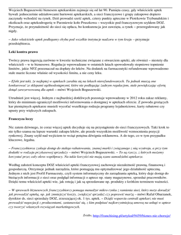 Wojciech Boguszewski biznesem aptekarskim zajmuje się od lat 90. Pamięta czasy, gdy właściciele aptek bywali jednocześnie udziałowcami hurtowni aptekarskich, a sieci franczyzowe i grupy zakupowe dopiero zaczynały wchodzić na rynek. Dziś prowadzi sześć aptek, cztery punkty apteczne w Piotrkowie Trybunalskim i okolicach oraz aptekodrogerię w Parzniewie koło Pruszkowa – wszystkie pod franczyzowym szyldem DOZ. Przyznaje, że przynależność do sieci się opłaca, bo konkurencja jest zawzięta, a rynek – przeregulowany jak nigdy. – Jako właściciele aptek podlegamy chyba pod wszelkie instytucje nadzoru w tym kraju – przyznaje przedsiębiorca. Leki kontra prawo Twórcy prawa ingerują zarówno w kwestie techniczne związane z otwarciem apteki, ale również – niestety dla właścicieli – w te biznesowe. Regulacje wprowadzane w ostatnich latach spowodowały stopniowe topnienie limitów, jakie NFZ przeznaczał na dopłaty do leków. Na dodatek na farmaceutyki refundowane wprowadzono stałe marże liczone właśnie od wysokości limitu, a nie ceny leku. – Efekt jest taki, że najlepiej w aptekach zarabia się na lekach nierefundowanych. Tu jednak muszą one konkurować ze sklepami ogólnodostępnymi, które nie podlegając żadnym regulacjom, stale powiększając ofertę dotąd zarezerwowaną dla aptek – mówi Wojciech Boguszewski. Utrudnień jest więcej. Jednym z najbardziej dotkliwych pozostaje wprowadzony w 2012 roku zakaz reklamy, który do minimum ograniczył możliwości informowania o dostępnej w aptekach ofercie. Z powodu grożących kar pieniężnych aptekarze musieli wycofać wszelkiego rodzaju programy lojalnościowe, karty rabatowe czy upusty przy większych zakupach. Franczyza leczy Nic zatem dziwnego, że coraz więcej aptek decyduje się na przystąpienie do sieci franczyzowych. Taki krok to nie tylko szansa na lepsze warunki zakupu leków, ale przede wszystkim możliwość wzmocnienia pozycji rynkowej. Znany szyld nad wejściem to wciąż potężna dźwignia reklamowa. A do tego, co w tym przypadku kluczowe, legalna. – Franczyzobiorca zyskuje dostęp do stałego rabatowania, znanej marki i związanego z nią wystroju, a przy tym dodatki w rodzaju przykasowej sprzedaży – mówi Wojciech Boguszewski. – To są rzeczy, z których możemy korzystać przez cały okres współpracy. Na takie korzyści nie mają szans samodzielni aptekarze. Według założeń konceptu DOZ właściciel apteki franczyzowej zachowuje niezależność prawną, finansową i gospodarczą. Otrzymuje jednak narzędzia, które pomagają mu optymalizować jego działalność apteczną. Jednym z nich jest Profil Farmaceuty, czyli system informatyczny do zarządzania apteką, który daje dostęp do bieżących informacji z sieci oraz podgląd informacji o aptece np. stany magazynowe, sprzedaż pracowników. Dzięki temu właściciel apteki wie, jak rotują i jak są sprzedawane np. produkty z krótkim terminem ważności. – W sprawach biznesowych franczyzobiorcy pomaga menedżer mikro rynku z ramienia sieci, który może doradzić jak prowadzić aptekę, np. jak zmniejszyć koszty, zwiększyć sprzedaż czy poprawić marżę – mówi Rafał Obarzanek, dyrektor ds. sieci sprzedaży DOZ, zrzeszającej ok. 1 tys. aptek. – Dzięki wsparciu centrali aptekarz nie musi prowadzić negocjacji z producentami, zastanawiać się, z kim podpisać najkorzystniejszą umowę na usługi w aptece czy tworzyć własnych rozwiązań marketingowych. Źródło: Powered by TCPDF (www.tcpdf.org) http://franchising.pl/artykul/9459/biznes-nie-choruje/