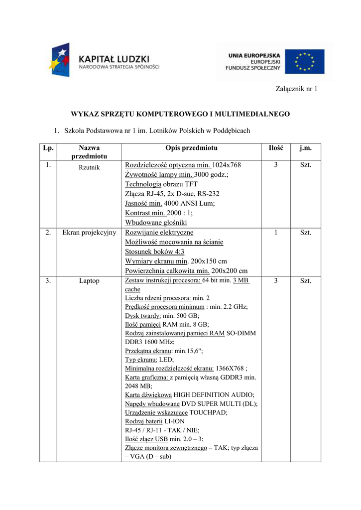 Załącznik nr 1 WYKAZ SPRZĘTU KOMPUTEROWEGO I MULTIMEDIALNEGO 1. Szkoła Podstawowa nr 1 im. Lotników Polskich w Poddębicach Lp. Nazwa przedmiotu 1. Rzutnik 2. Ekran projekcyjny 3. Laptop Ilość j.m. Rozdzielczość optyczna min. 1024x768 Żywotność lampy min. 3000 godz.; Technologia obrazu TFT Złącza RJ-45, 2x D-suc, RS-232 Jasność min. 4000 ANSI Lum; Kontrast min. 2000 : 1; Wbudowane głośniki Rozwijanie elektryczne Możliwość mocowania na ścianie Stosunek boków 4:3 Wymiary ekranu min. 200x150 cm Powierzchnia całkowita min. 200x200 cm 3 Szt. 1 Szt. Zestaw instrukcji procesora: 64 bit min. 3 MB cache Liczba rdzeni procesora: min. 2 Prędkość procesora minimum : min. 2.2 GHz; Dysk twardy: min. 500 GB; Ilość pamięci RAM min. 8 GB; Rodzaj zainstalowanej pamięci RAM SO-DIMM DDR3 1600 MHz; Przekątna ekranu: min.15,6"; Typ ekranu: LED; Minimalna rozdzielczość ekranu: 1366X768 ; Karta graficzna: z pamięcią własną GDDR3 min. 2048 MB; Karta dźwiękowa HIGH DEFINITION AUDIO; Napędy wbudowane DVD SUPER MULTI (DL); Urządzenie wskazujące TOUCHPAD; Rodzaj baterii LI-ION RJ-45 / RJ-11 - TAK / NIE; Ilość złącz USB min. 2.0 – 3; Złącze monitora zewnętrznego – TAK; typ złącza – VGA (D – sub) 3 Szt. Opis przedmiotu Pozostałe złącza: LINE IN, LINE OUT, HDMI; Bezprzewodowa karta sieciowa: – TAK; Typ bezprzewodowej karty sieciowej: min.802.11B/G/N; Bluetooth 3.0 – TAK; Czytnik kart pamięci: – TAK; Przewodowa karta sieciowa RJ - 45 – TAK; Wbudowana kamera: – TAK; System operacyjny: System operacyjny 64 bit kompatybilny z posiadanym pakietem biurowym MICROSOFT OFFICE; Okres gwarancji: 24 miesiące; 2. Szkoła Podstawowa im. Tadeusza Kościuszki w Niemysłowie Lp. 1. Nazwa przedmiotu Laptop Opis przedmiotu Ilość j.m. Zestaw instrukcji procesora: 64 bit min. 6 MB cache Liczba rdzeni procesora: min. 2 Prędkość procesora minimum : min. 2.2 GHz; Dysk twardy: min. 500 GB; Ilość pamięci RAM min. 8 GB; Rodzaj zainstalowanej pamięci RAM SO-DIMM DDR3 1600 MHz; Przekątna ekranu: min.15,6"; Typ ekranu: LED; Minimalna rozdzielczość ekranu: 1366X768 ; Karta graficzna: z pamięcią własną GDDR3 min. 2048 MB; Karta dźwiękowa HIGH DEFINITION AUDIO; Napędy wbudowane DVD SUPER MULTI (DL); Urządzenie wskazujące TOUCHPAD; Rodzaj baterii LI-ION RJ-45 / RJ-11 - TAK / NIE; Ilość złącz USB min. 2.0 – 3; Złącze monitora zewnętrznego – TAK; typ złącza – VGA (D – sub) Pozostałe złącza: LINE IN, LINE OUT, HDMI; Bezprzewodowa karta sieciowa: – TAK; Typ bezprzewodowej karty sieciowej: min.802.11B/G/N; Bluetooth 3.0 – TAK; Czytnik kart pamięci: – TAK; Przewodowa karta sieciowa RJ - 45 – TAK; Wbudowana kamera: – TAK; System operacyjny: 1 Szt. System operacyjny 64 bit kompatybilny z posiadanym pakietem biurowym MICROSOFT OFFICE; Okres gwarancji: 24 miesiące; 3. Szkoła Podstawowa w Bałdrzychowie Lp. 1. Nazwa przedmiotu Laptop Opis przedmiotu Ilość j.m. Zestaw instrukcji procesora: 64 bit min. 6 MB cache Liczba rdzeni procesora: min. 2 Prędkość procesora minimum : min. 2.2 GHz; Dysk twardy: min. 500 GB; Ilość pamięci RAM min. 8 GB; Rodzaj zainstalowanej pamięci RAM SO-DIMM DDR3 1600 MHz; Przekątna ekranu: min.15,6"; Typ ekranu: LED; Minimalna rozdzielczość ekranu: 1366X768 ; Karta graficzna: z pamięcią własną GDDR3 min. 2048 MB; Karta dźwiękowa HIGH DEFINITION AUDIO; Napędy wbudowane DVD SUPER MULTI (DL); Urządzenie wskazujące TOUCHPAD; Rodzaj baterii LI-ION RJ-45 / RJ-11 - TAK / NIE; Ilość złącz USB min. 2.0 – 3; Złącze monitora zewnętrznego – TAK; typ złącza – VGA (D – sub) Pozostałe złącza: LINE IN, LINE OUT, HDMI; Bezprzewodowa karta sieciowa: – TAK; Typ bezprzewodowej karty sieciowej: min.802.11B/G/N; Bluetooth 3.0 – TAK; Czytnik kart pamięci: – TAK; Przewodowa karta sieciowa RJ - 45 – TAK; Wbudowana kamera: – TAK; System operacyjny: System operacyjny 64 bit kompatybilny z posiadanym pakietem biurowym MICROSOFT OFFICE; 1 Szt. Okres gwarancji: 24 miesiące;